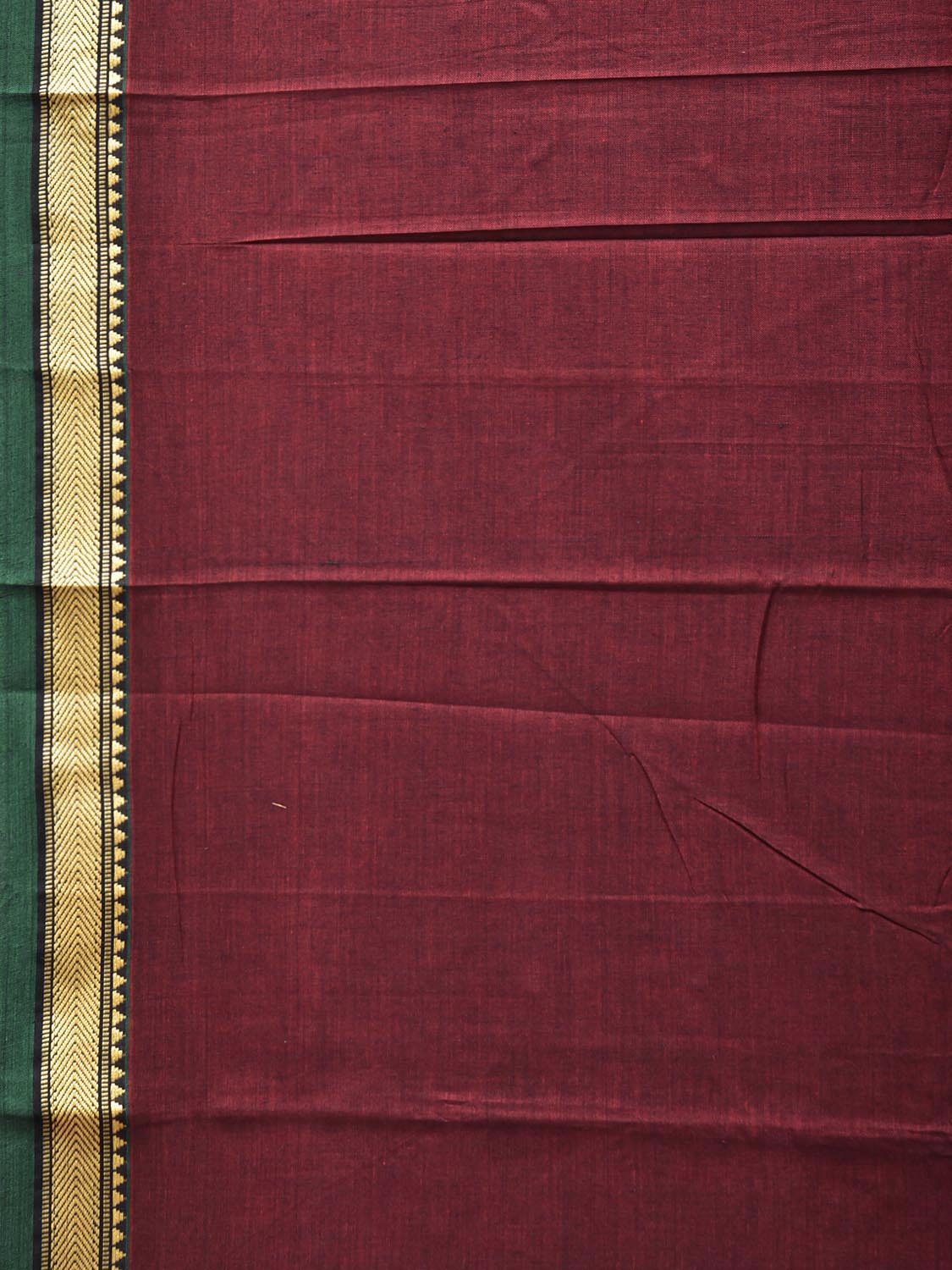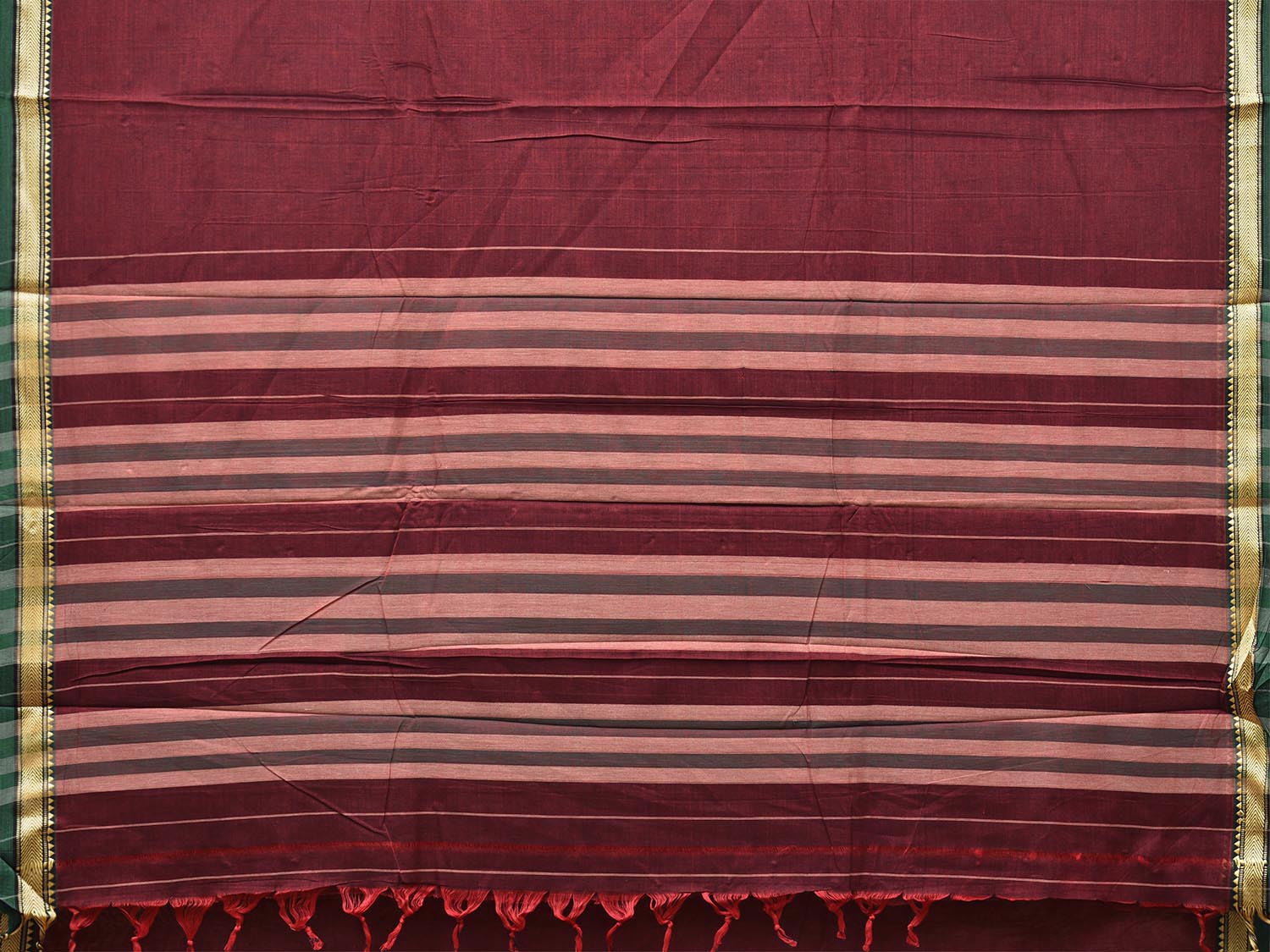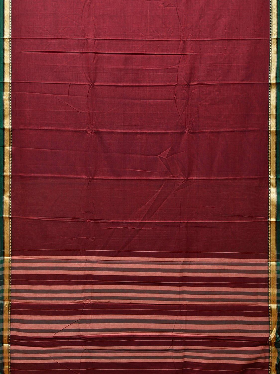 Maroon and Green Narayanpet Cotton Plain Saree with Strips Pallu Design No Blouse. This saree has no blouse.