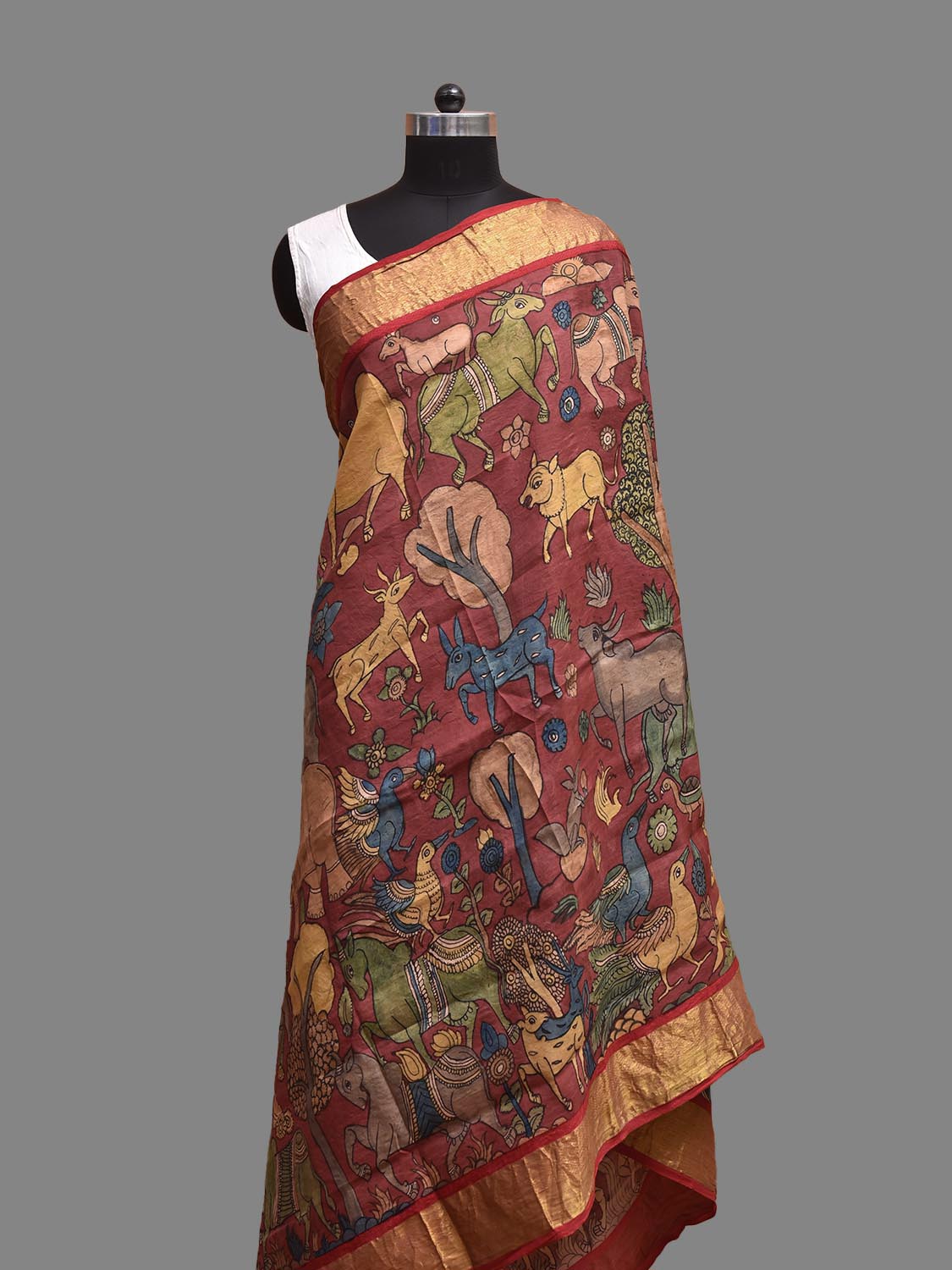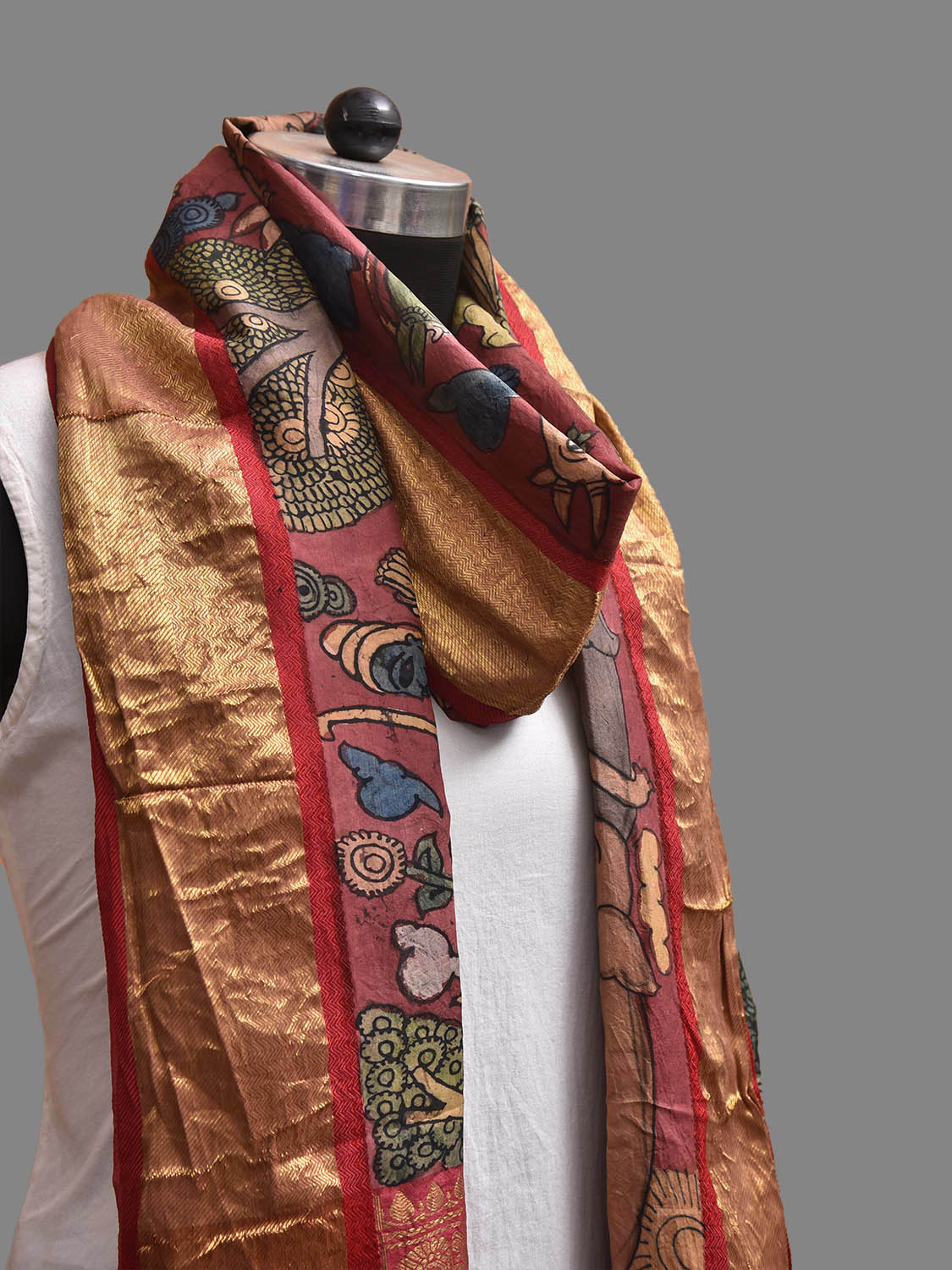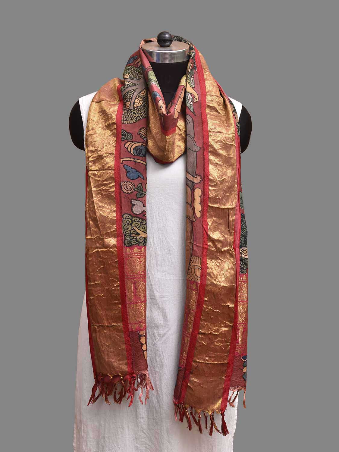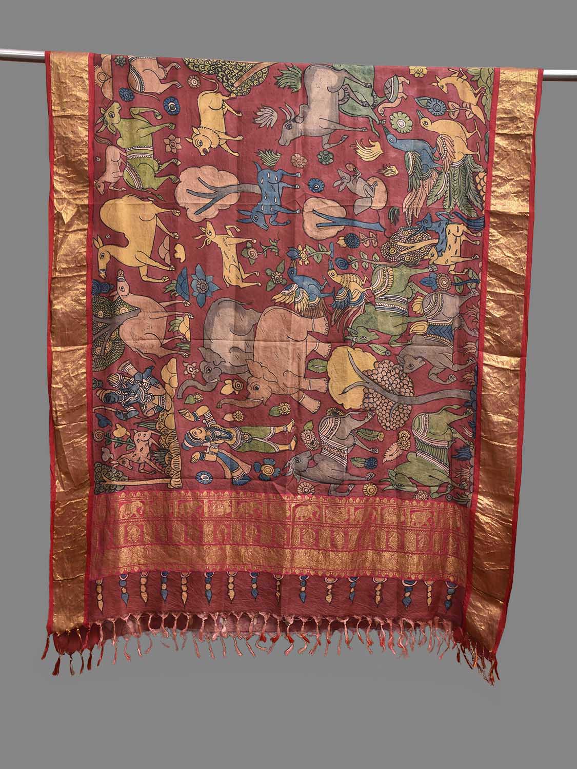 Maroon and Red Kalamkari Hand Painted Kanchipuram Silk Handloom Dupatta with Animals Design. This hand painted kalamkari is done using natural dyes. As they are natural colors they bleed with initial washes, so we suggest Dry clean.