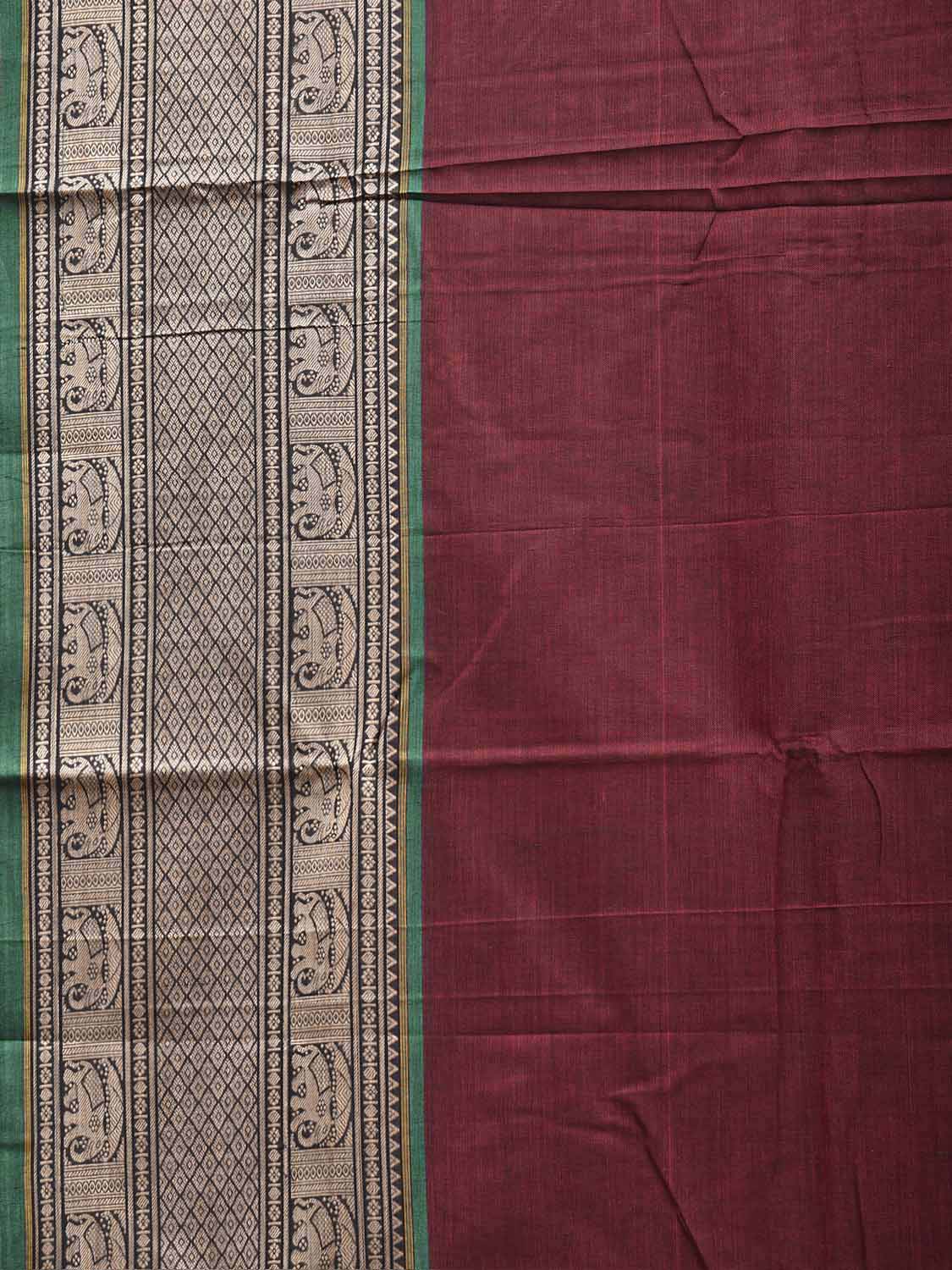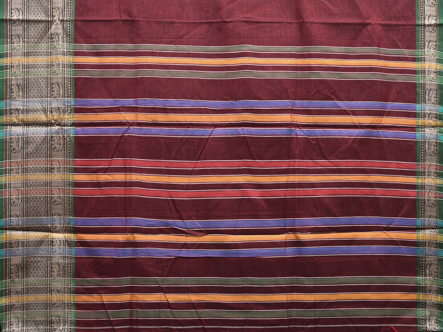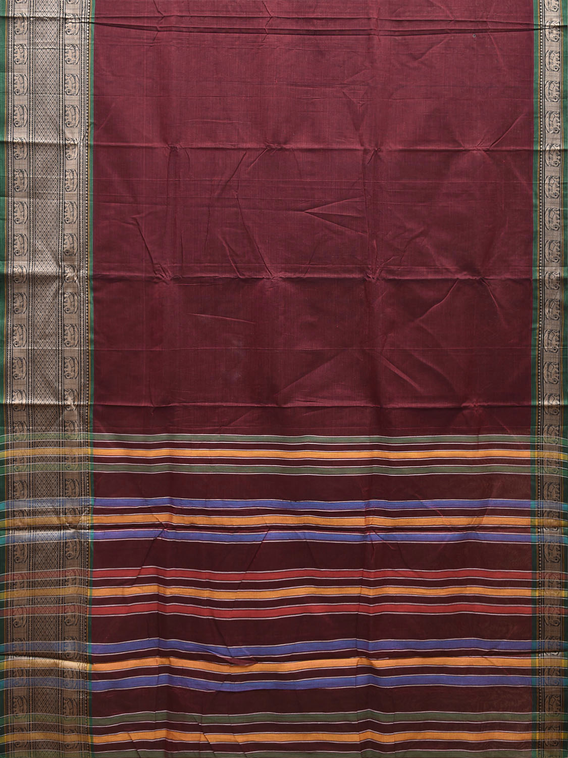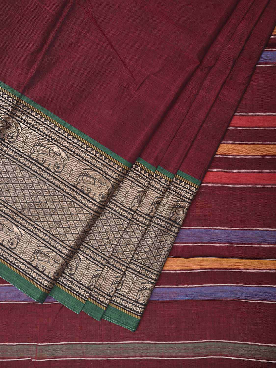 Maroon Kanchipuram Cotton Plain Saree with Strips Pallu and Elephant Border Design No Blouse k1126