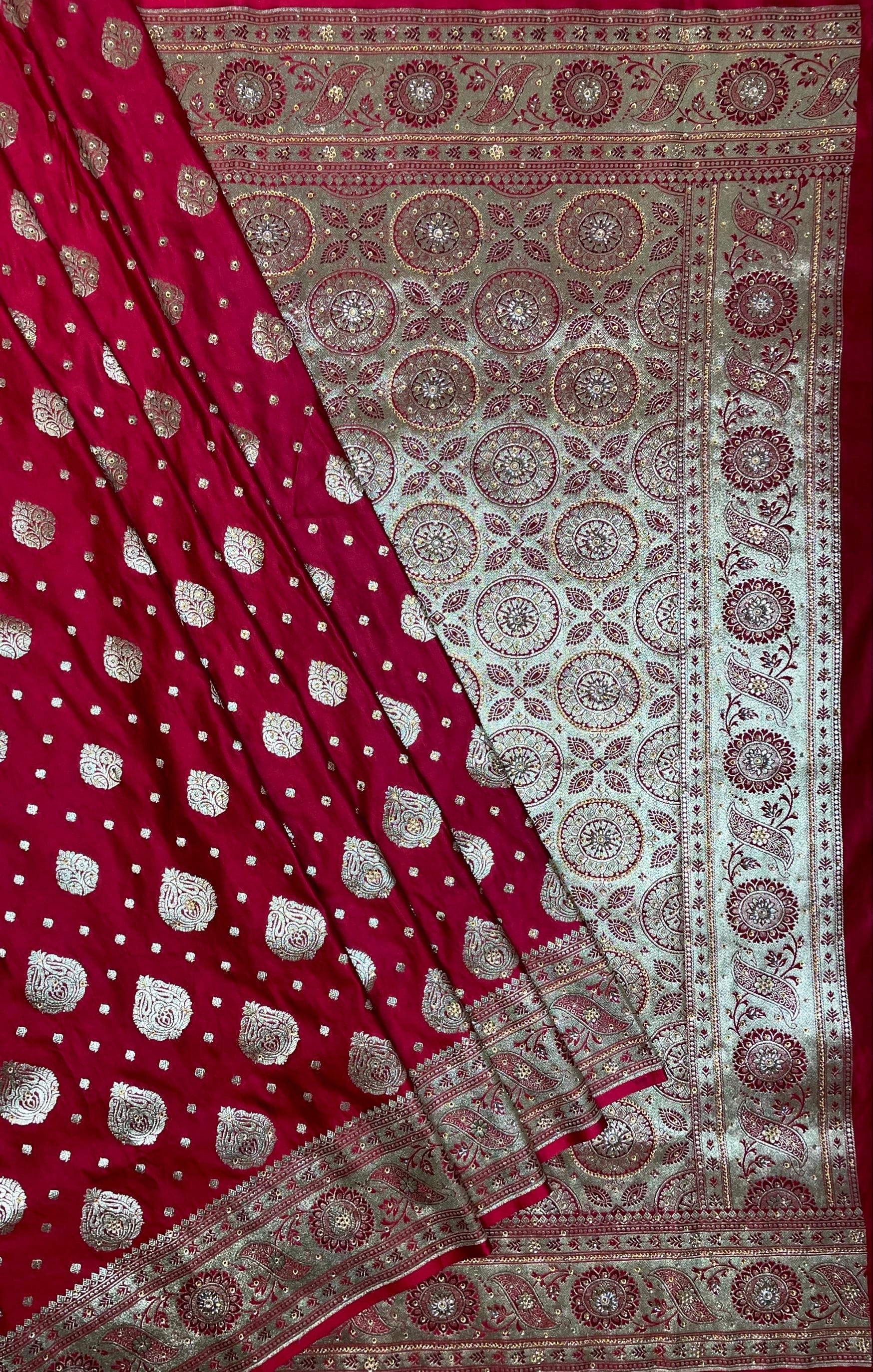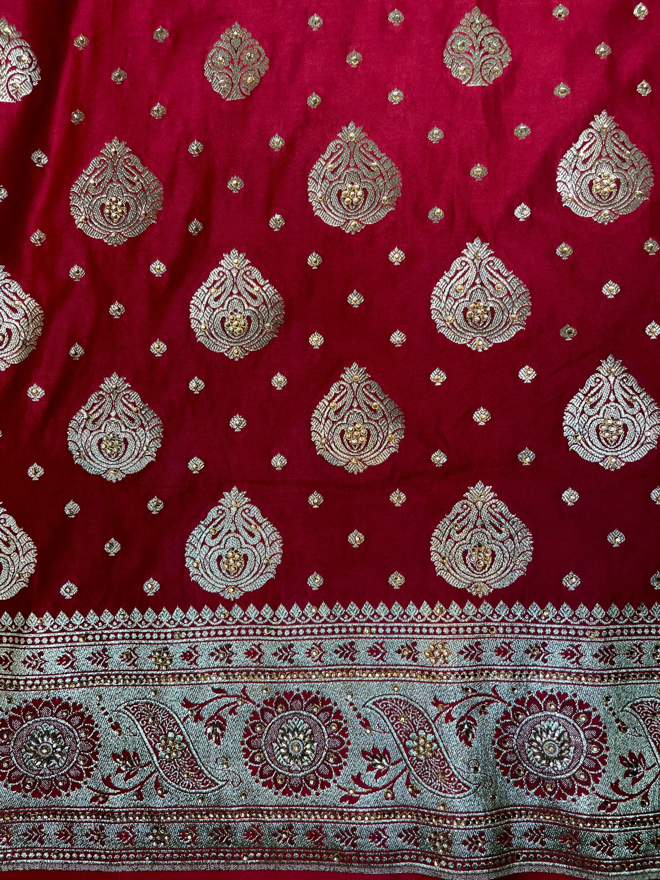 Maroon Katan Banarasi Saree with Silver Zari Floral Weaving And Grand Pallu B0643ds