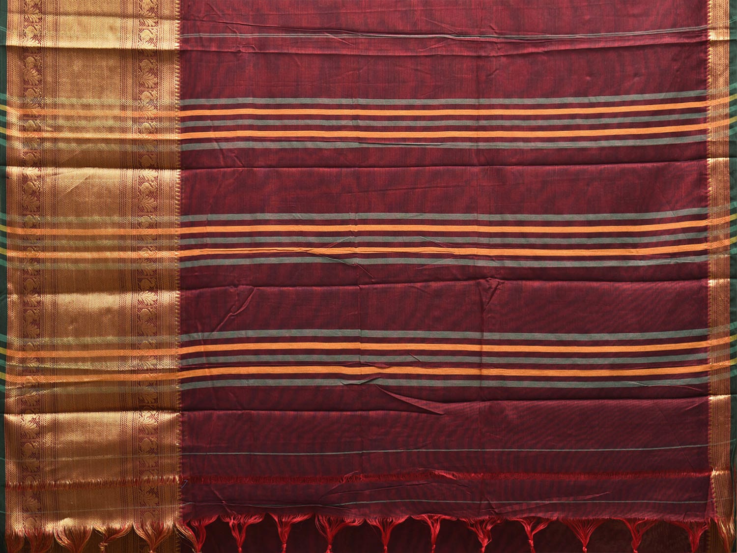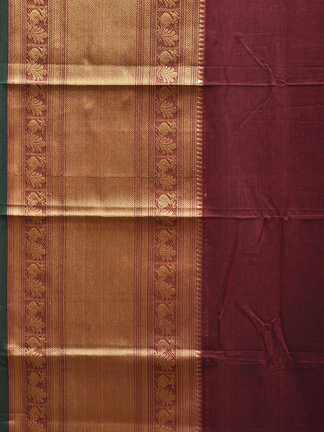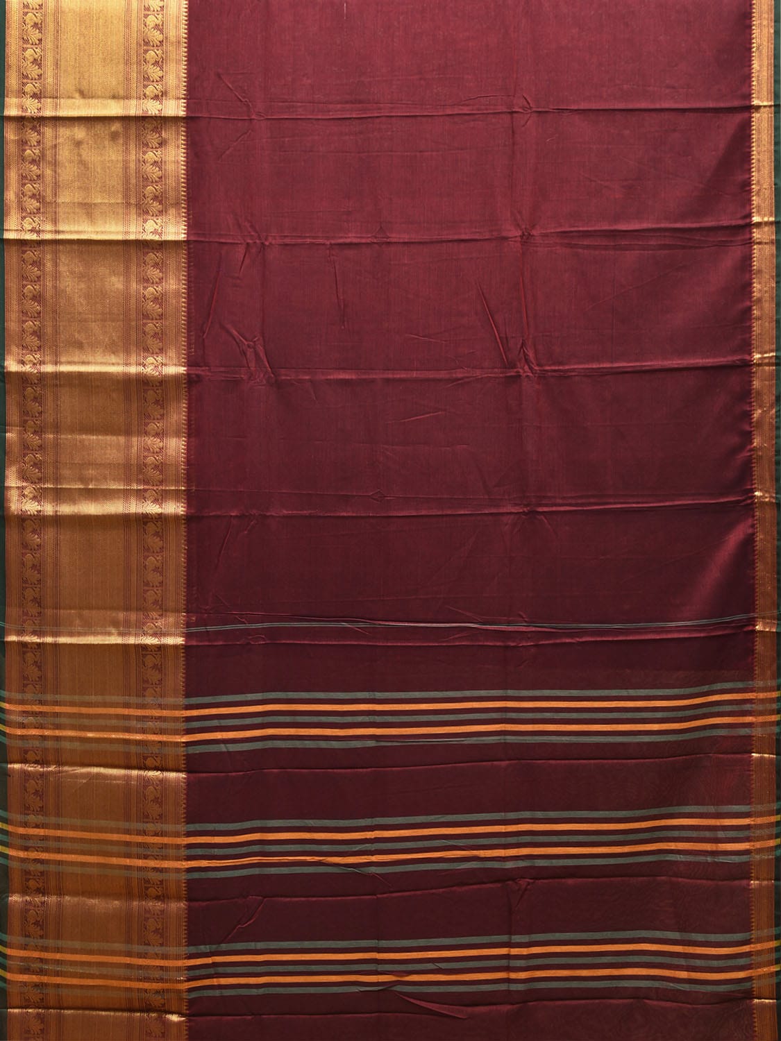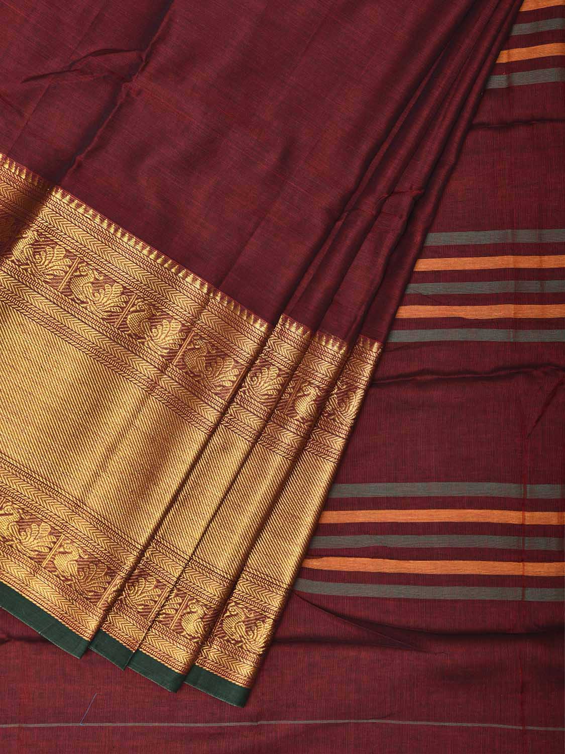 Maroon Narayanpet Cotton Plain Saree with Big Border and Strips Pallu Design No Blouse. This saree has no blouse.