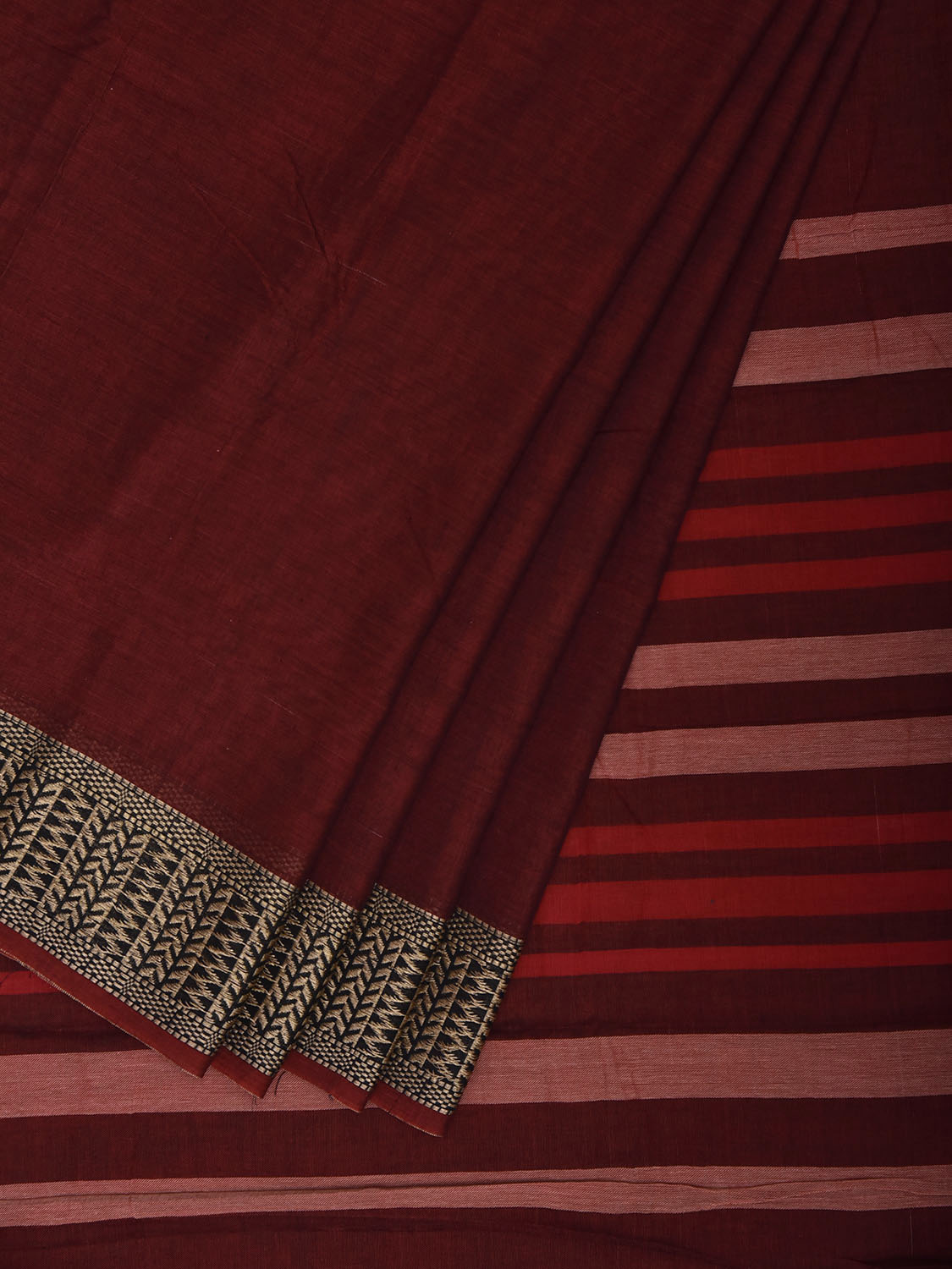 Maroon Narayanpet Cotton Plain Saree with Strips Pallu and Border Design No Blouse np1515