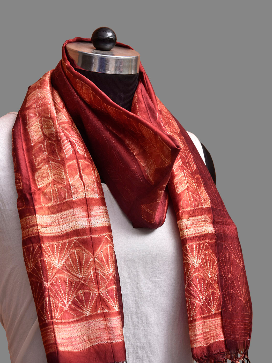Maroon Shibori Silk Stole with All Over Design. Shibori is Japanese a Technique of tie and dye, and resist some parts by clamping or stitching the fabric. The result produced are unique geometric patterns & any other eloborate design. For fabric care we advise dry clean.
