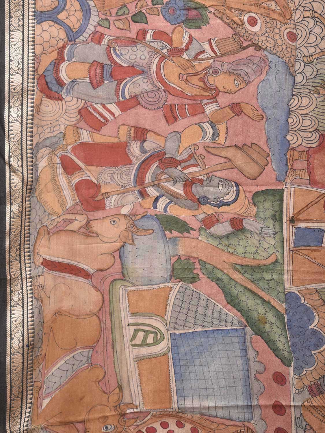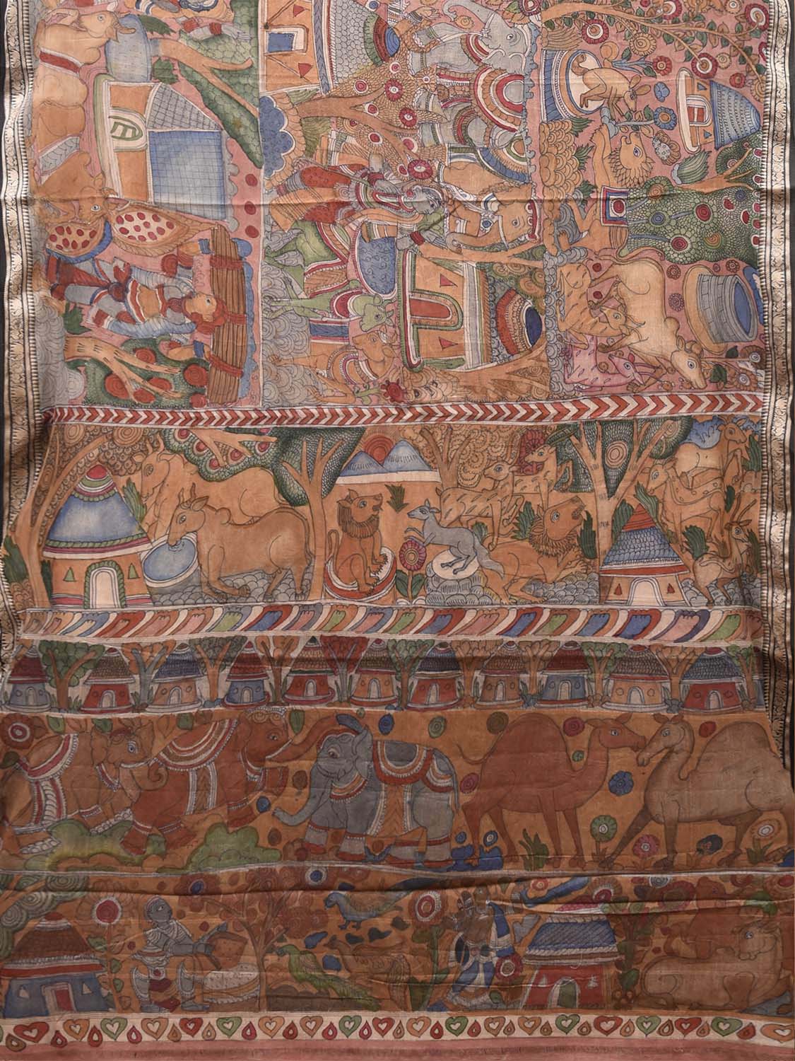 Multicolor Kalamkari Hand Painted Cotton Saree with Animals and Village Theme Design KL0880