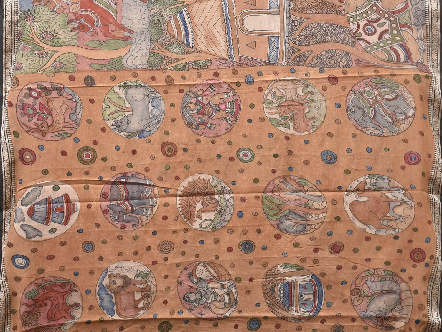 Multicolor Kalamkari Hand Painted Cotton Saree with Animals and Village Theme Design. This is block print kalamkari done using natural dyes. As they are natural colors they bleed with initial washes, so we suggest Dry clean.