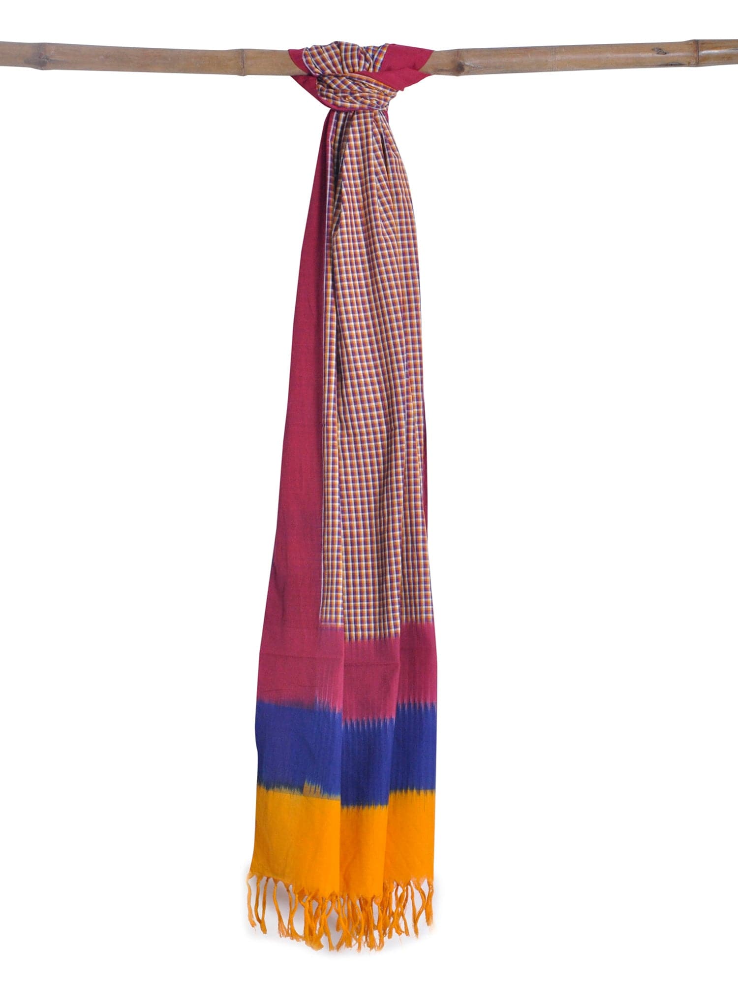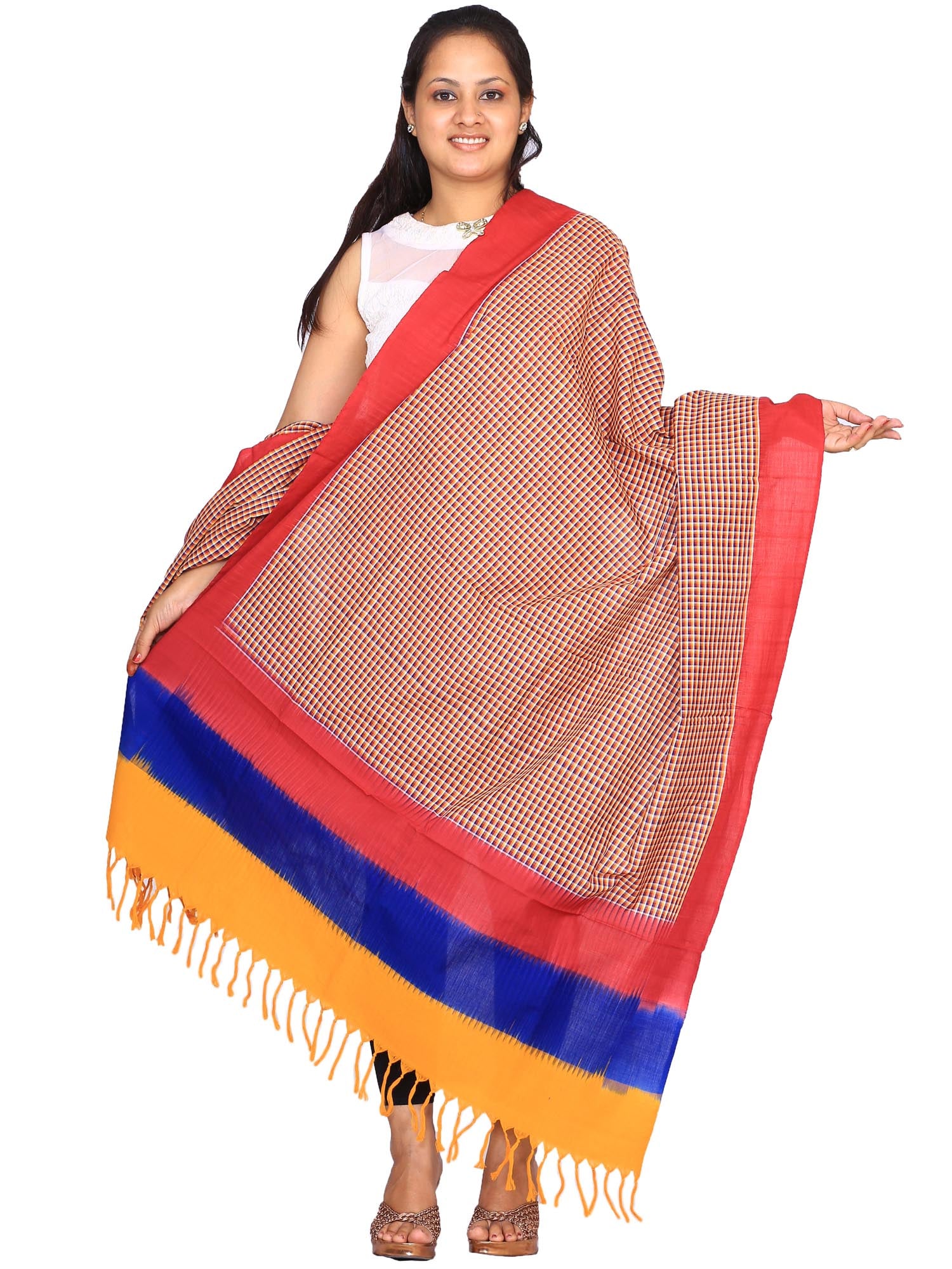 Multicolor Pochampally Ikat Cotton Handloom Dupatta. This Handloom Cotton Dupatta from Andhra Pradesh has been woven using the resist-dyeing, which produces the unique patterns adorning the fabric. Dupatta is 2.5 meters in length and 36 inches width.