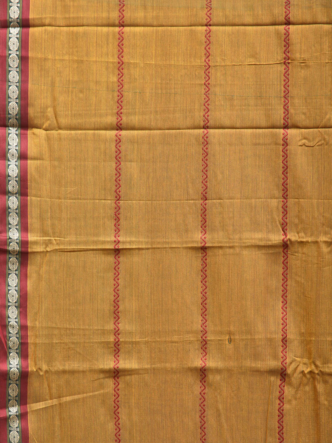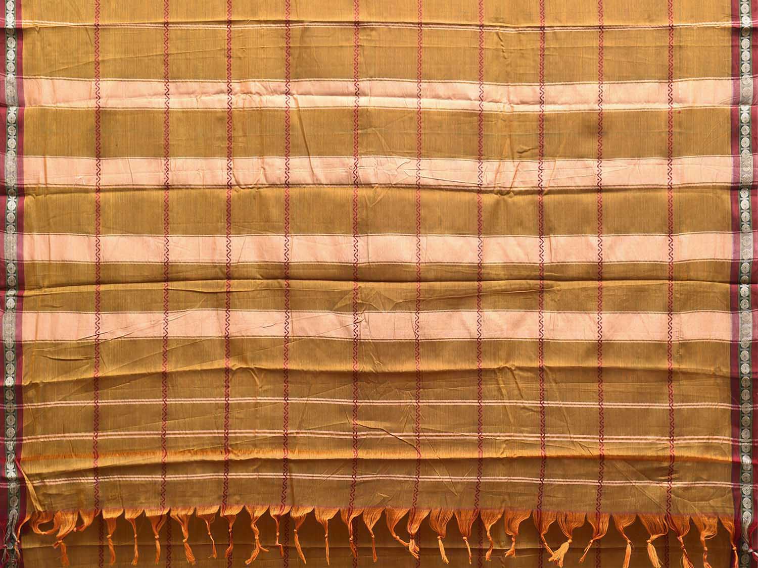 Mustard and Red Narayanpet Cotton Saree with Strips Design No Blouse. This saree has no blouse.