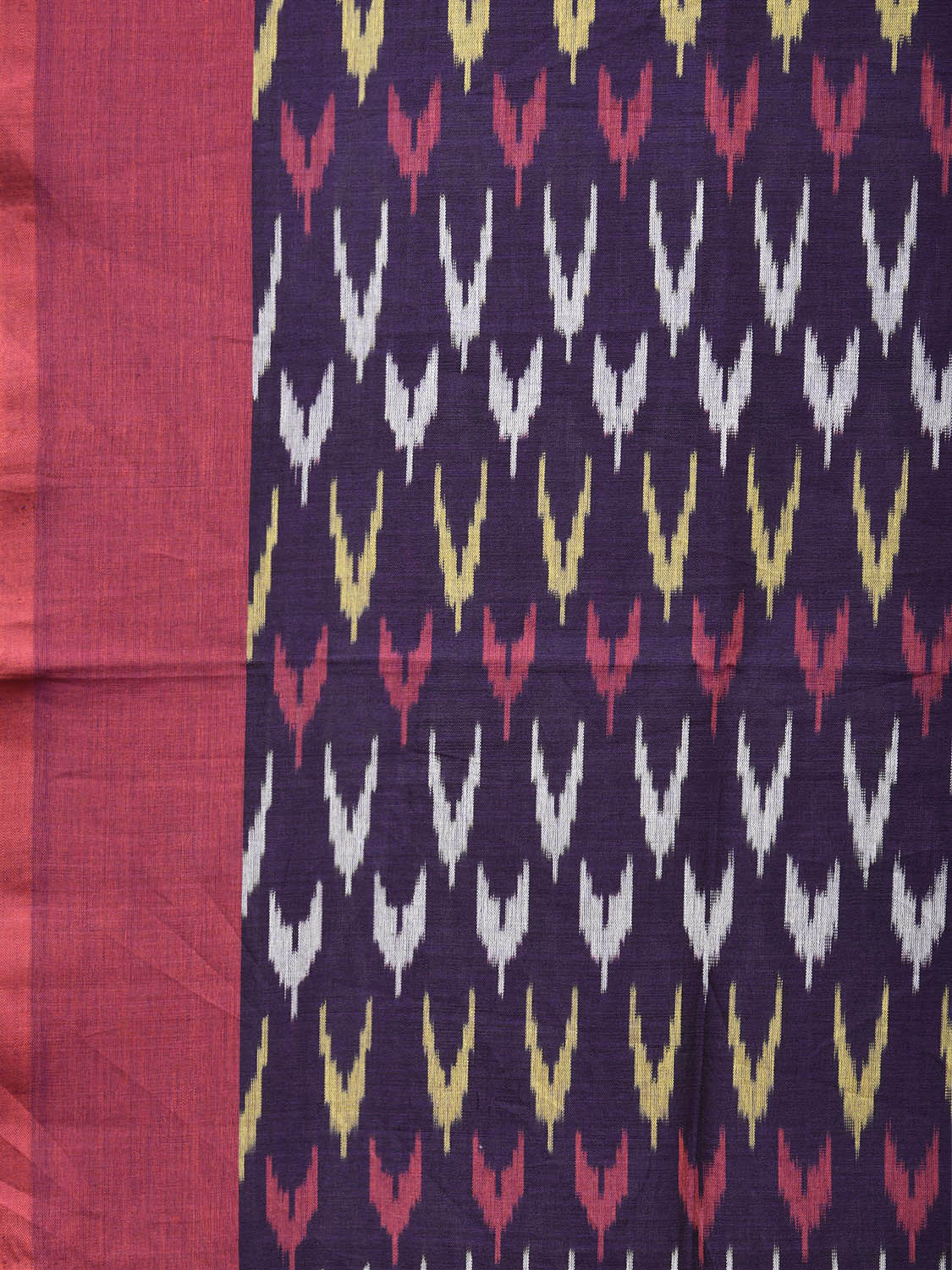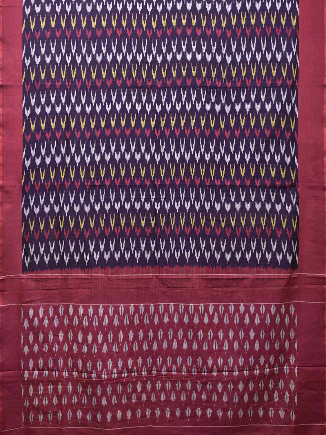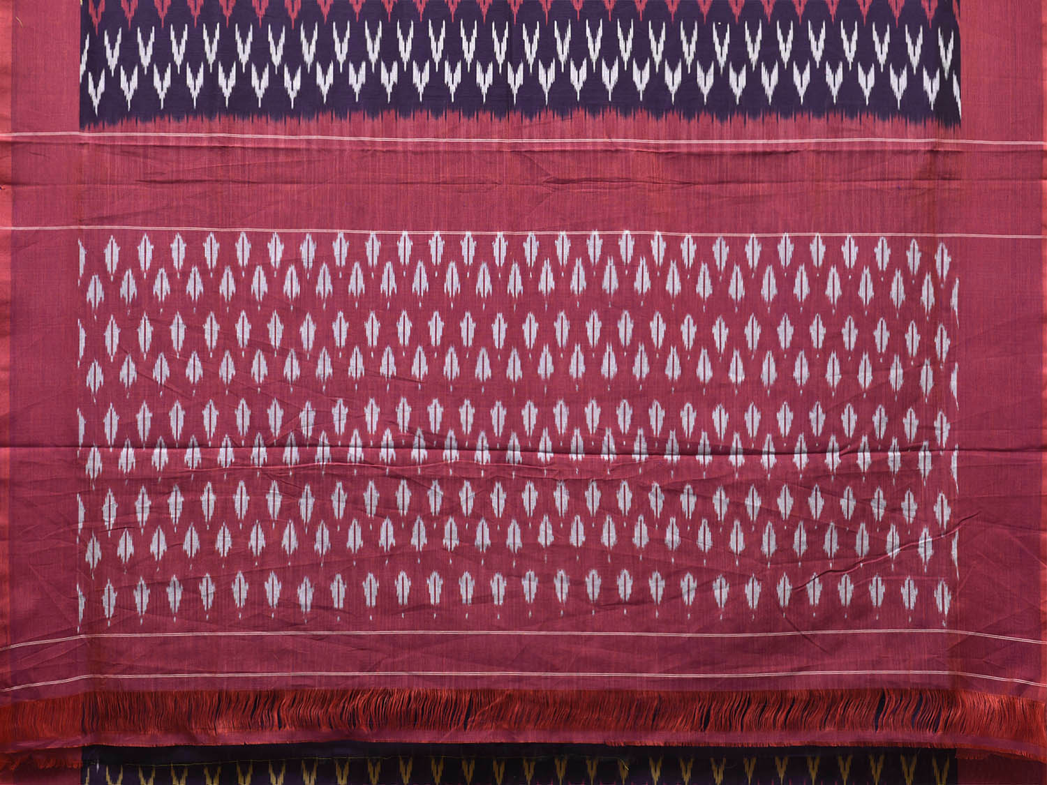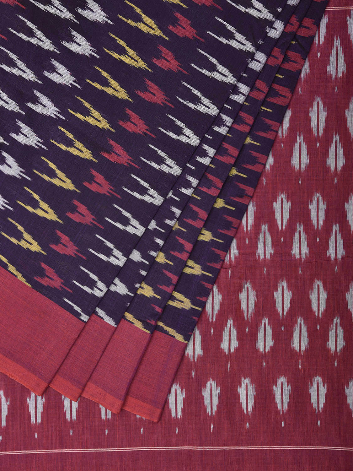 Navy and Dark Red Pochampally Ikat Cotton Handloom Saree with All Over Body Design No Blouse. This Handloom Saree from Andhra Pradesh has been woven using the resist-dyeing, which produces the unique patterns adorning the fabric. We advise gentle handwash separately for fabric care. This saree has no blouse.