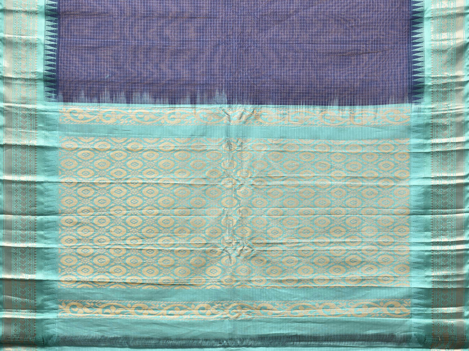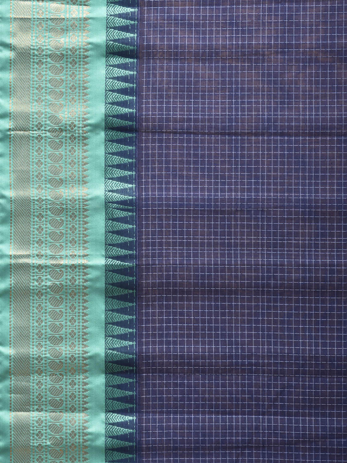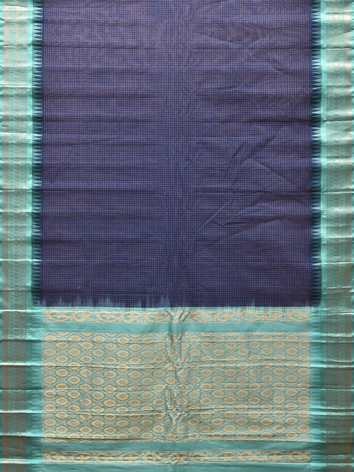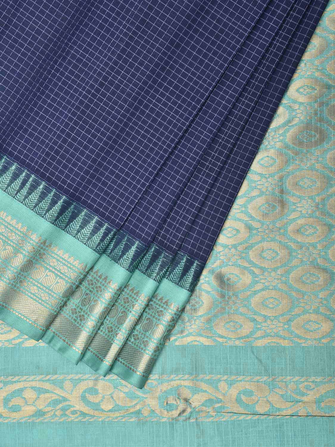 Navy and Turquoise Gadwal Cotton Viscose Saree with Checks and Pallu Design No Blouse. Gadwal Sarees are known for their traditional design of border and pallu made of silk and body being either cotton or silk. They are known as Sico sarees for border and pallu being silk and body being cotton. We advice dry clean for fabric care. This saree has no blouse.