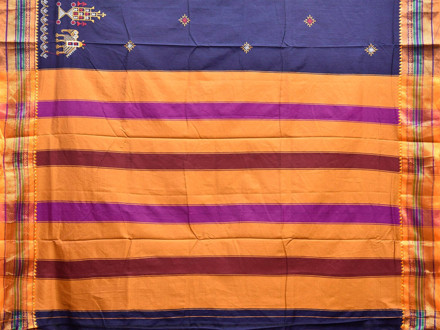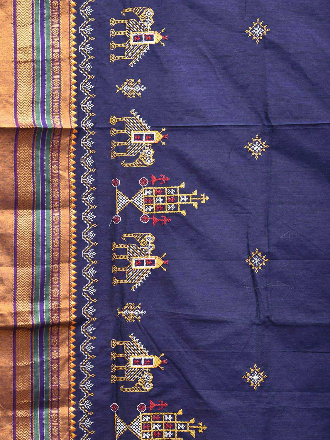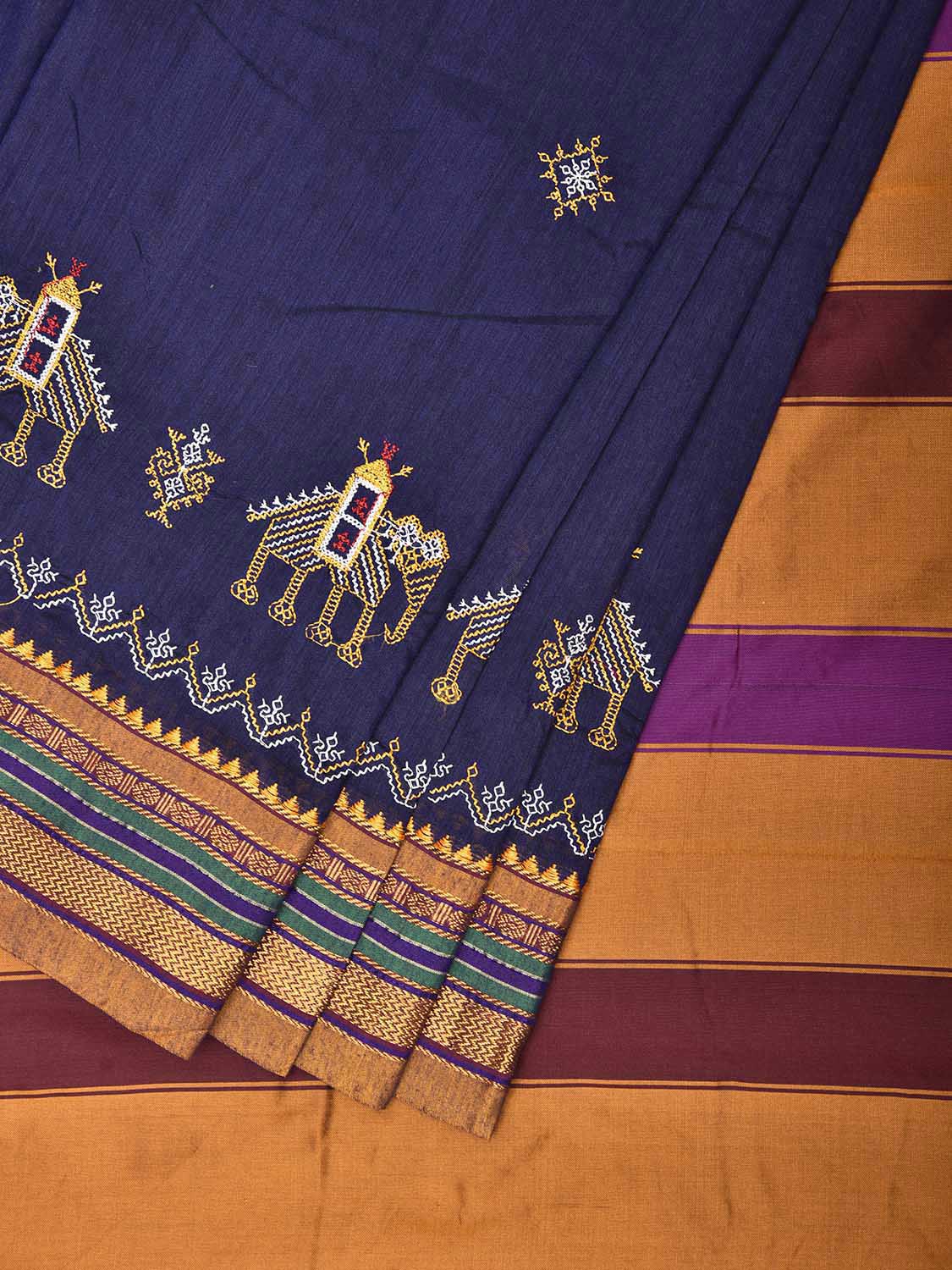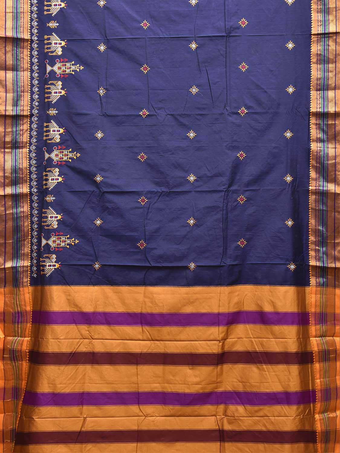 Navy and Yellow ilkal Viscose Saree with Border Kasuti Work Design No Blouse. For fabric care we advise gentle handwash separately. This saree has no blouse.