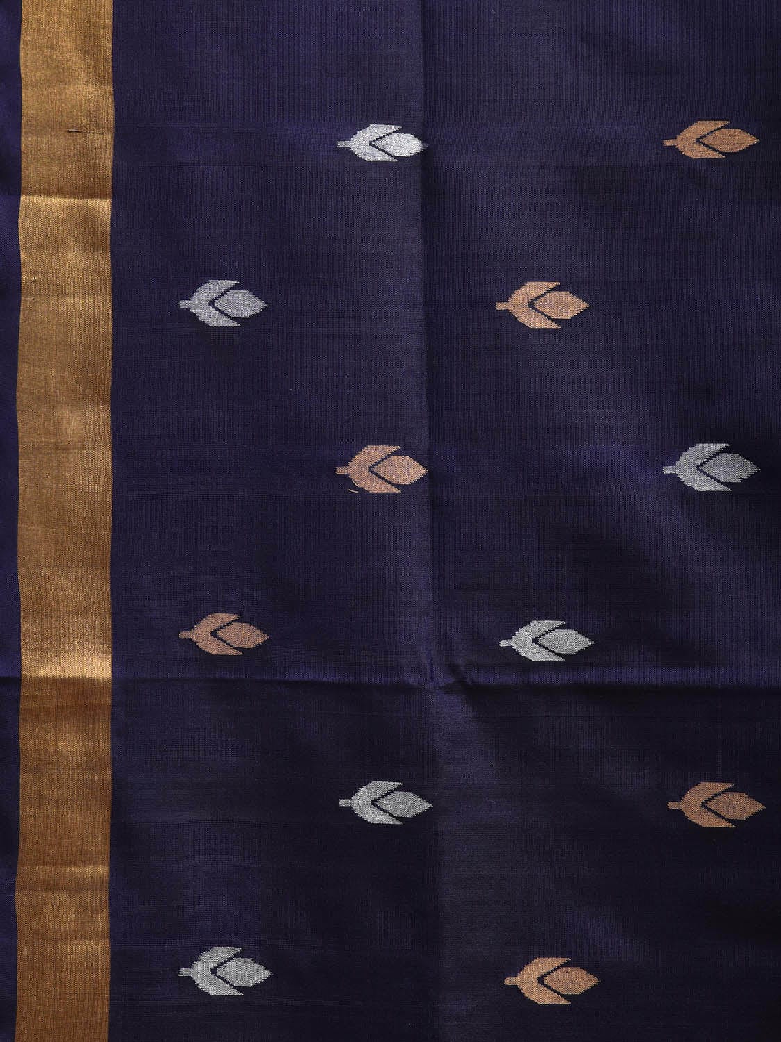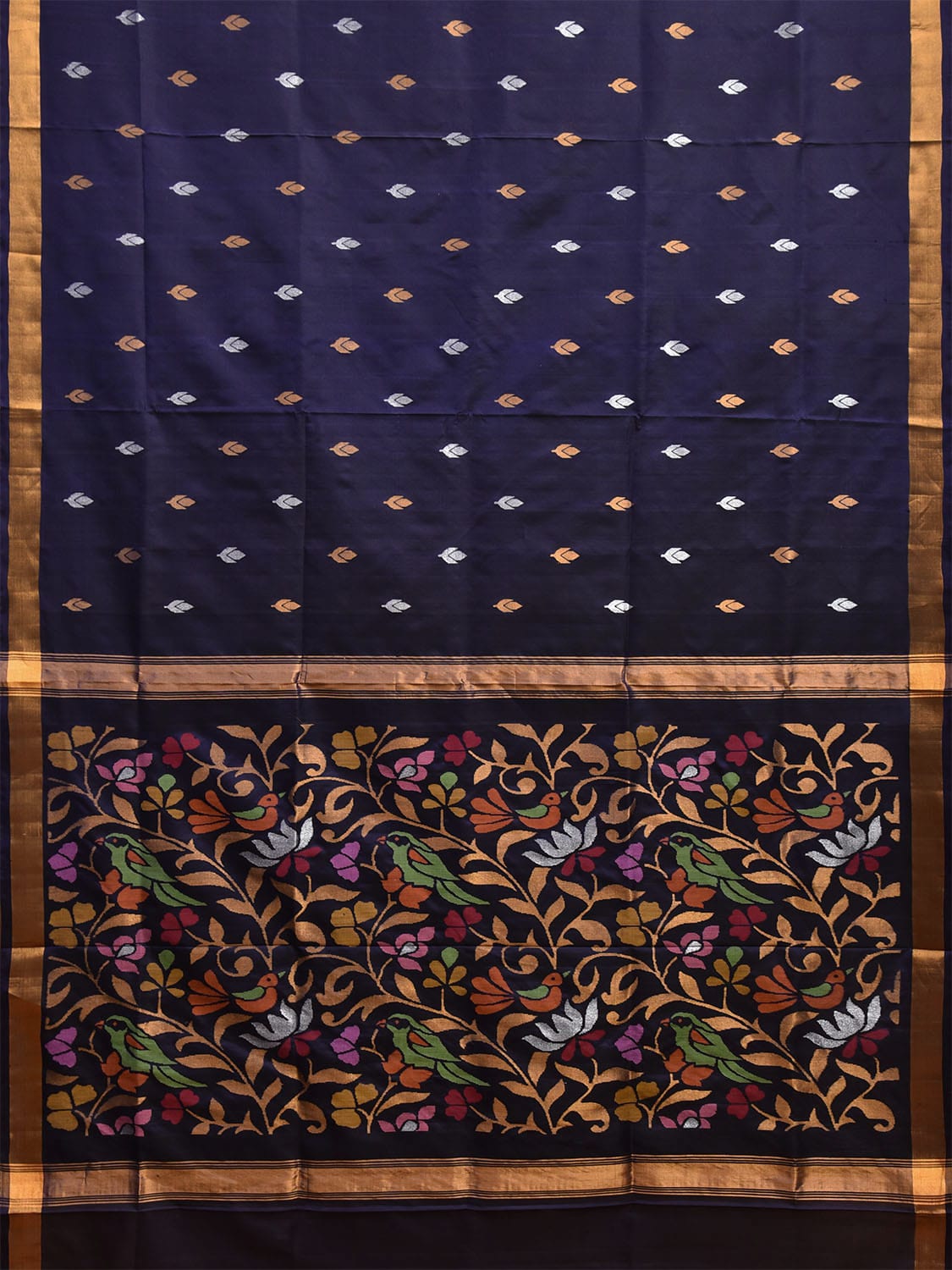 Navy Uppada Silk Handloom Saree with Floral and Birds Pallu Design. Uppada sarees are known for light weight sarees with jamdani weaving technique. With so many traditional designs it is considered for the very special occasion wear. We advice dry clean for fabric care.