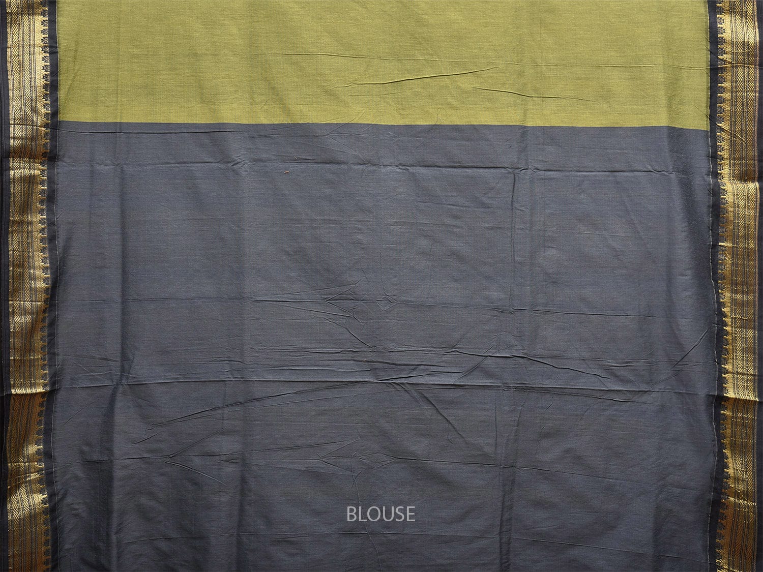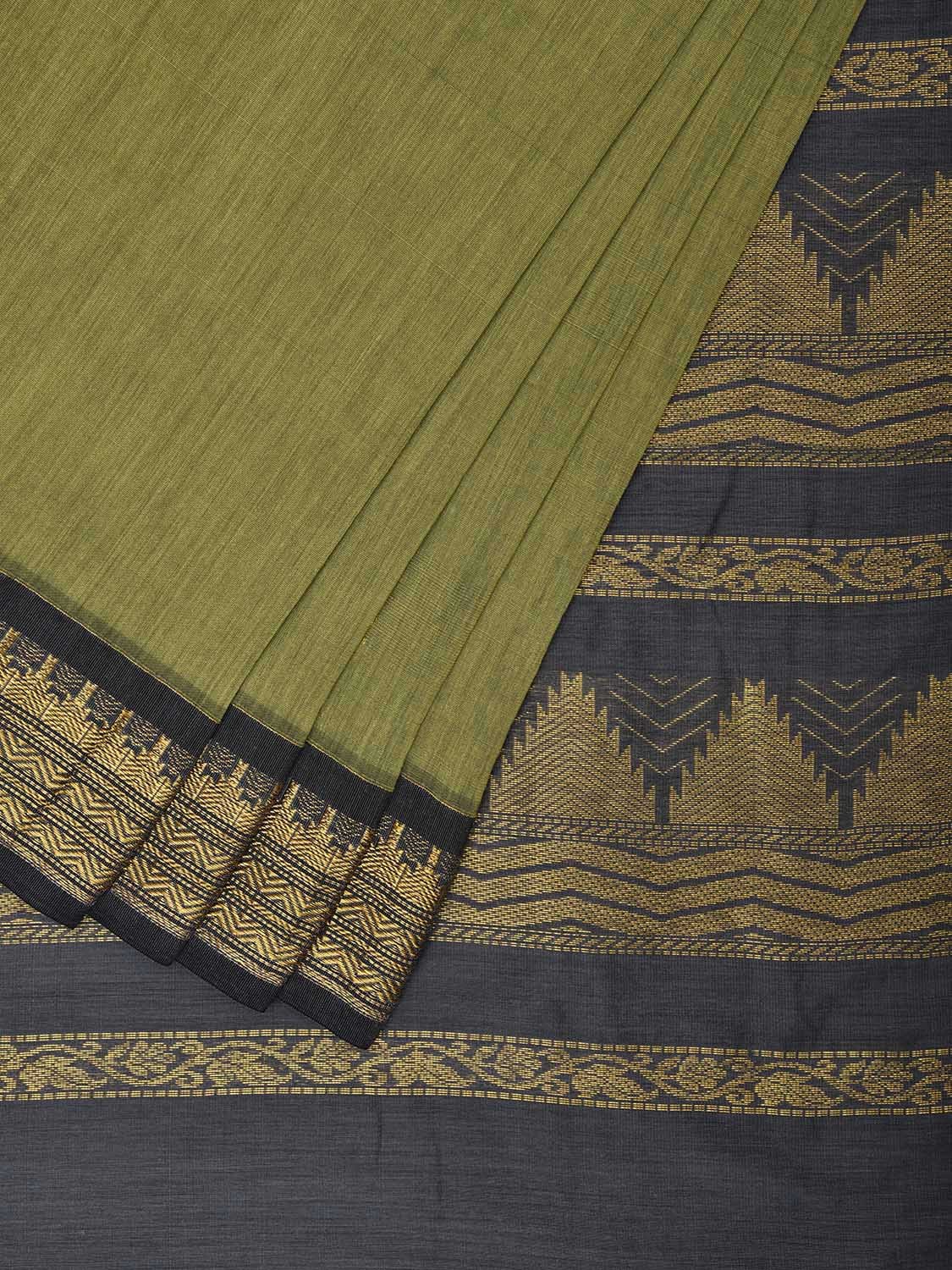 Olive and Grey Gadwal Cotton Saree with Pallu and Border Design. Gadwal Sarees are known for their tradtional design of border and pallu made of silk and body being either cotton or silk. They are known as Sico sarees for border and pallu being silk and body being cotton. We advice dry clean for fabric care.