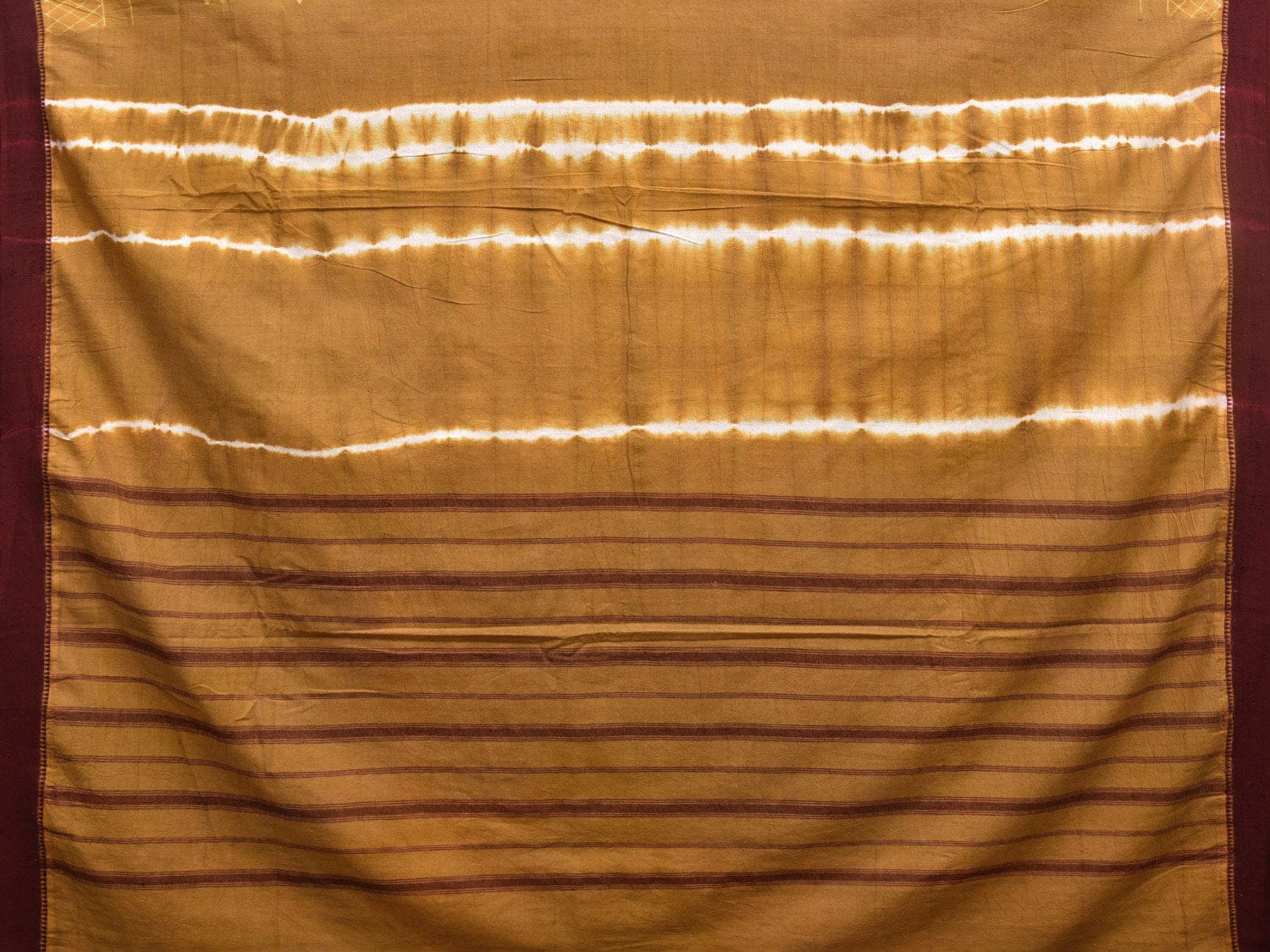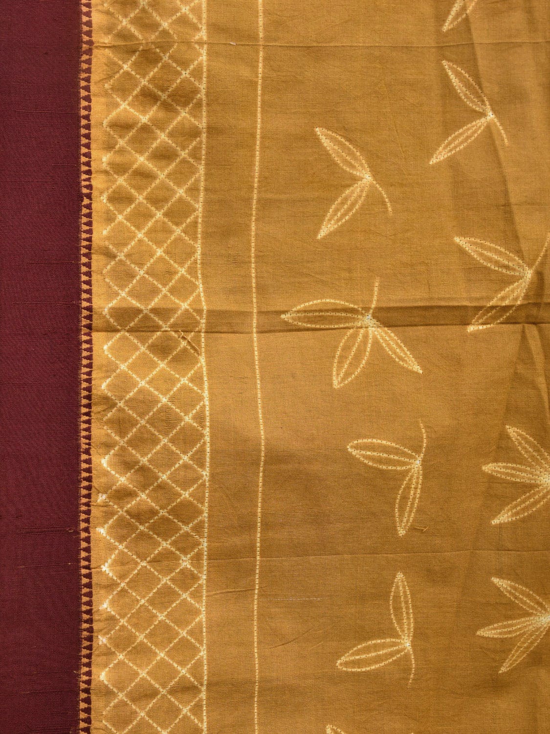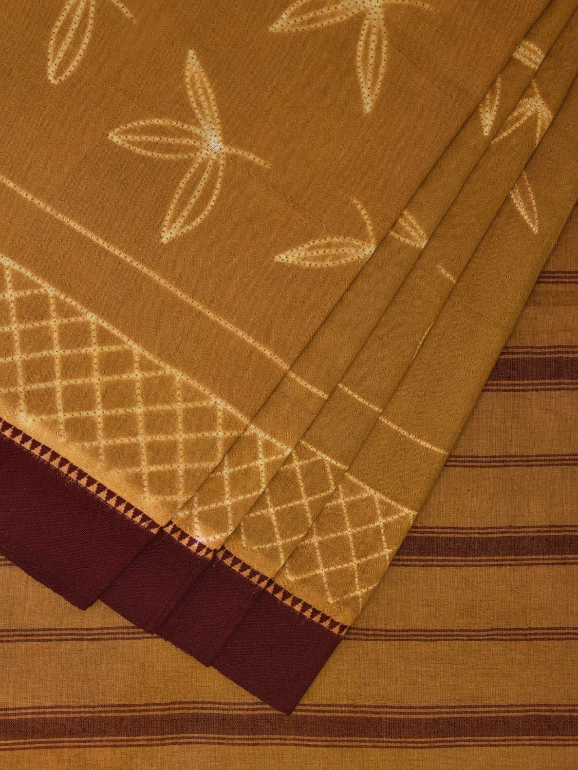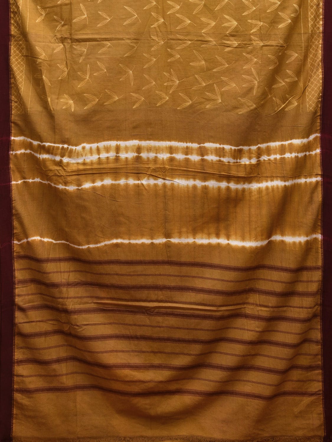 Olive and Maroon Shibori Gadwal Cotton Saree with Leaves Buta and Strips Pallu Design. Shibori is Japanese a Technique of tie and dye, and resist some parts by clamping or stitching the fabric. The result produced are unique geometric patterns & any other eloborate design. For fabric care we advise gentle handwash separately.