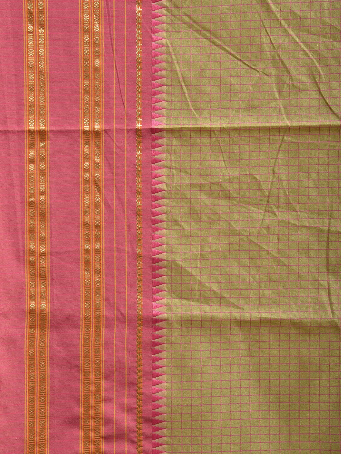 Olive and Pink Bamboo Cotton Viscose Silk Saree with Checks Design No Blouse. This is a blend of bamboo and cotton fibers, they have characteristics of both bamboo and cotton combined into one fabric. We Advise Gentle Handwash for Fabric Care. This Saree has no Blouse.
