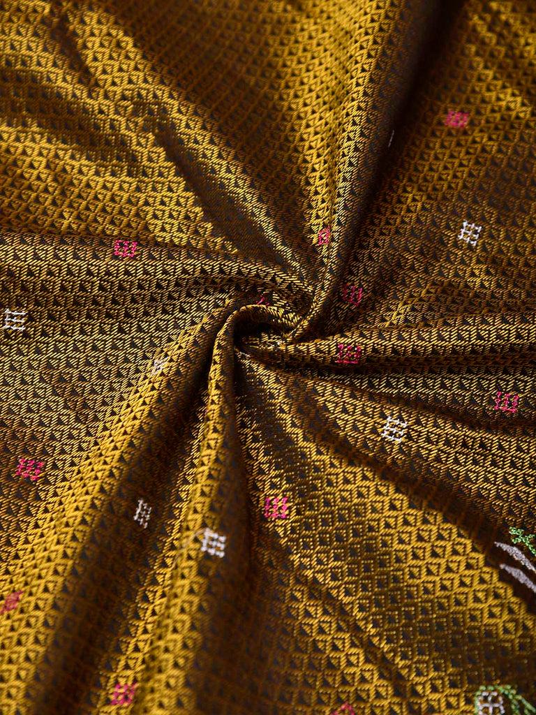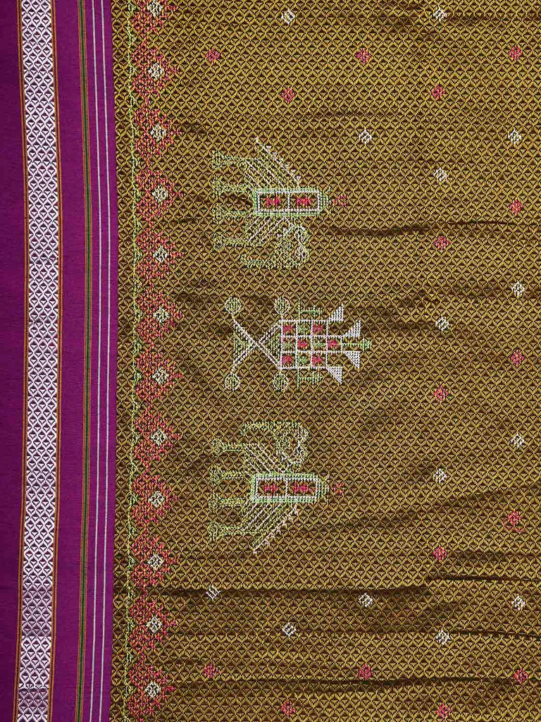 Olive and Purple Kasuti Viscose Blouse with Elephant Design Length 1mt Width 44 Inches. Beautiful Pattern Blouse Fabric and Easy to Match to Any Suitable Saree. We Advise Gentle Handwash for Fabric Care.