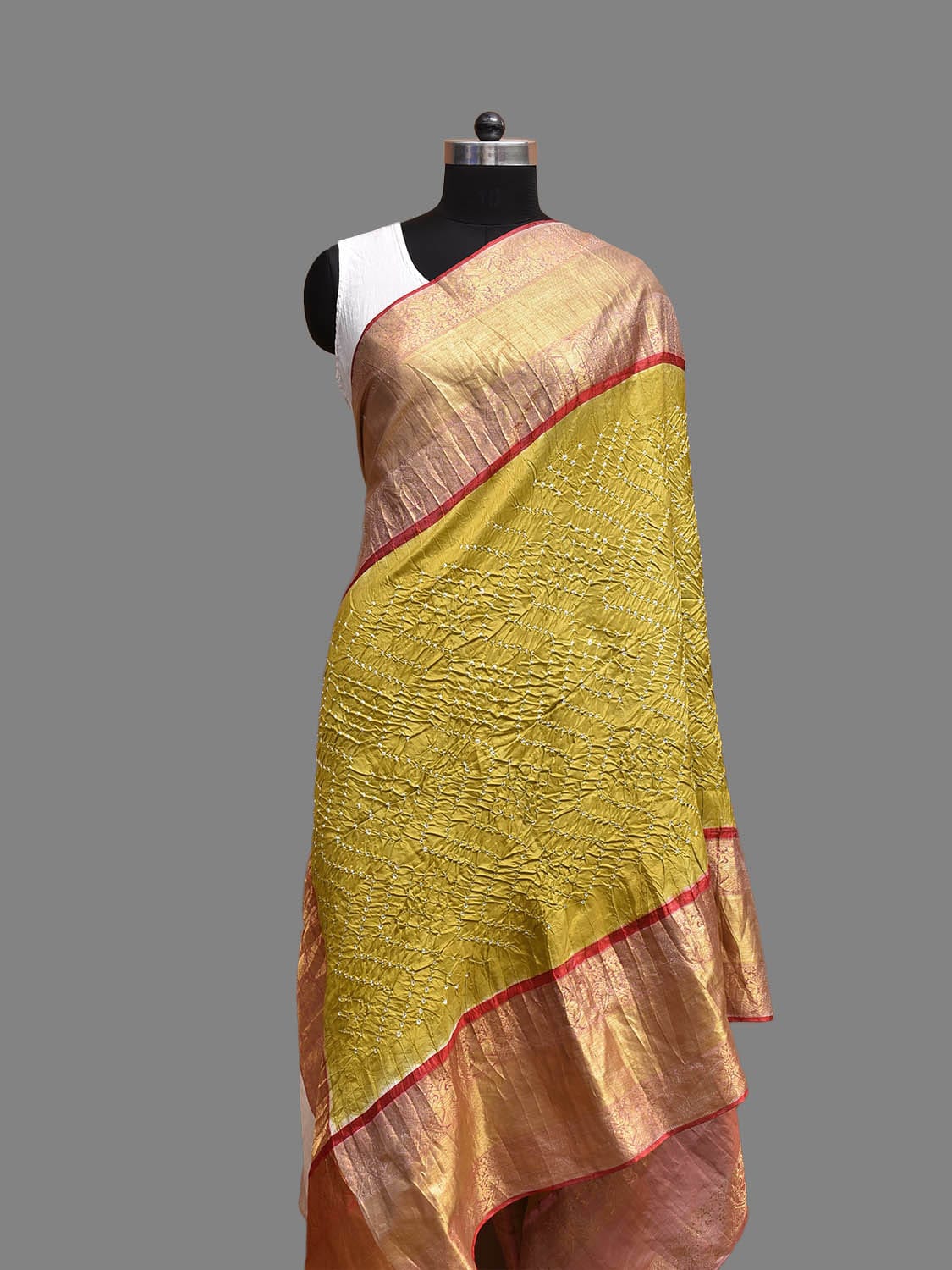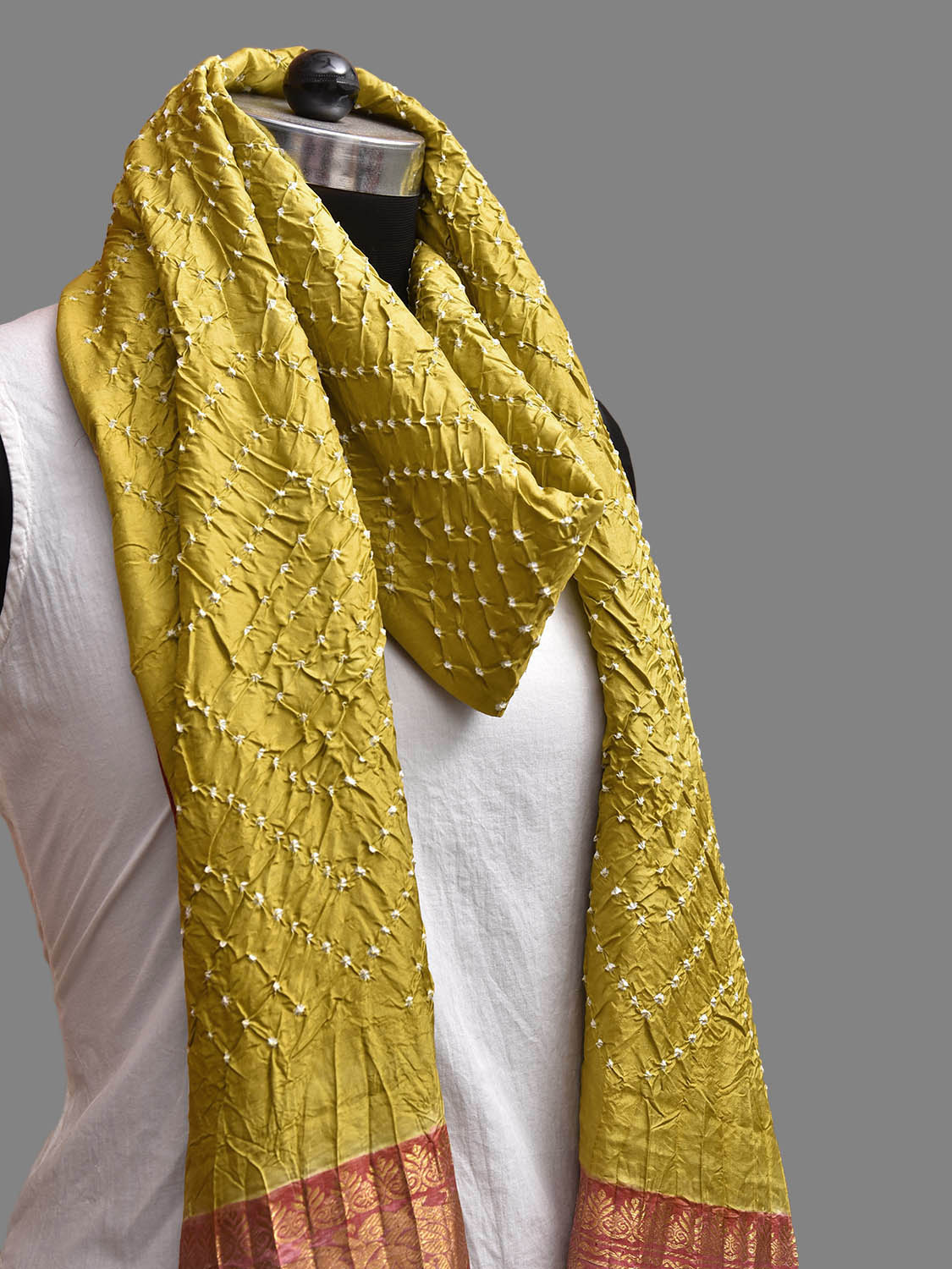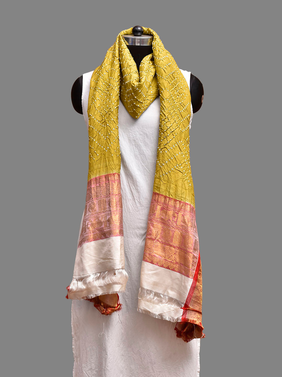 Olive and Red Bandhani Kanchipuram Silk Dupatta with Border Design. Bandhani is done by tie-dye technique by plucking the cloth with fingernails and binding them into different designs as required. We advice dry clean for fabric care and initially soak in water (unless kalamkari work) following with steam iron or rolling of saree before use.