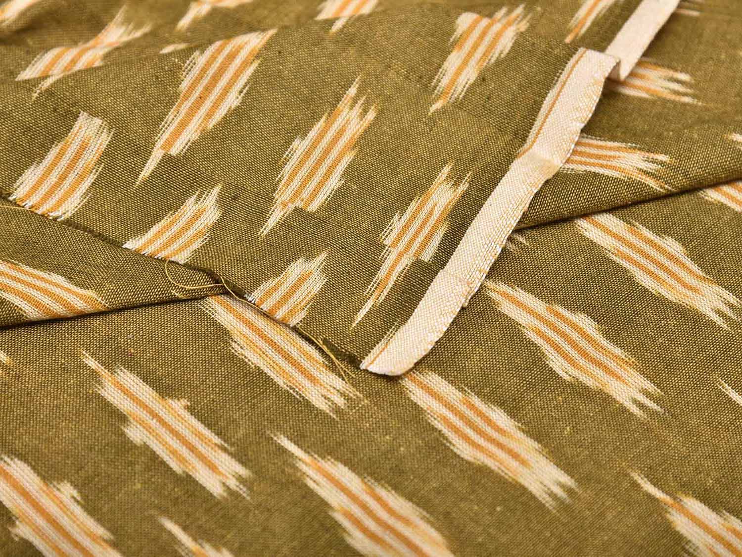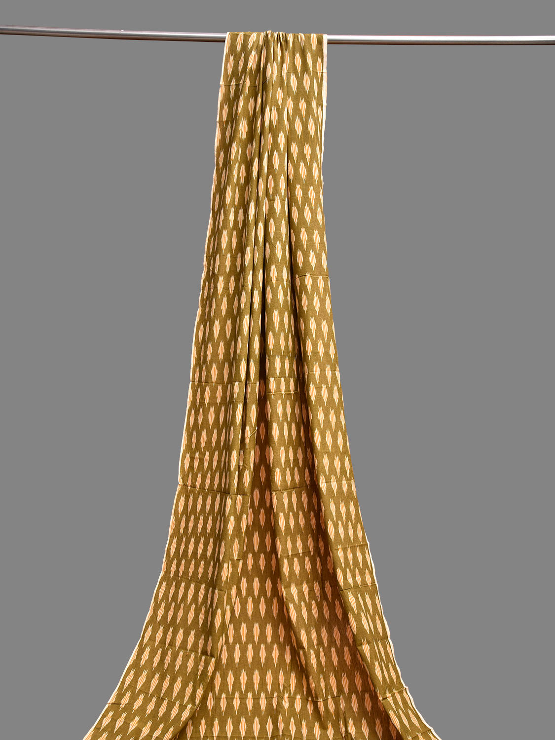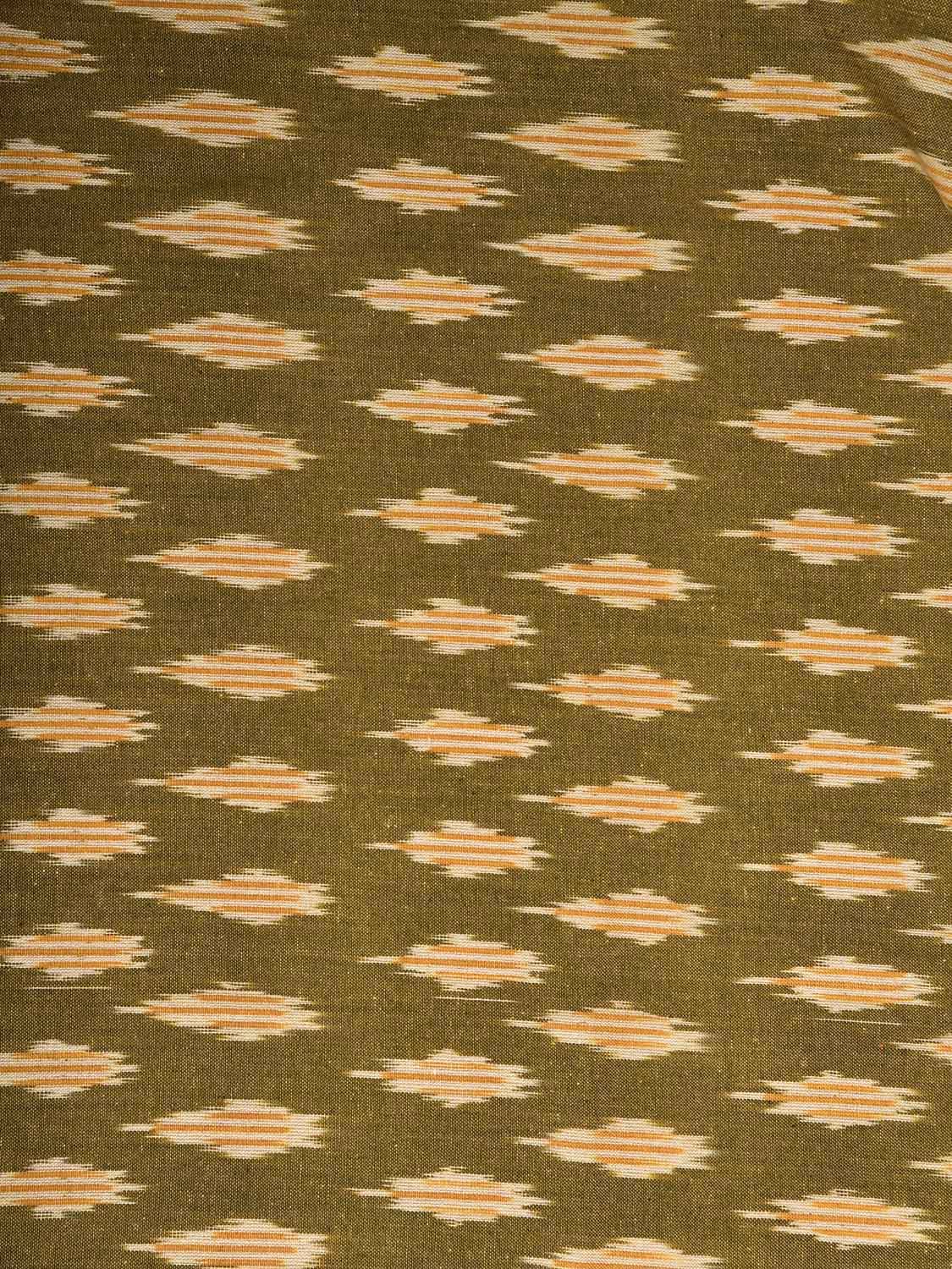 Olive and Yellow Pochampally Ikat Cotton 2.5mts Fabric with Buta Design. This Handloom Cotton Fabric from Andhra Pradesh has been woven using the resist-dyeing, which produces the unique patterns adorning the fabric. Fabric is 44 inches in width. The price mentioned is for Quantity 1 = 2.5 meters. For fabric care we advise gentle handwash separately.