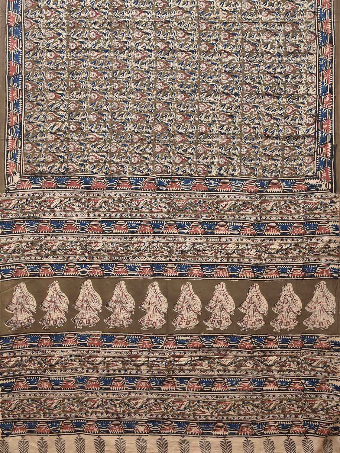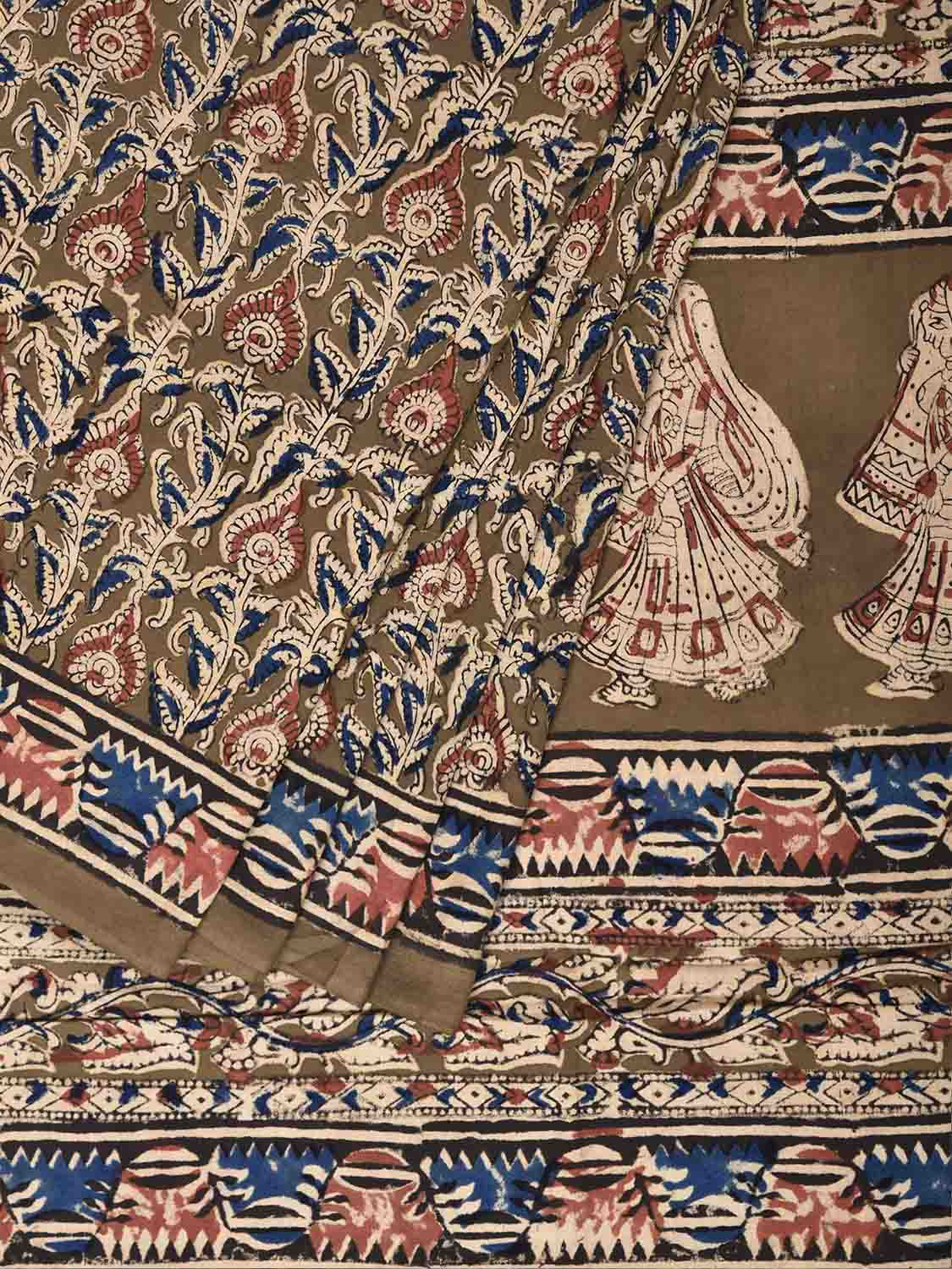 Olive Kalamkari Block Print Cotton Saree with All Over and Women Art Pallu Design. This is block print kalamkari done using natural dyes. As they are natural colors they bleed with initial washes, so we suggest Dry clean.