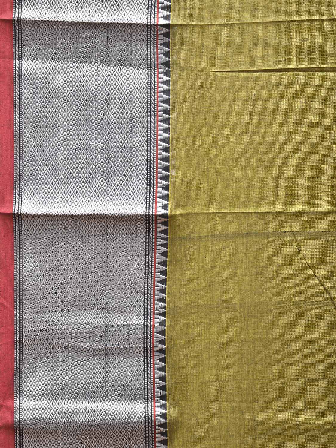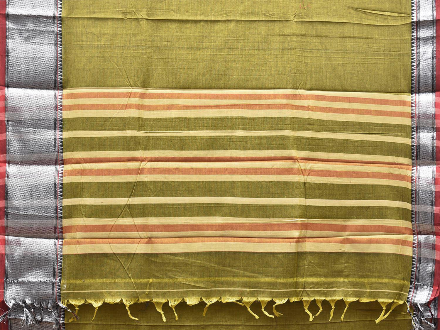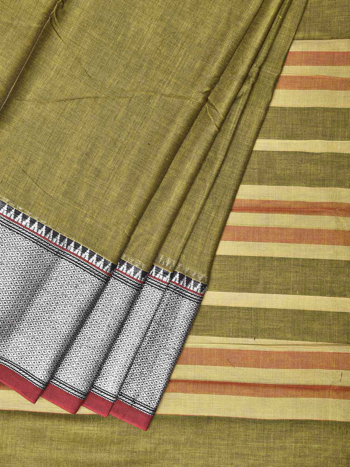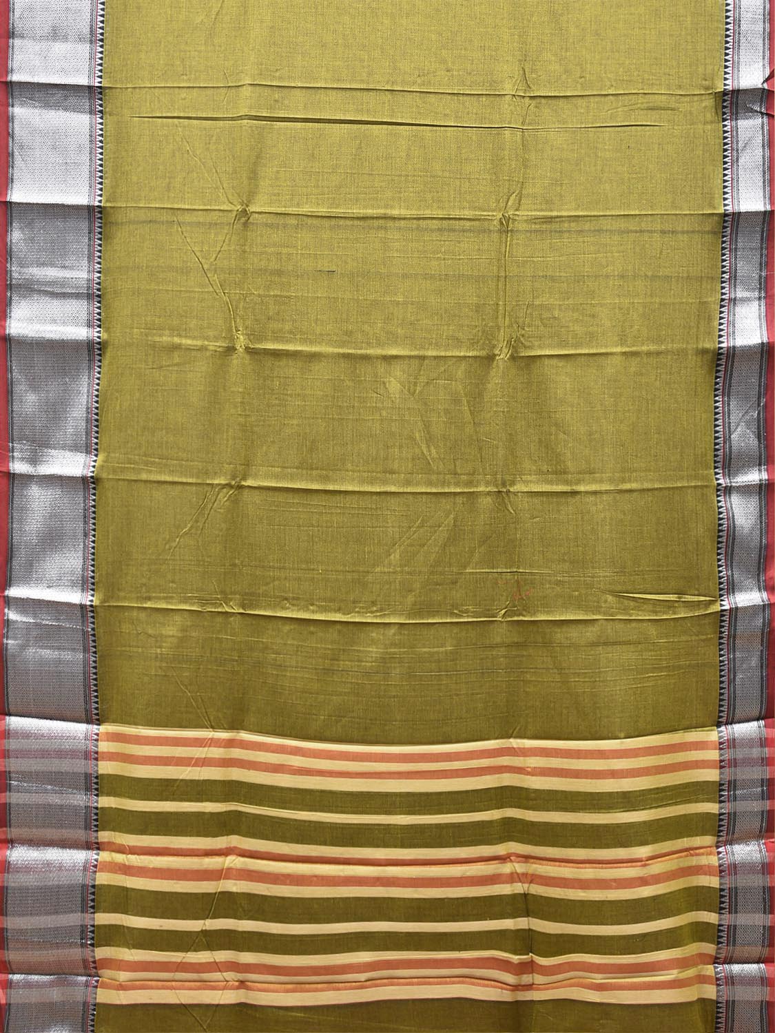 Olive Kanchipuram Cotton Plain Saree with Strips Pallu and Zari Border Design No Blouse. Traditional Simple South Indian Attire Saree for any Casual Occasions. As it’s a cotton saree we advice gentle handwash separately for fabric care. This saree has no blouse.