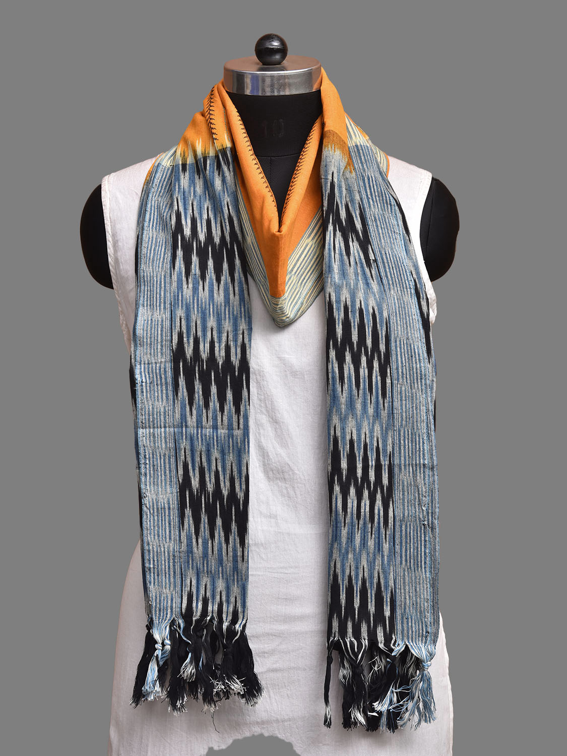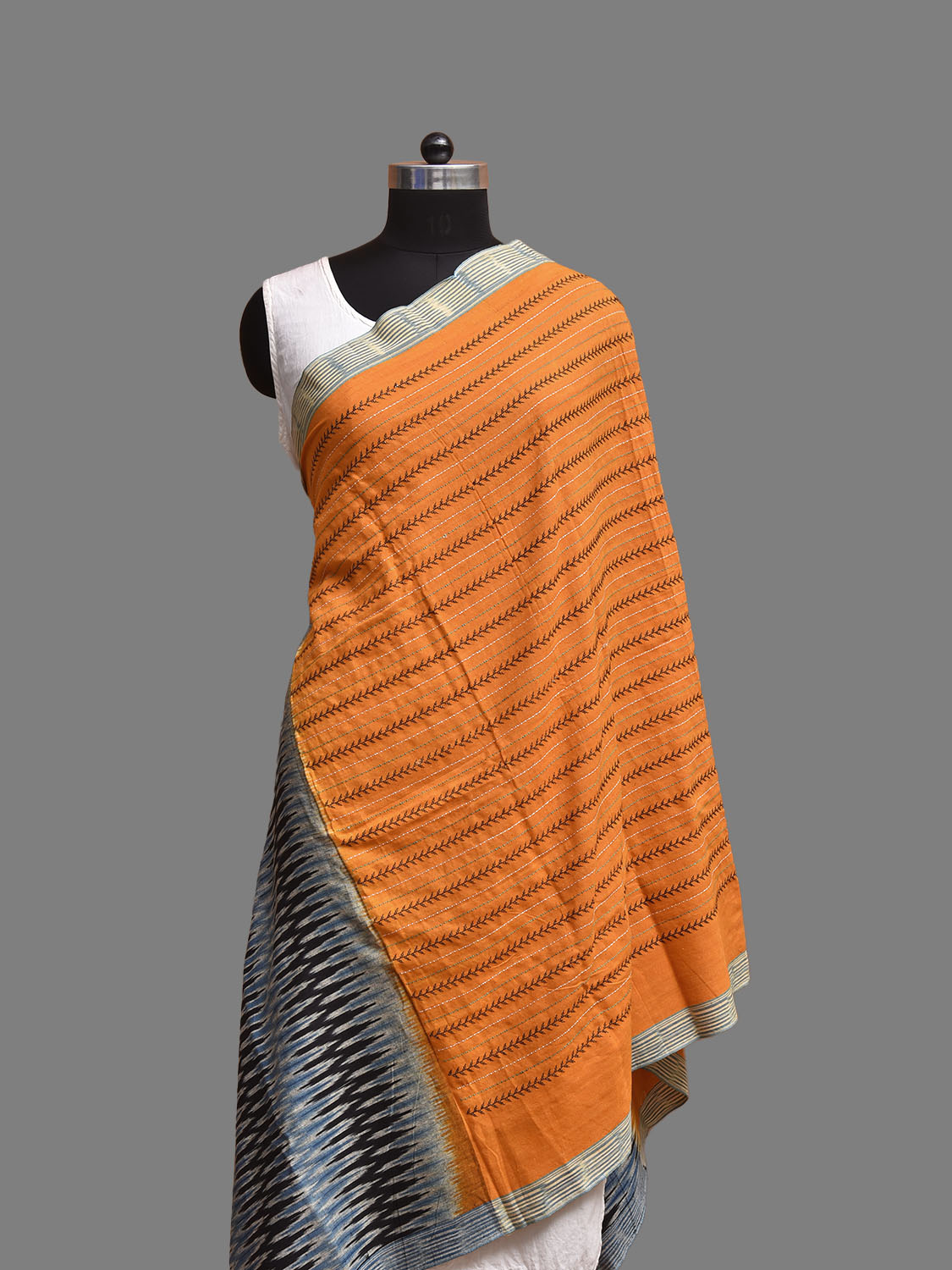 Orange and Black Pochampally Ikat Cotton Handloom Dupatta with Embroidary Strips Design. This Handloom Dupatta has been woven using the resist-dyeing, which produces the unique patterns adorning the fabric. We advise gentle handwash separately for fabric care.