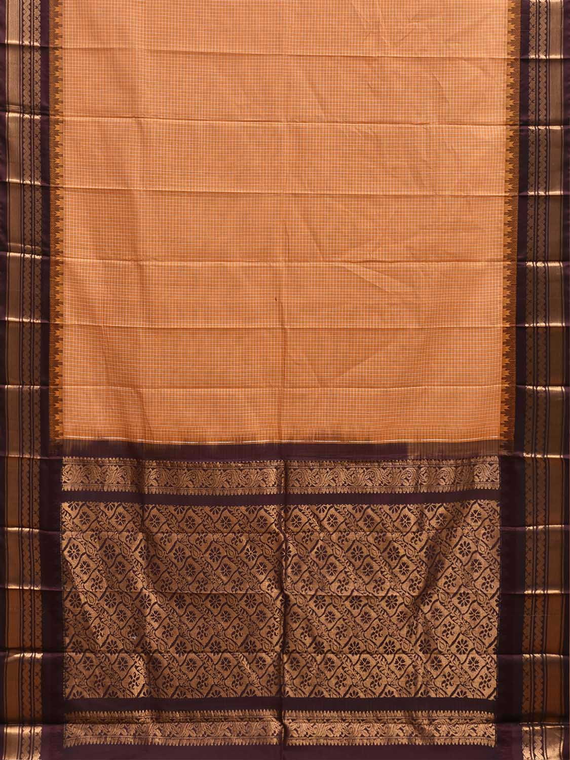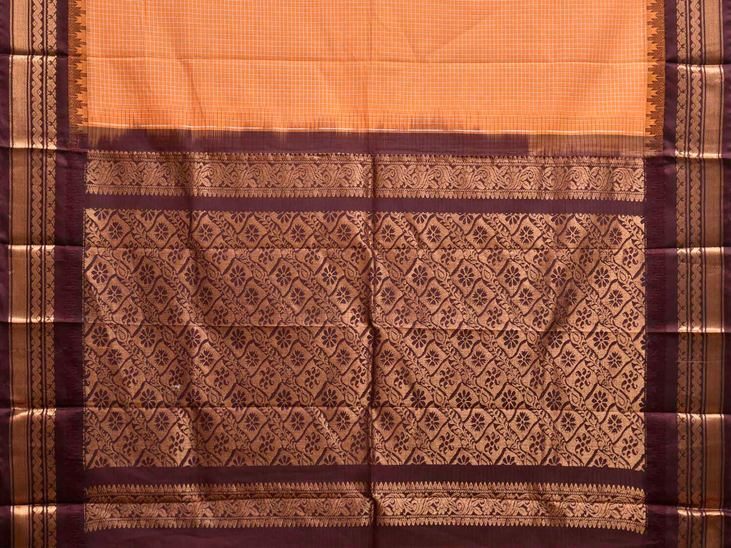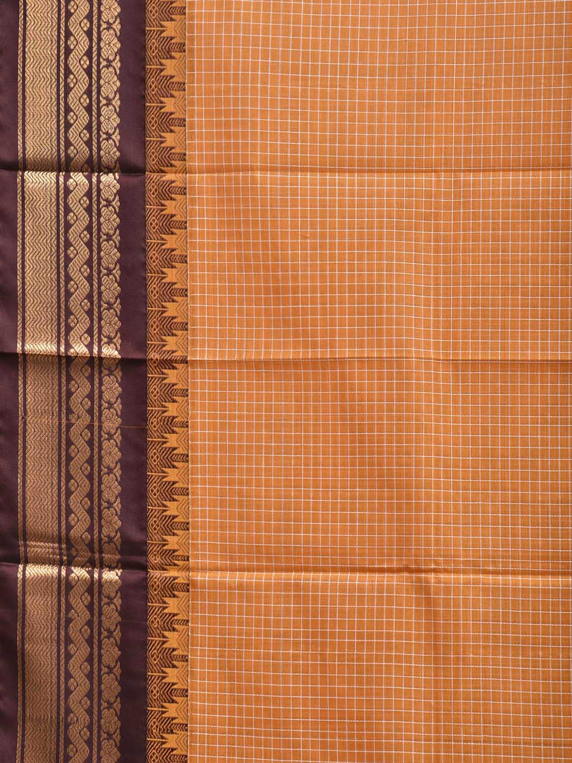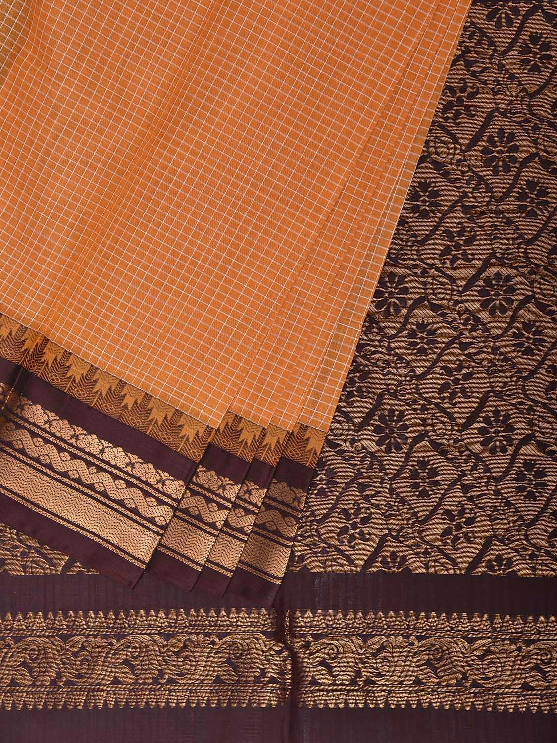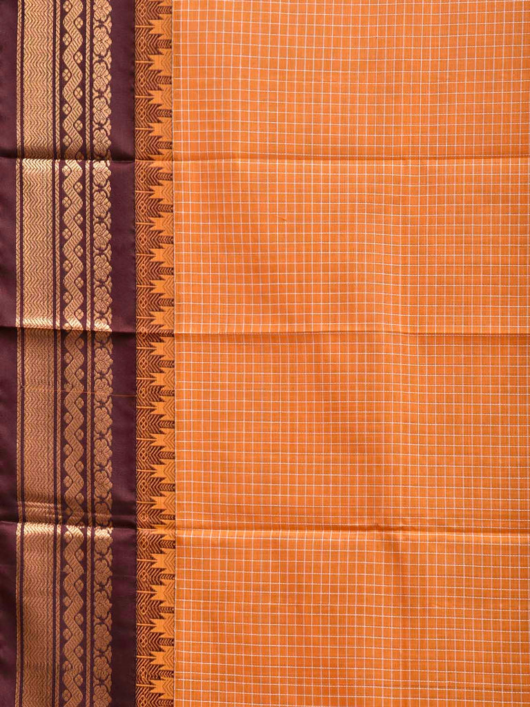 Orange and Brown Gadwal Cotton Viscose Saree with Checks and Pallu Design No Blouse. Gadwal Sarees are known for their traditional design of border and pallu made of silk and body being either cotton or silk. They are known as Sico sarees for border and pallu being silk and body being cotton. We advice dry clean for fabric care. This saree has no blouse.