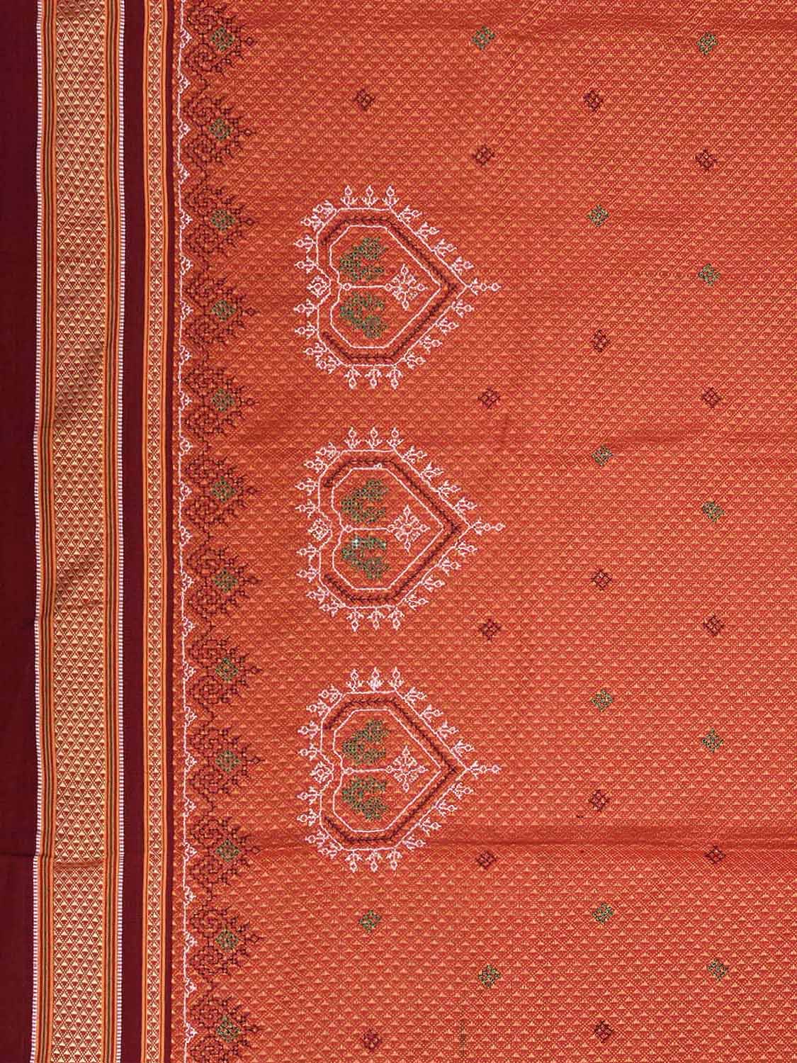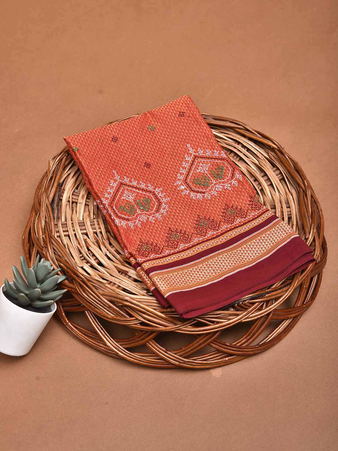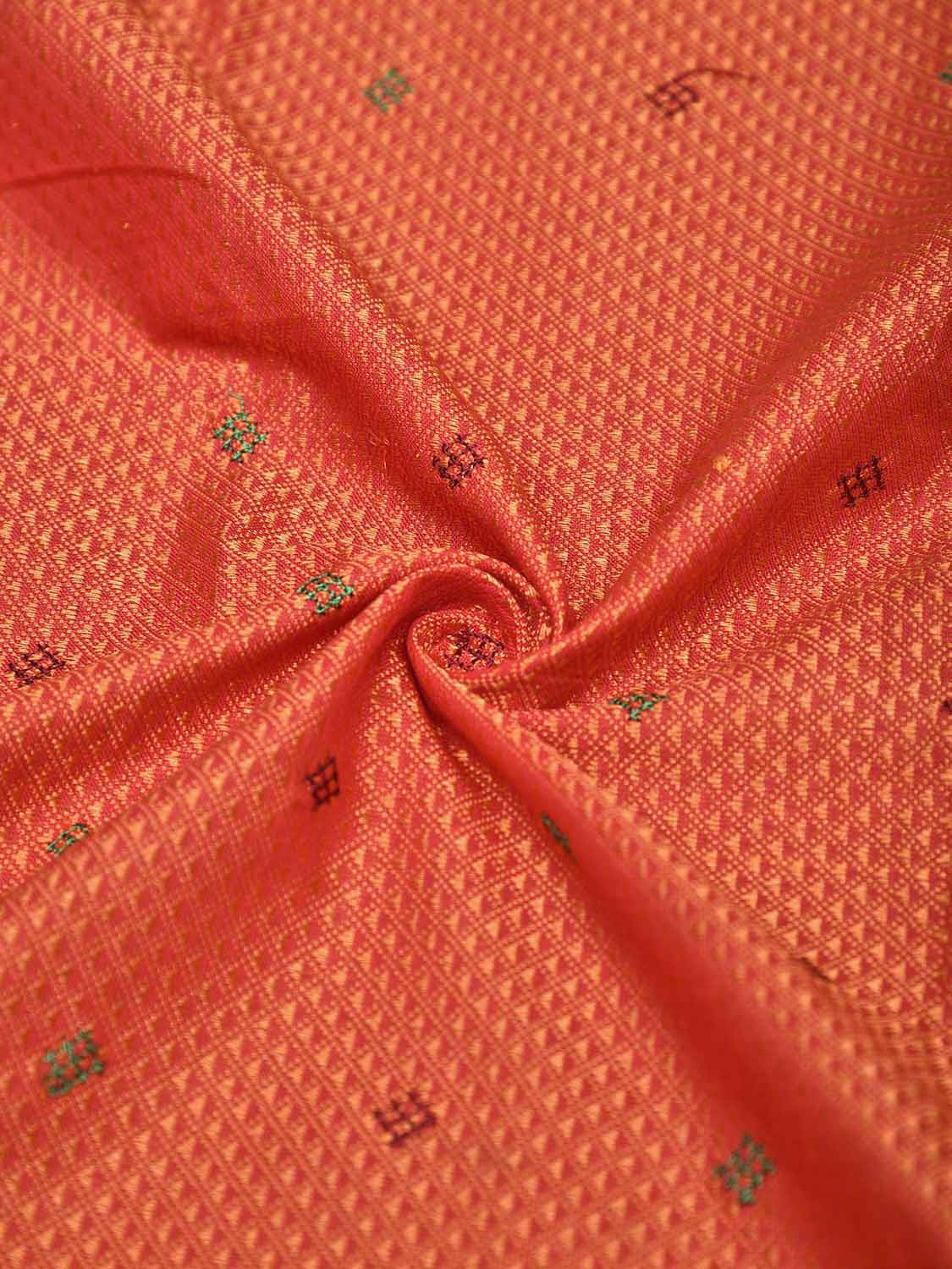Orange and Dark Red Kasuti Jacquard Viscose Blouse with Peacocks Design Length 1mt Width 36 Inches. Beautiful Pattern Blouse Fabric and Easy to Match to Any Suitable Saree. We Advise Gentle Handwash for Fabric Care.