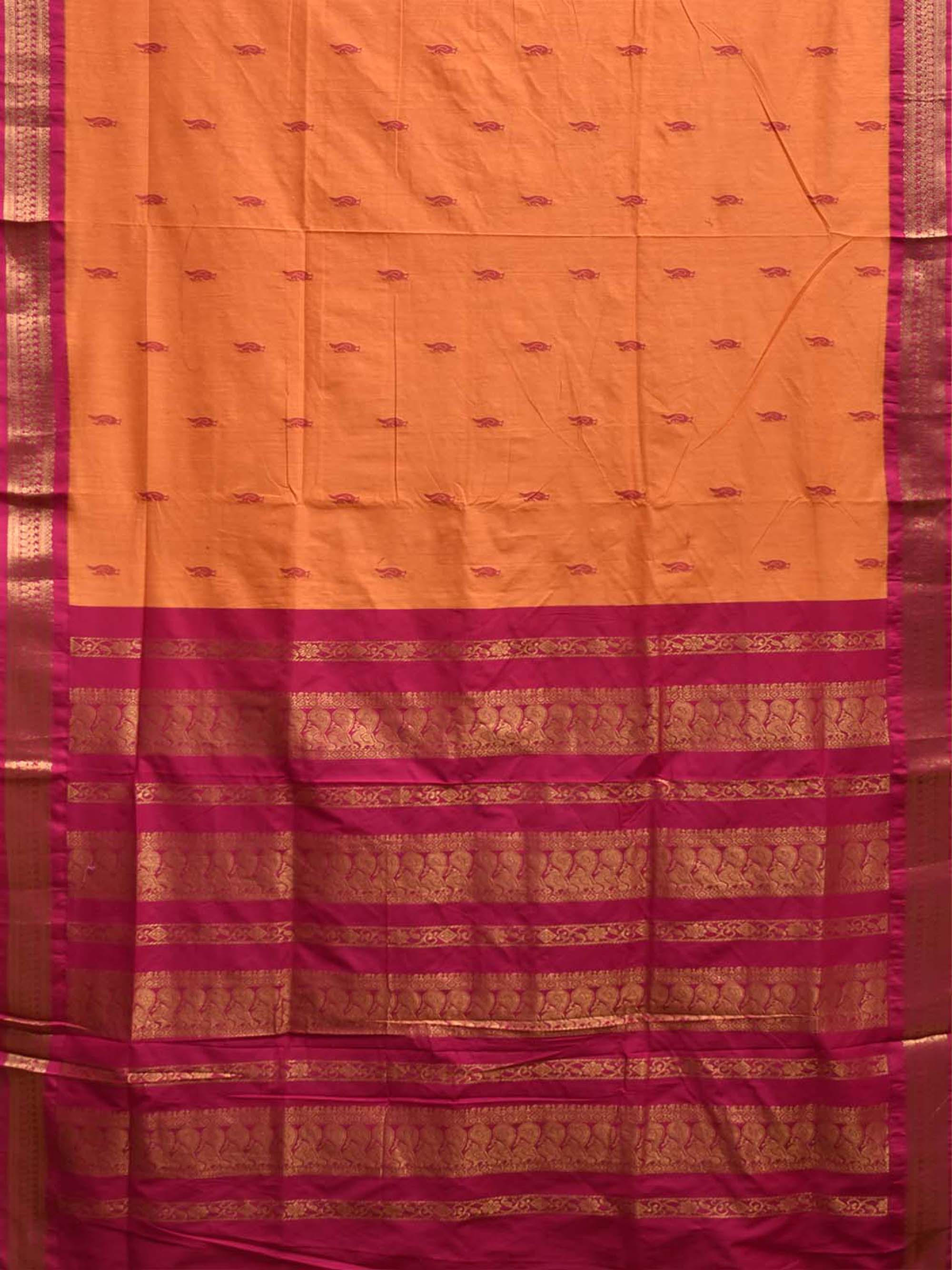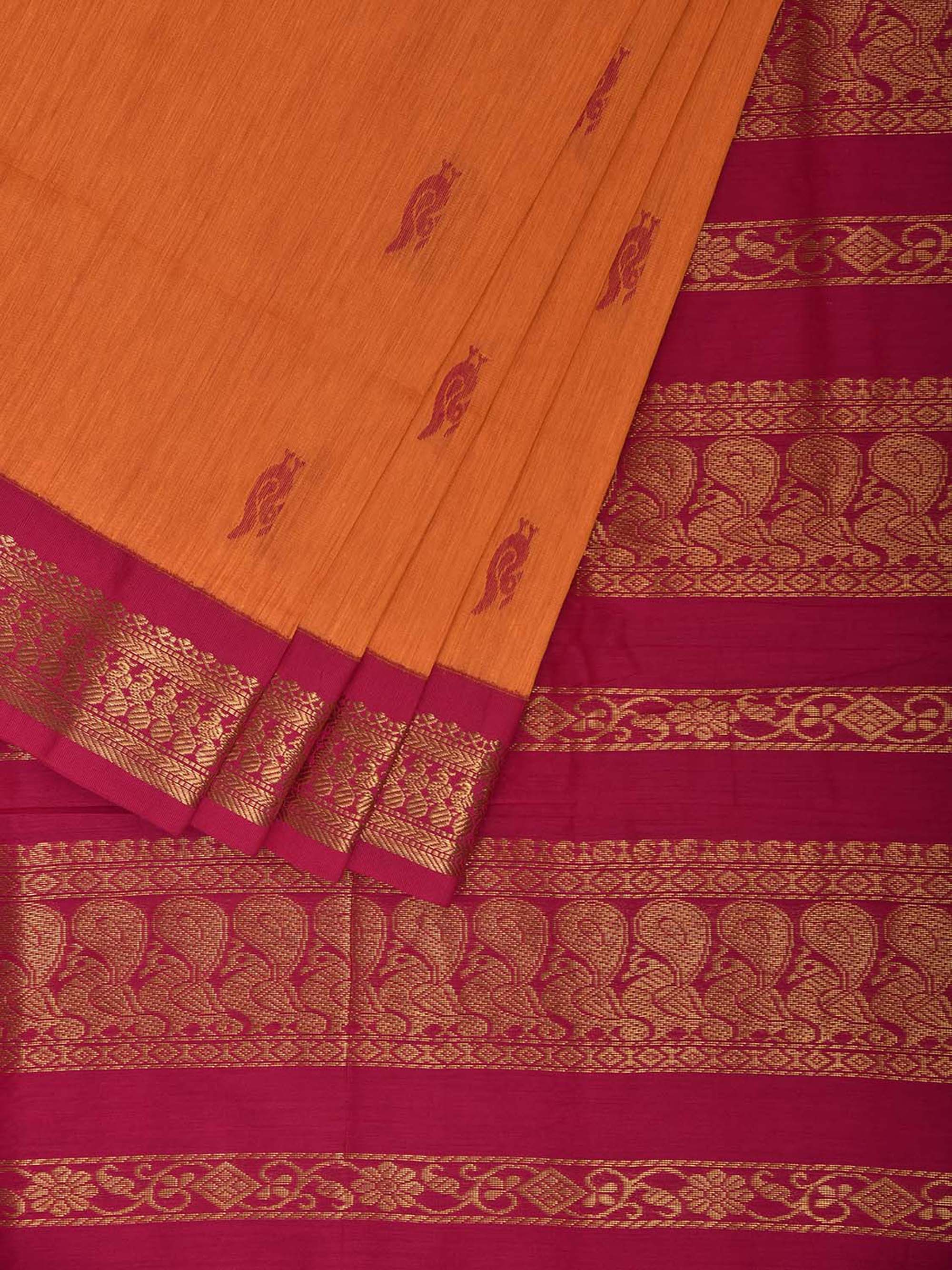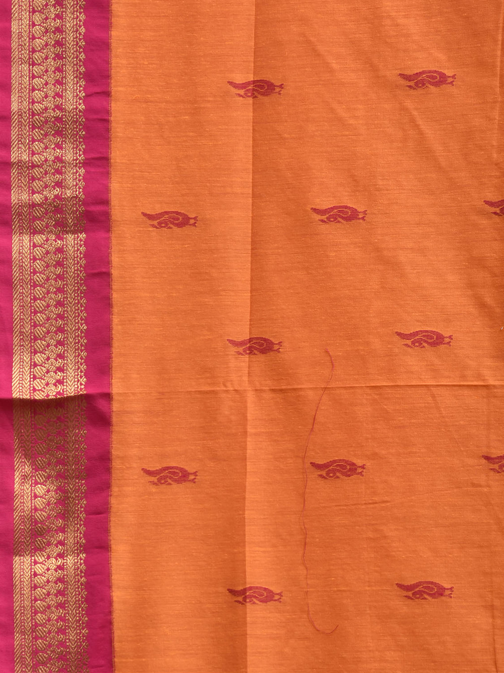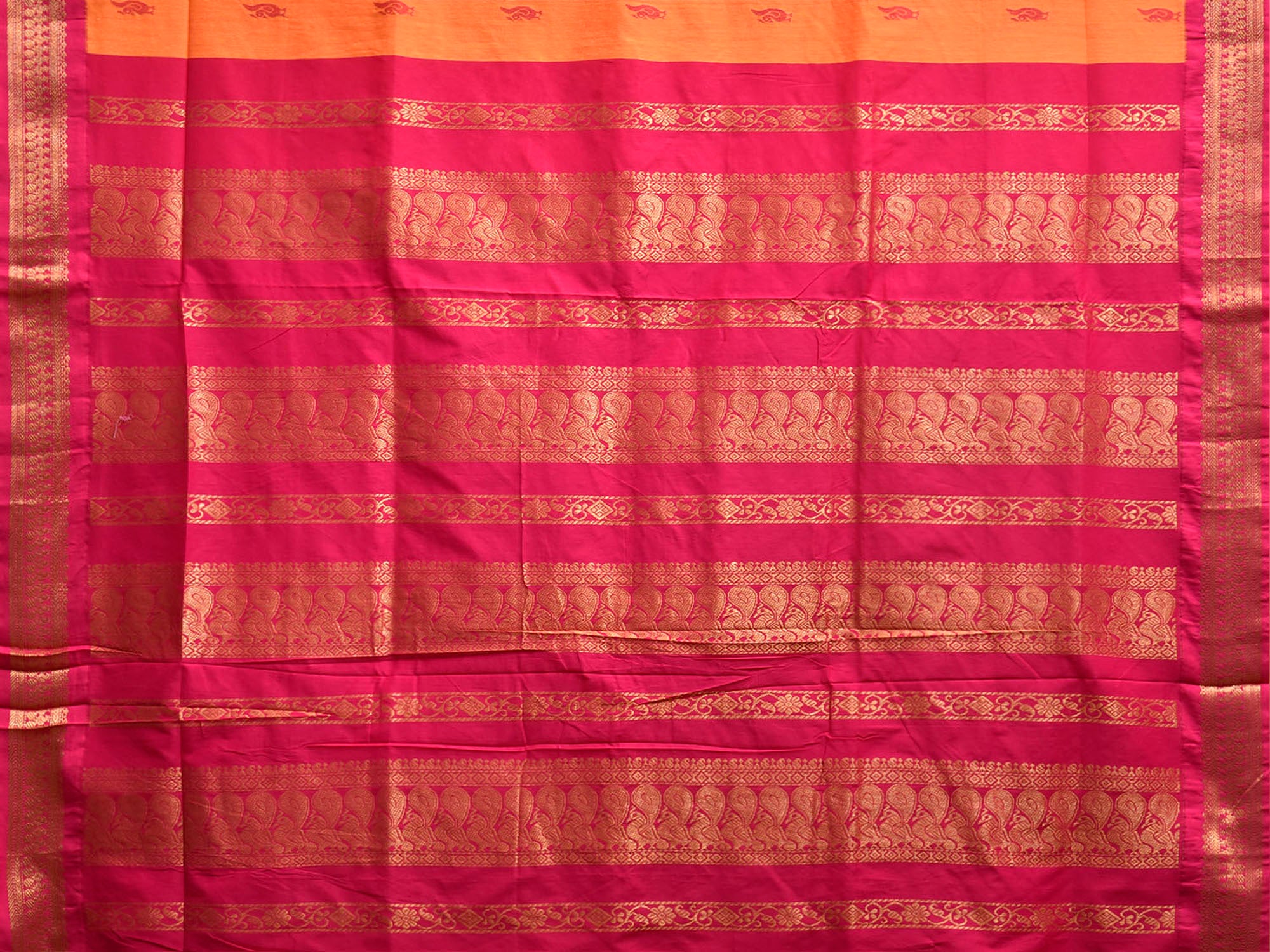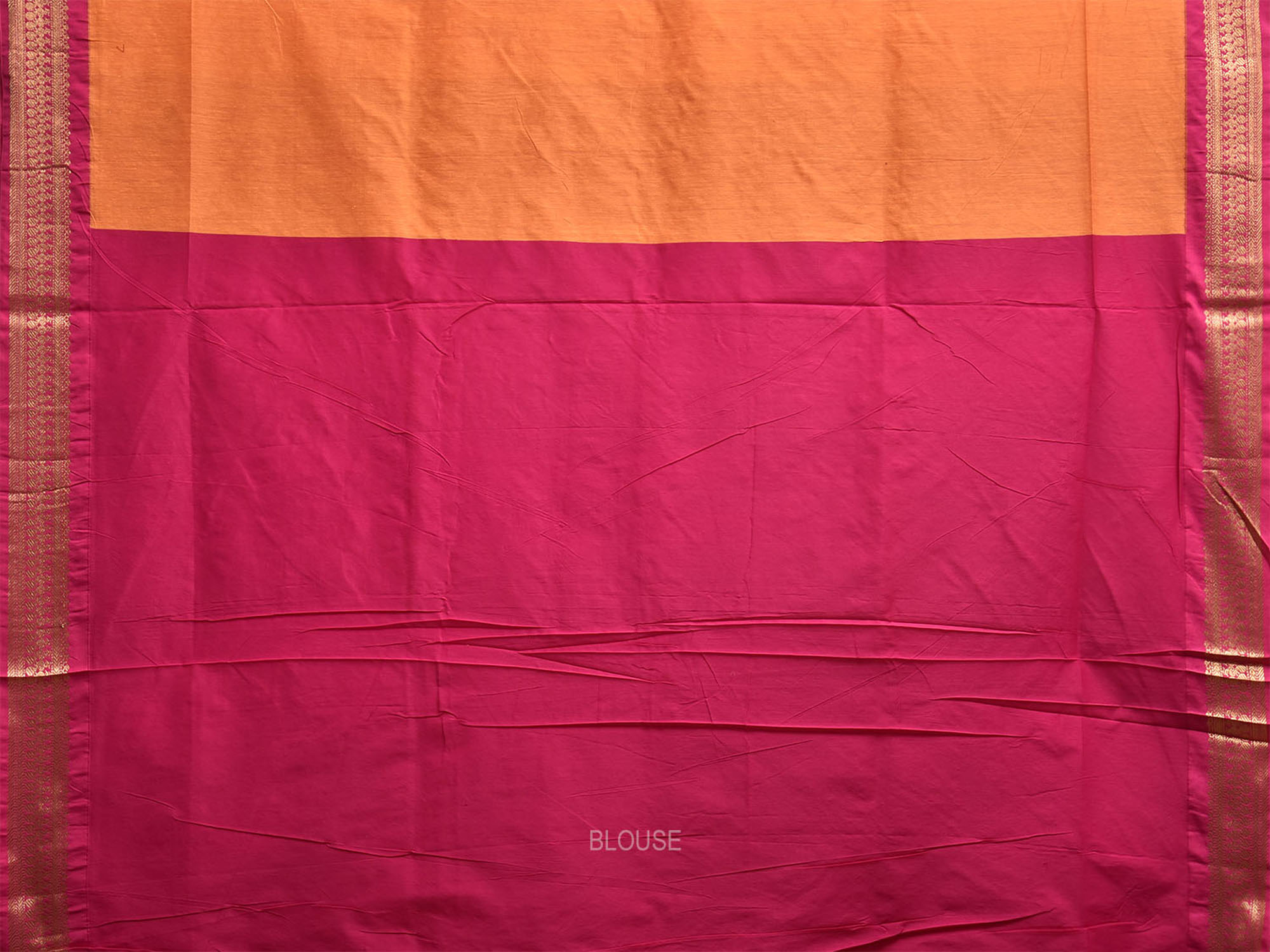 Orange and Pink Gadwal Cotton Viscose Saree with Pallu Design. Gadwal Sarees are known for their traditional design of border and pallu made of silk and body being either cotton or silk. They are known as Sico sarees for border and pallu being silk and body being cotton. We advice dry clean for fabric care.