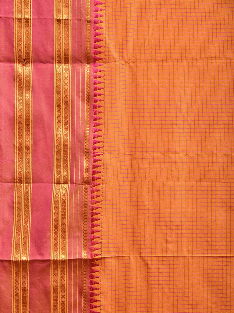 Orange and Pink Narayanpet Silk Handloom Saree with Checks Design No Blouse. These are Traditional Narayanpet Design Sarees. For fabric care we advise dry clean. This Saree has no Blouse.