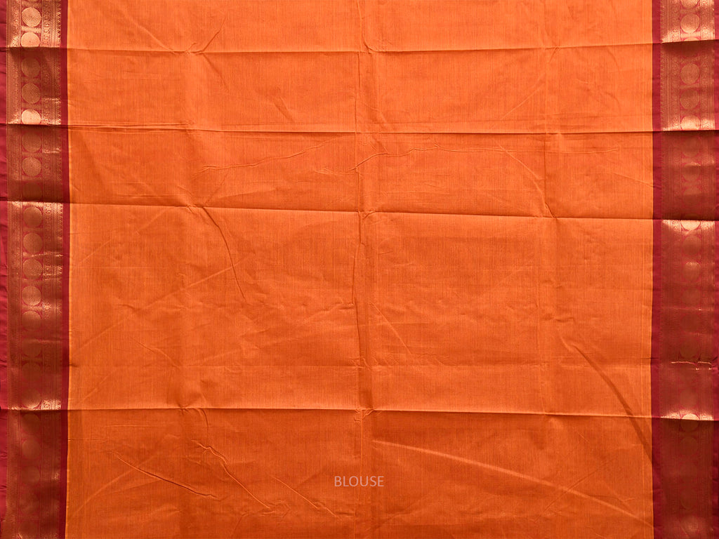 Orange and Red Kanchipuram Cotton Saree with Pallu and Border Design. Traditional Simple South Indian Attire Saree for any Casual Occasions. As it’s a cotton saree we advice gentle handwash separately for fabric care.