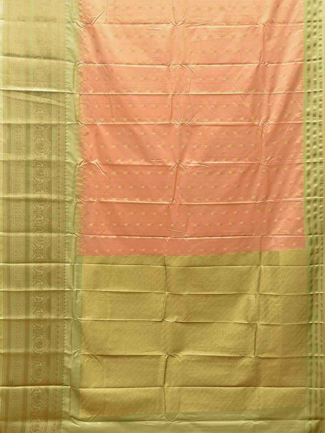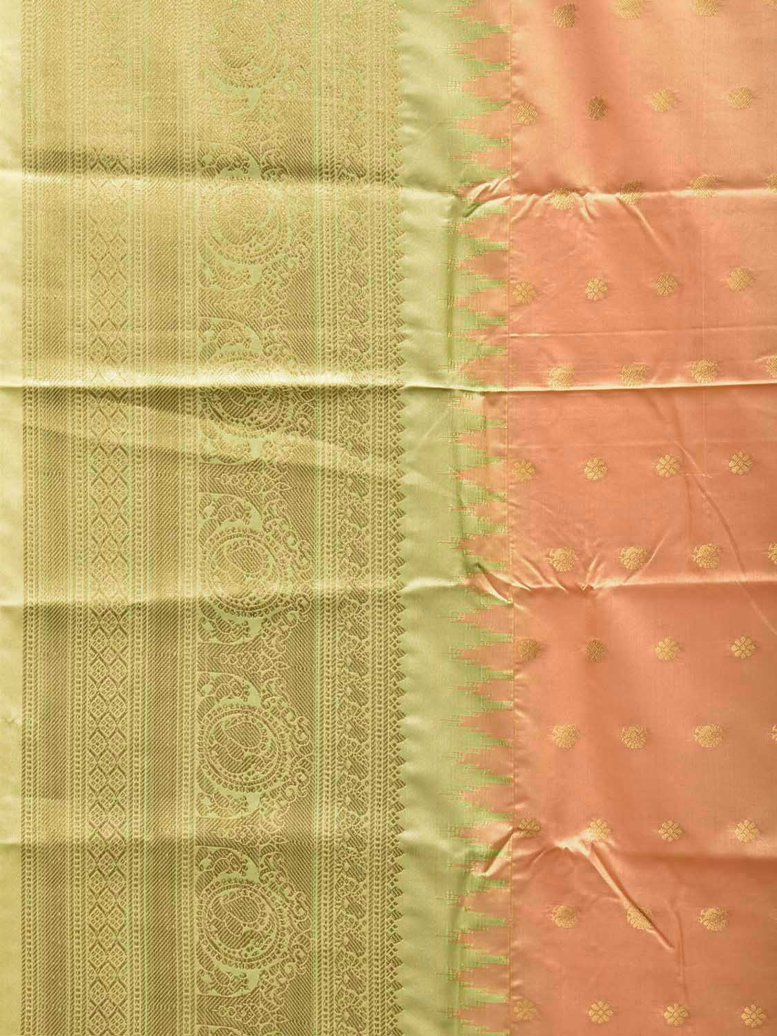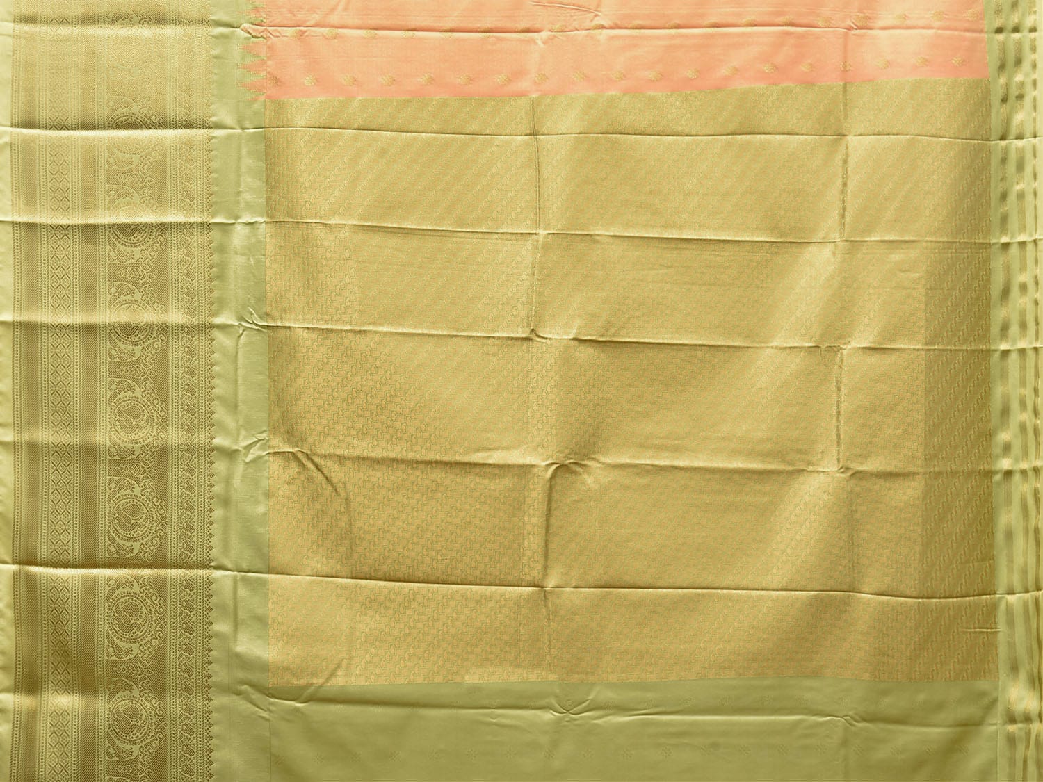 Peach and Light Green Gadwal Viscose Silk Saree with Pallu and Border Design. Gadwal Sarees are known for their traditional design of border and pallu made of silk and body being either cotton or silk. They are known as Sico sarees for border and pallu being silk and body being cotton. We advice dry clean for fabric care.