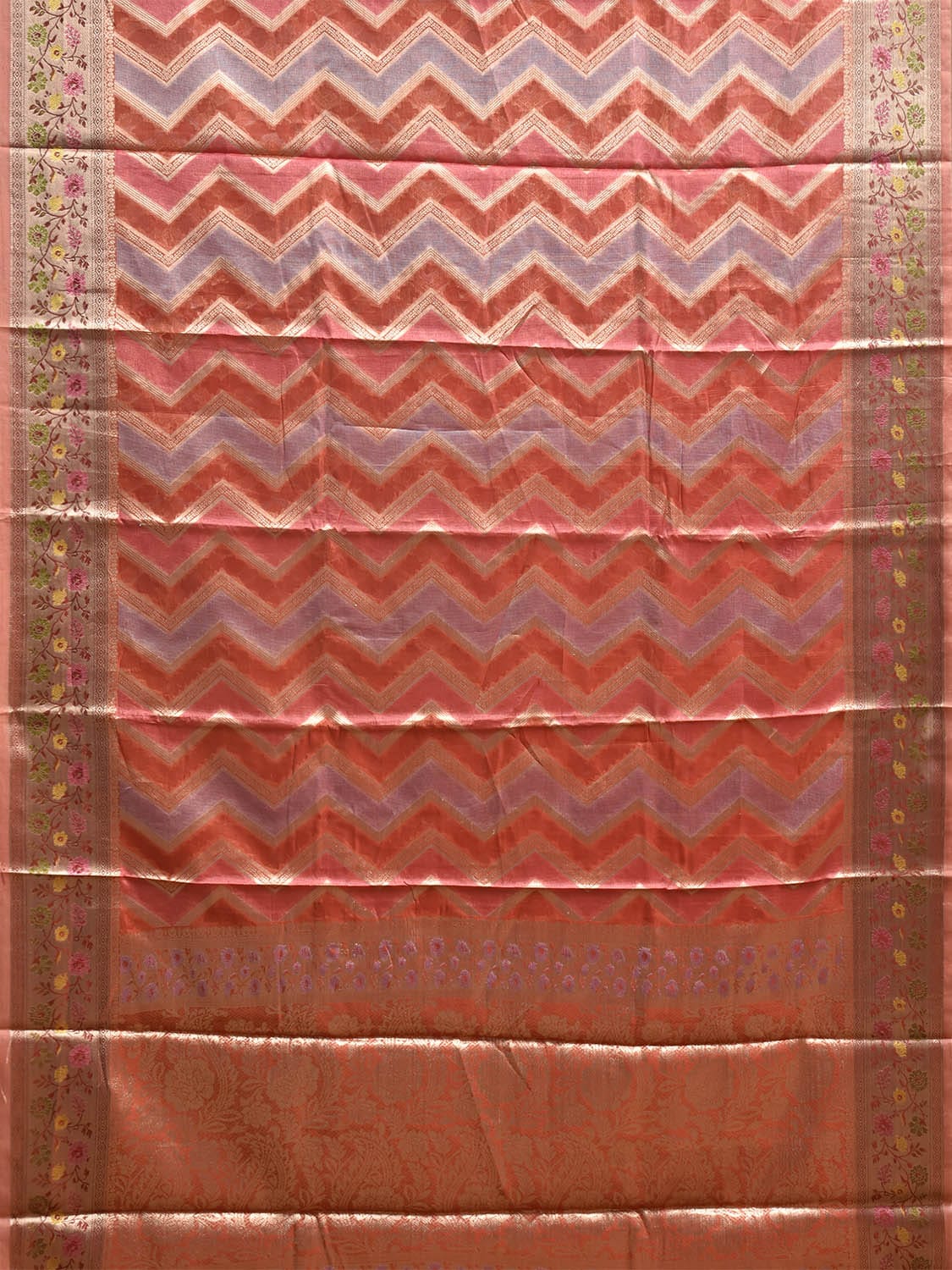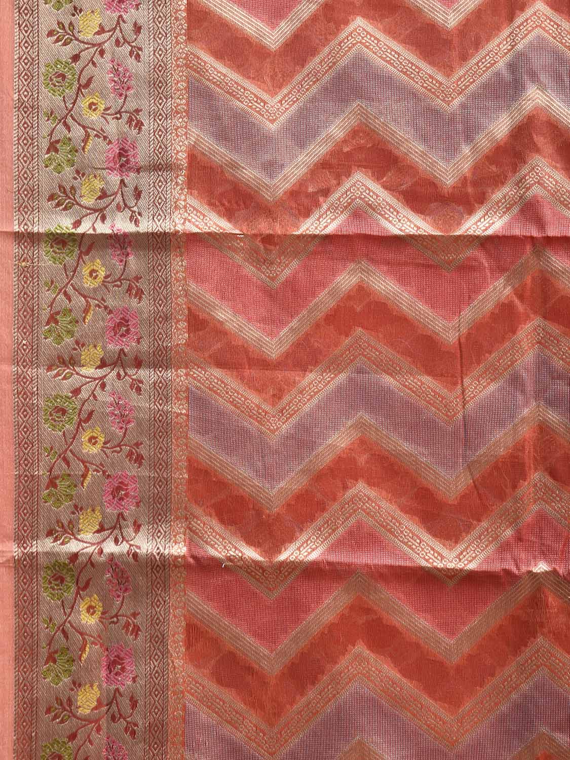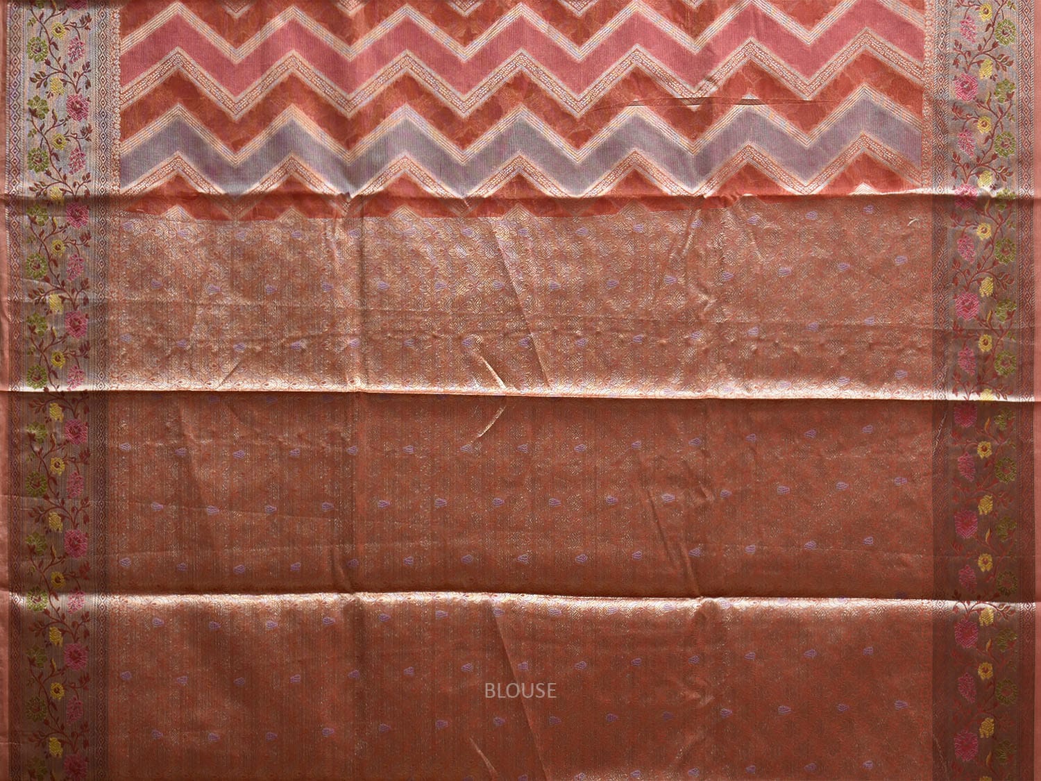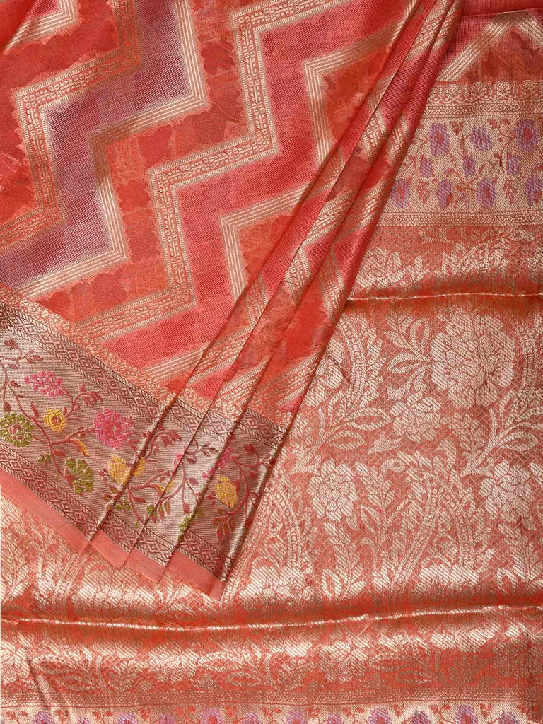 Peach Banaras Tissue Saree with Zig-Zag and Border-Pallu Design. Banaras Sarees are considered one of finest sarees with gold or silver zari work, and colorful design makes it the saree for various occassions. For fabric care we advise dry clean.