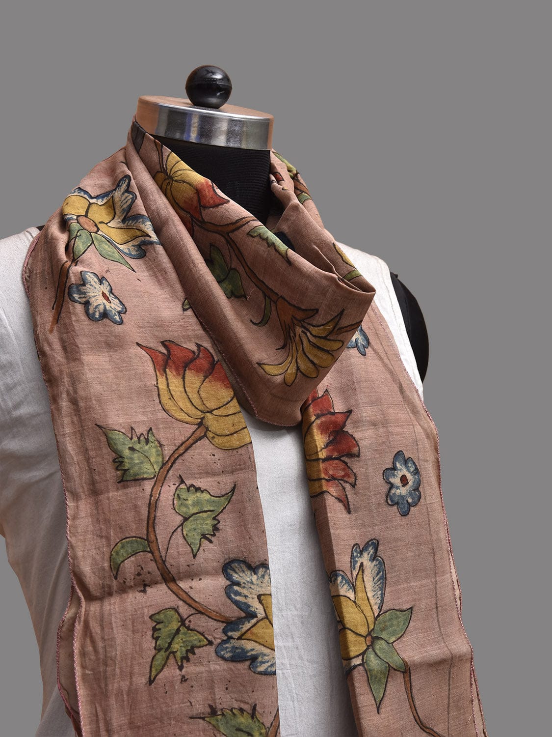 Peach Kalamkari Hand Painted Sico Stole with Lotus Flowers Design. This hand painted kalamkari is done using natural dyes. As they are natural colors they bleed with initial washes, so we suggest Dry clean.