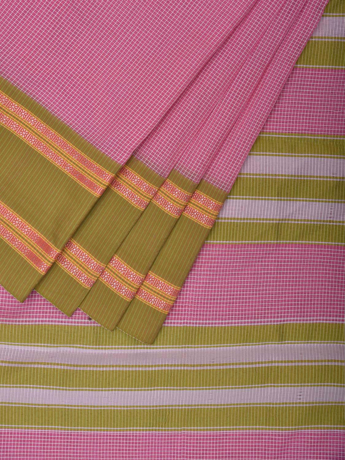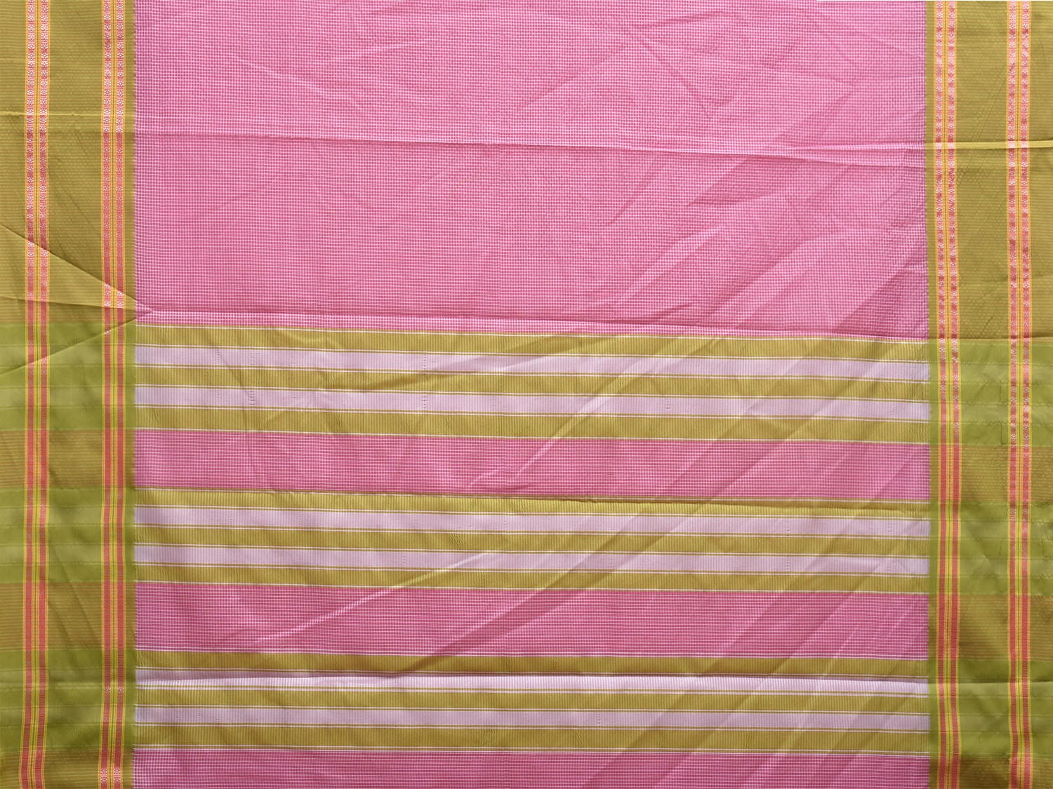 Pink and Green Bamboo Cotton Saree with Small Checks Design No Blouse. This is a blend of bamboo and cotton fibers, they have characteristics of both bamboo and cotton combined into one fabric. We Advise Gentle Handwash for Fabric Care. This Saree has no Blouse.