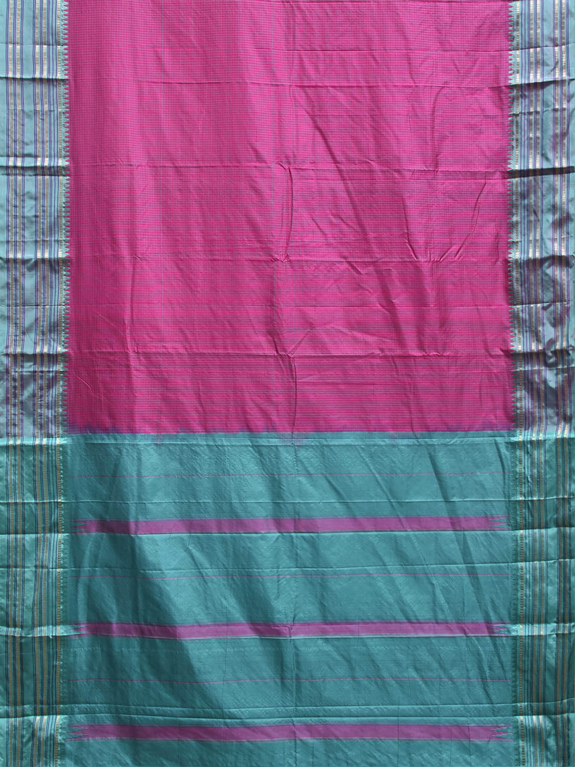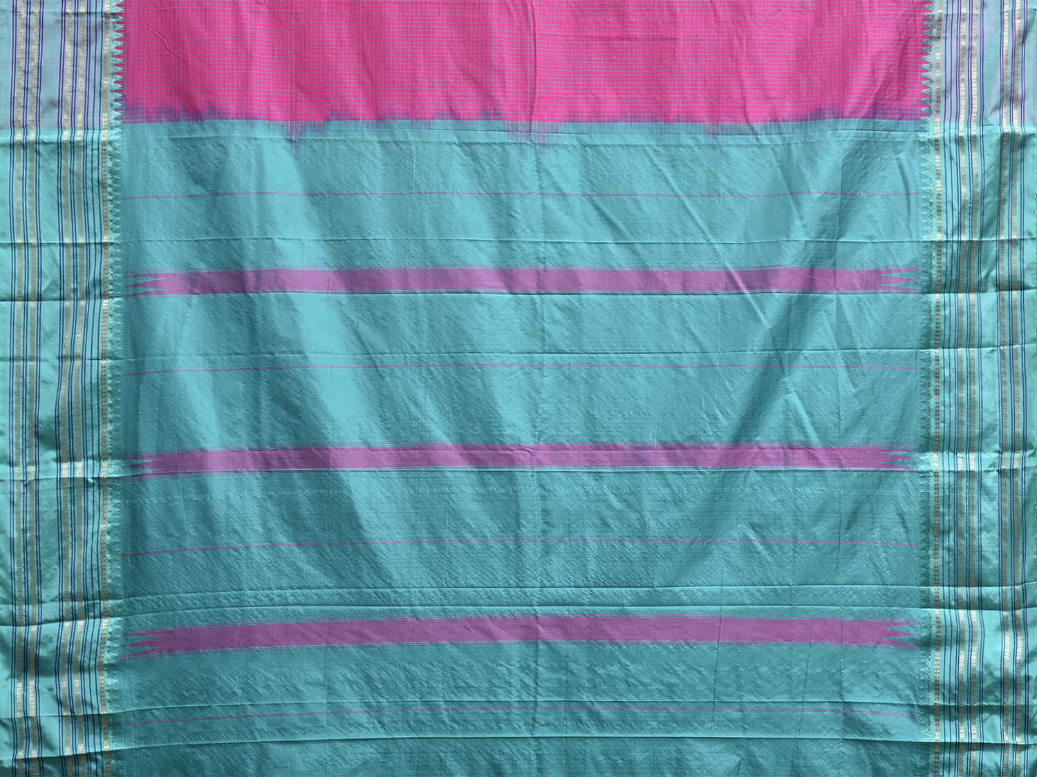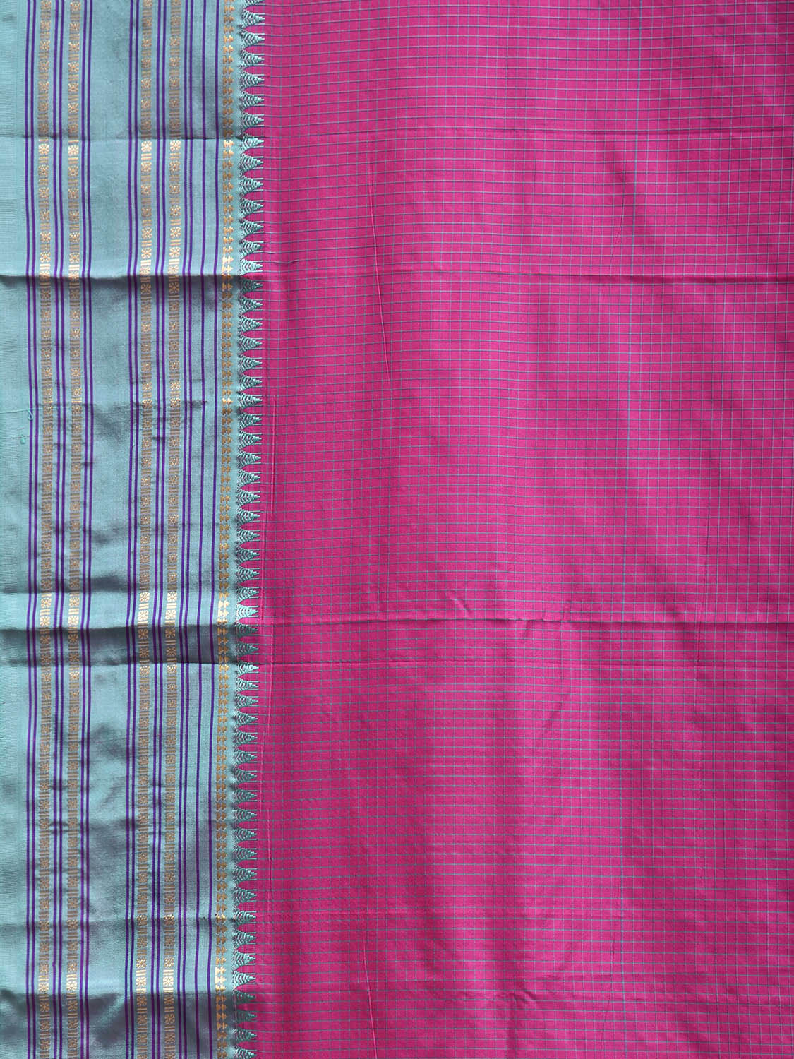 Pink and Light Blue Narayanpet Silk Saree with Checks and Contrast Pallu Design