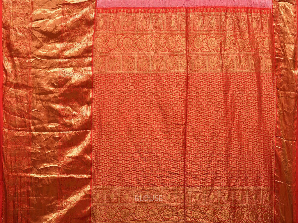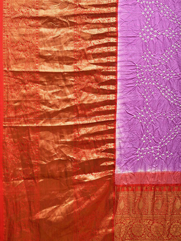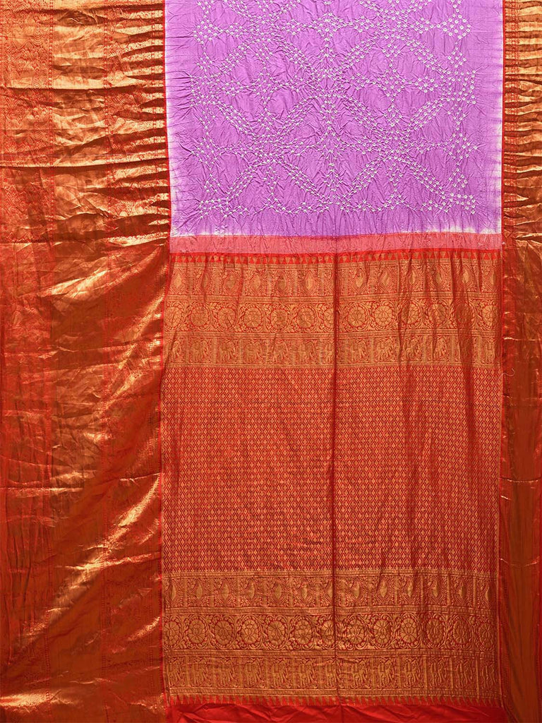 Pink and Red Bandhani Kanchipuram Silk Handloom Saree with Big Border and Pallu Design. Bandhani is done by tie-dye technique by plucking the cloth with fingernails and binding them into different designs as required. We advice dry clean for fabric care and initially soak in water (unless kalamkari work) following with steam iron or rolling of saree before use.