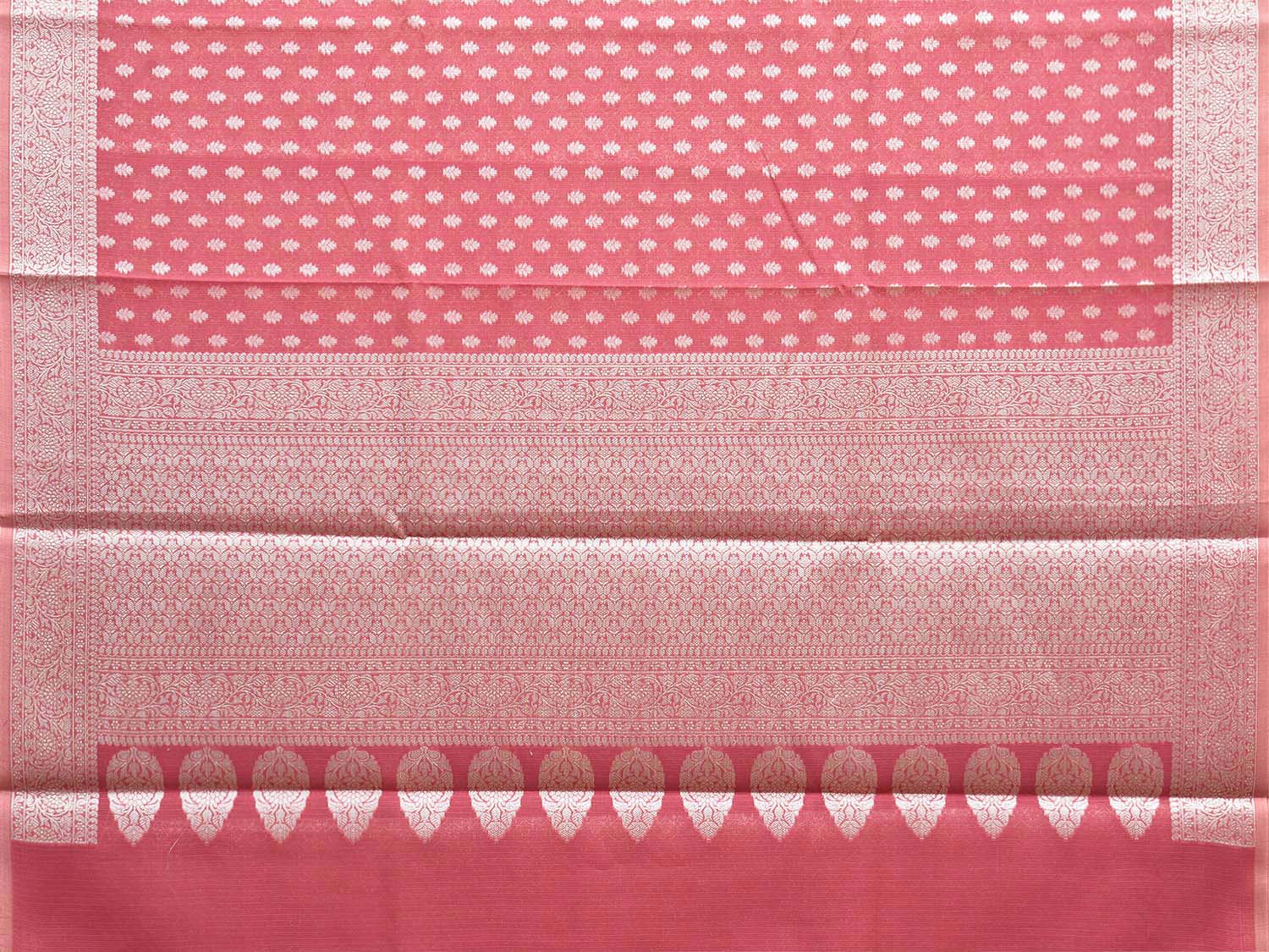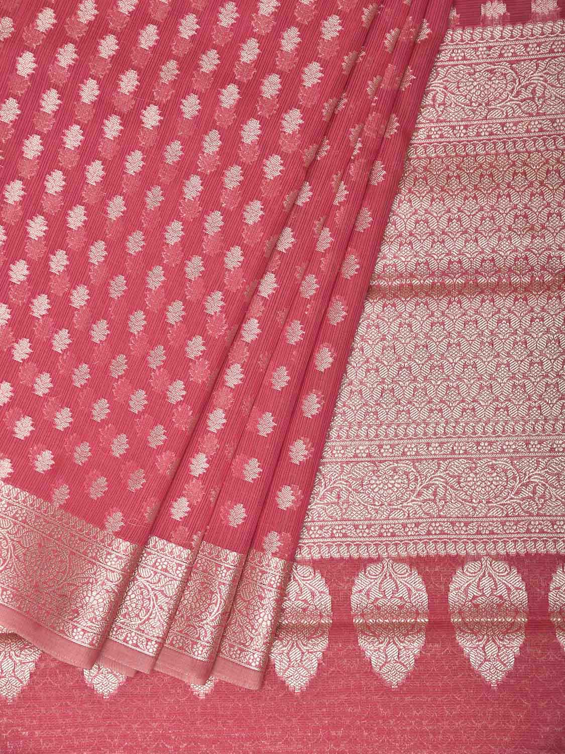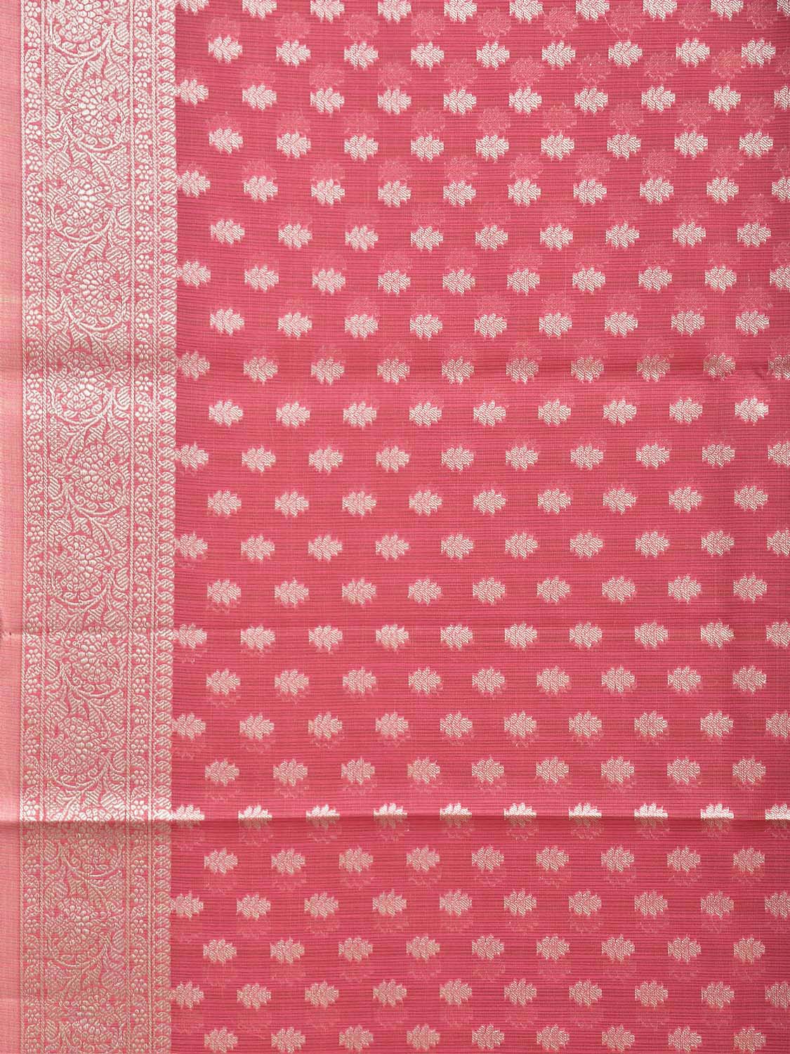 Pink Dhakai Jamdani Cotton Viscose Saree with Body Buta and Border Design. These are some of the traditional Dhakai Jamdani designs, these sarees have geometric designs and sometimes floral or combination of both. We advice gentle handwash separately for fabric care.