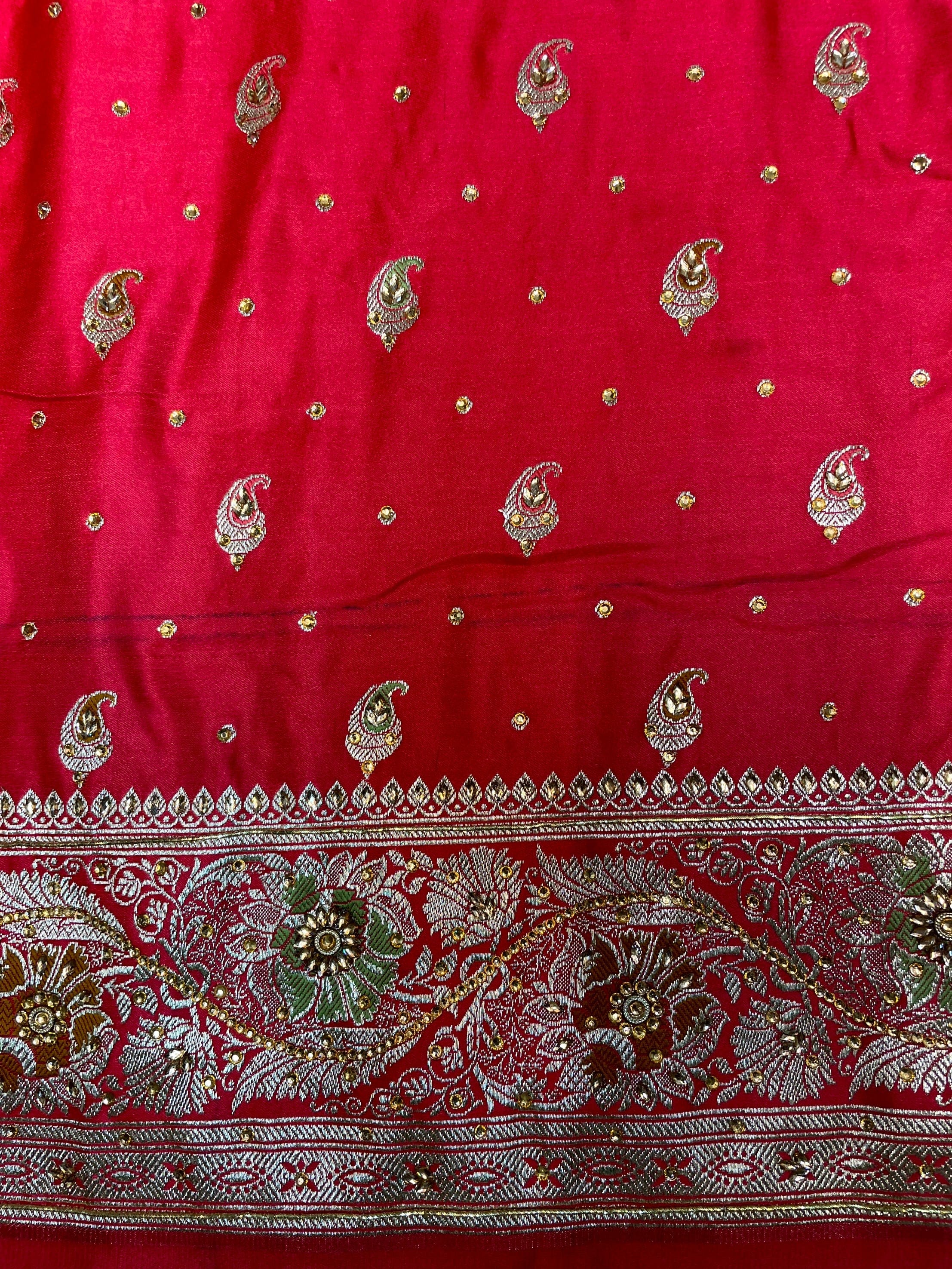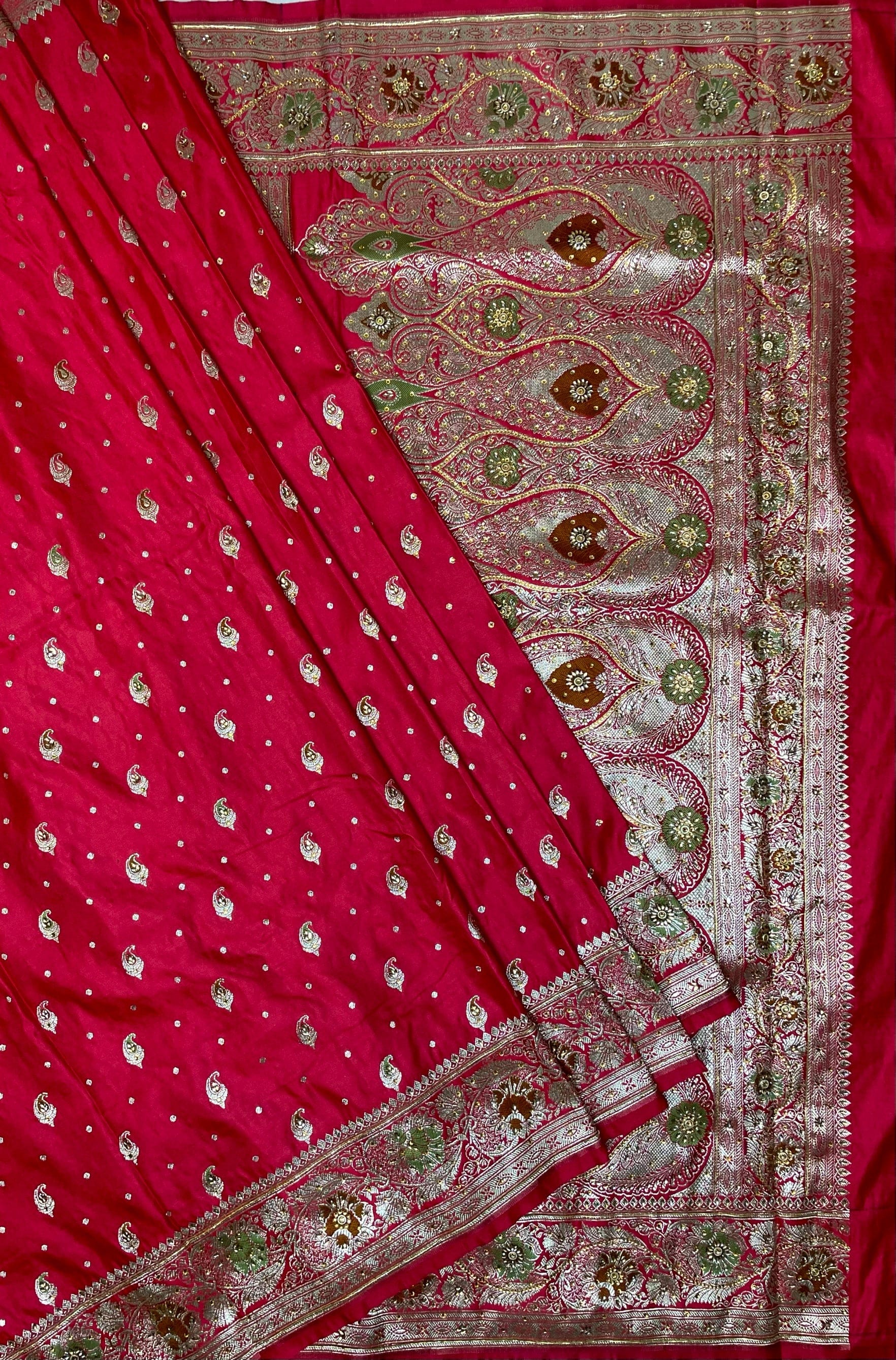 Drape yourself in timeless elegance with this exquisite emerald green Banarasi silk saree, adorned with delicate silver zari motifs throughout the body. The saree features an intricately woven floral and paisley border, complemented by a regal pallu with detailed brocade craftsmanship that reflects the rich heritage of Banaras.Perfect for weddings, festive occasions, and grand celebrations, this saree brings together tradition and luxury in every drape. The lustrous silk fabric adds a graceful fall and sheen, while the silver zari creates a stunning contrast that enhances its royal charm.