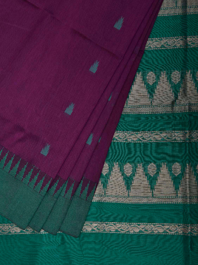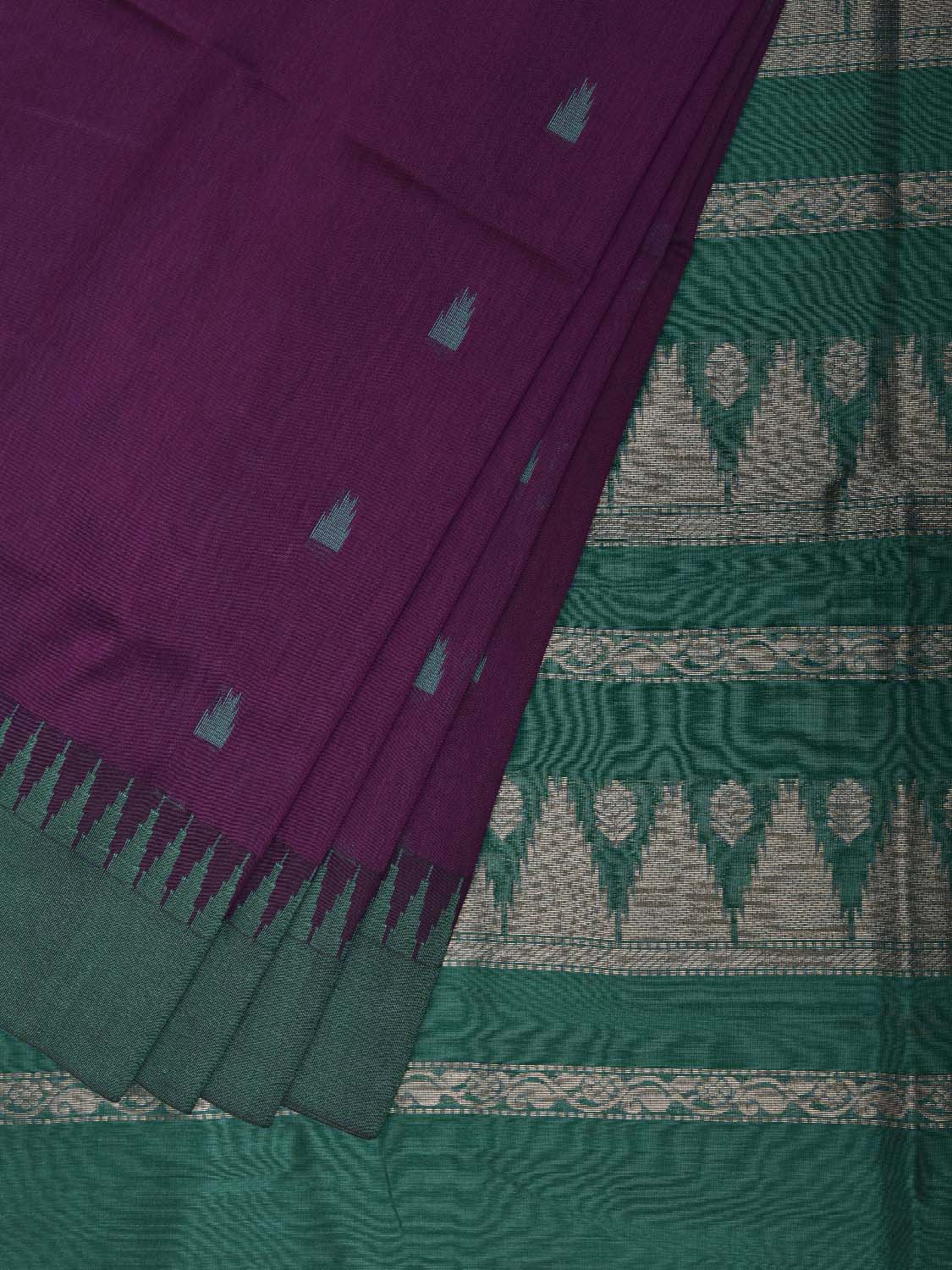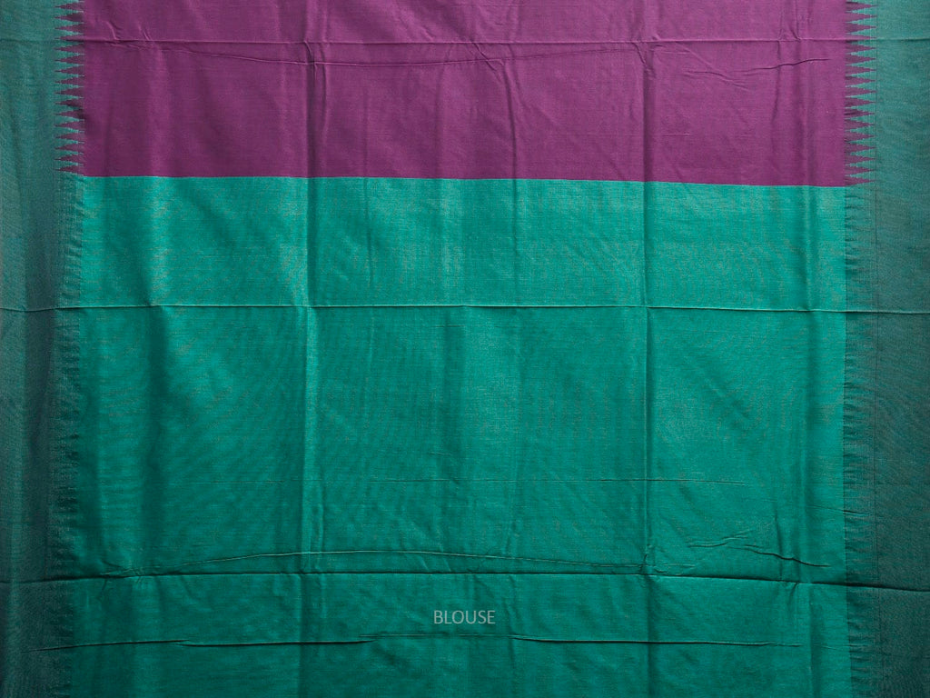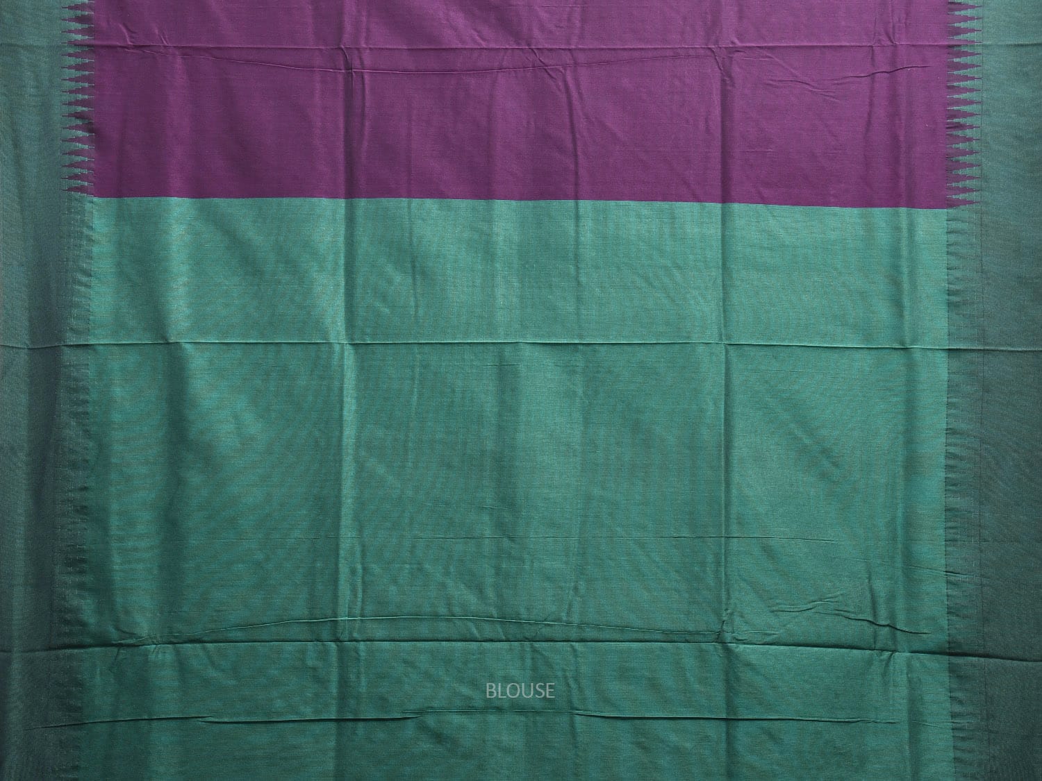 Purple and Green Gadwal Cotton Viscose Saree with Temple Border Design. Gadwal Sarees are known for their traditional design of border and pallu made of silk and body being either cotton or silk. They are known as Sico sarees for border and pallu being silk and body being cotton. We advice dry clean for fabric care.