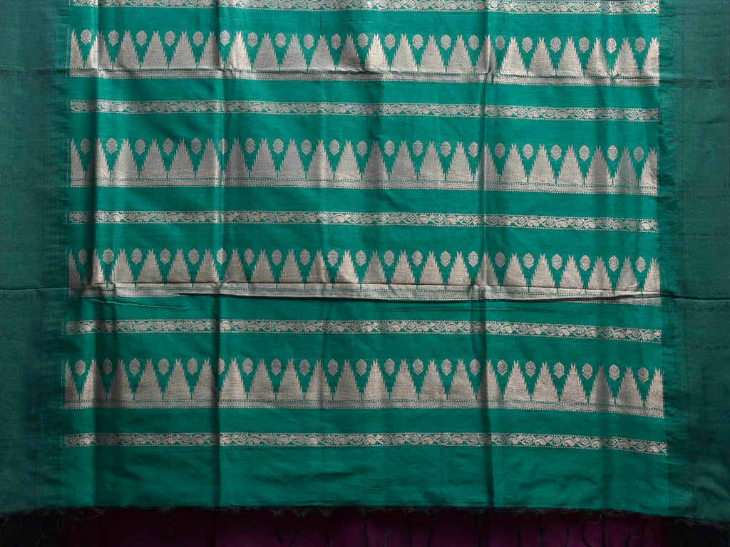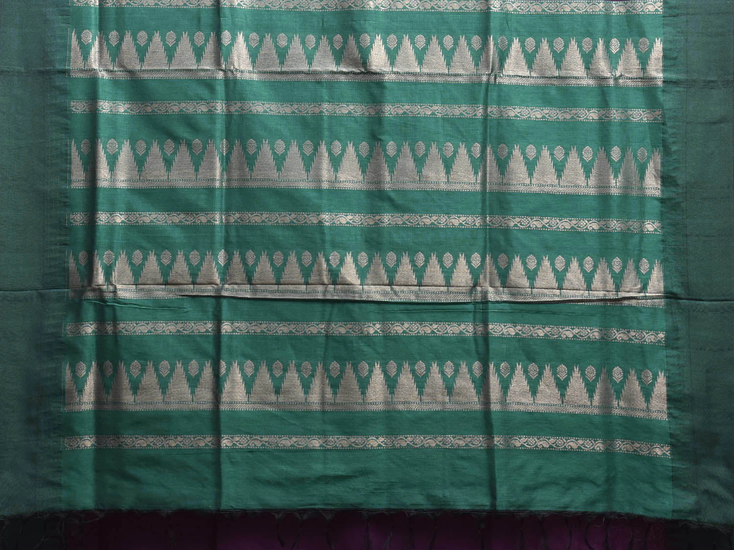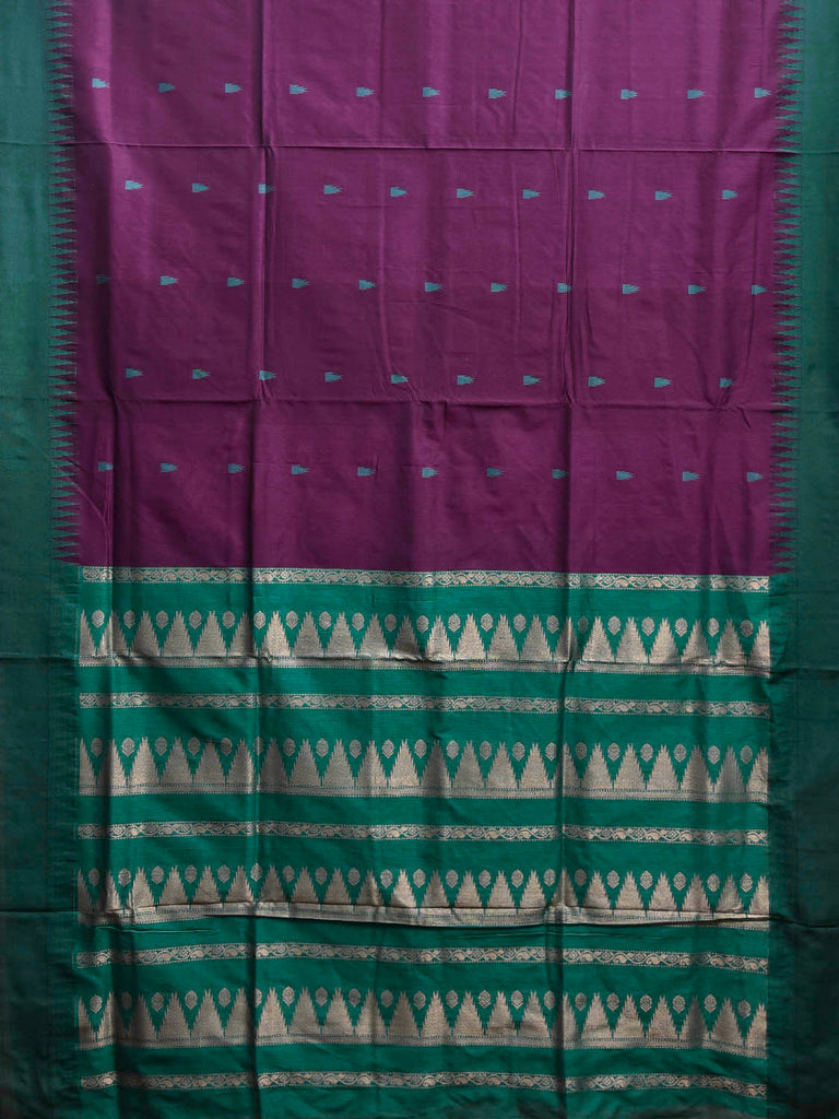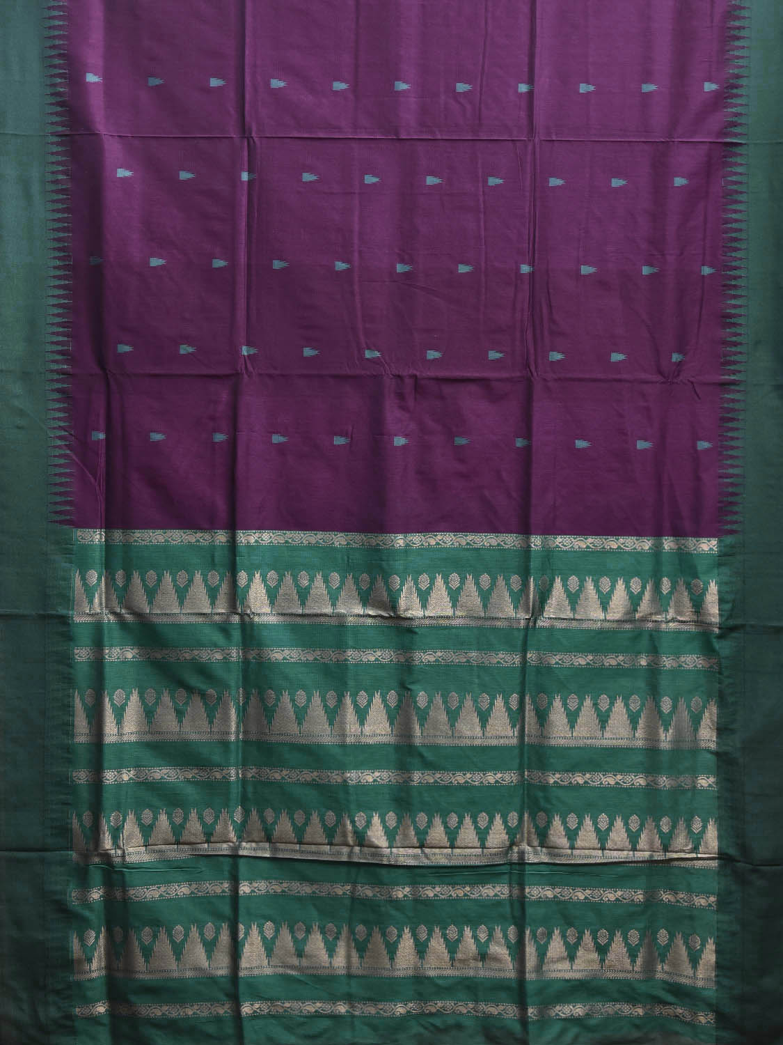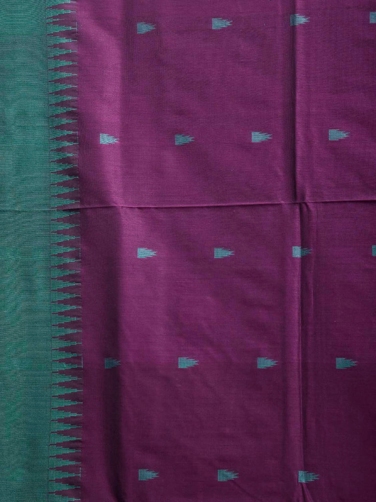 Purple and Green Gadwal Cotton Viscose Saree with Temple Border Design. Gadwal Sarees are known for their traditional design of border and pallu made of silk and body being either cotton or silk. They are known as Sico sarees for border and pallu being silk and body being cotton. We advice dry clean for fabric care.