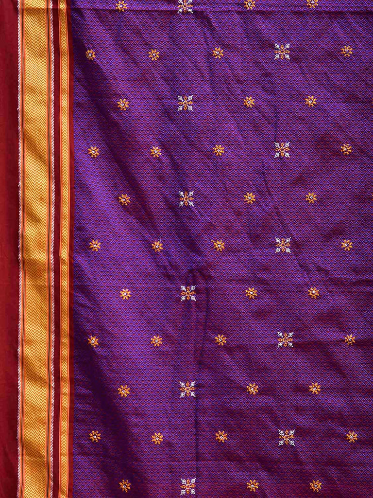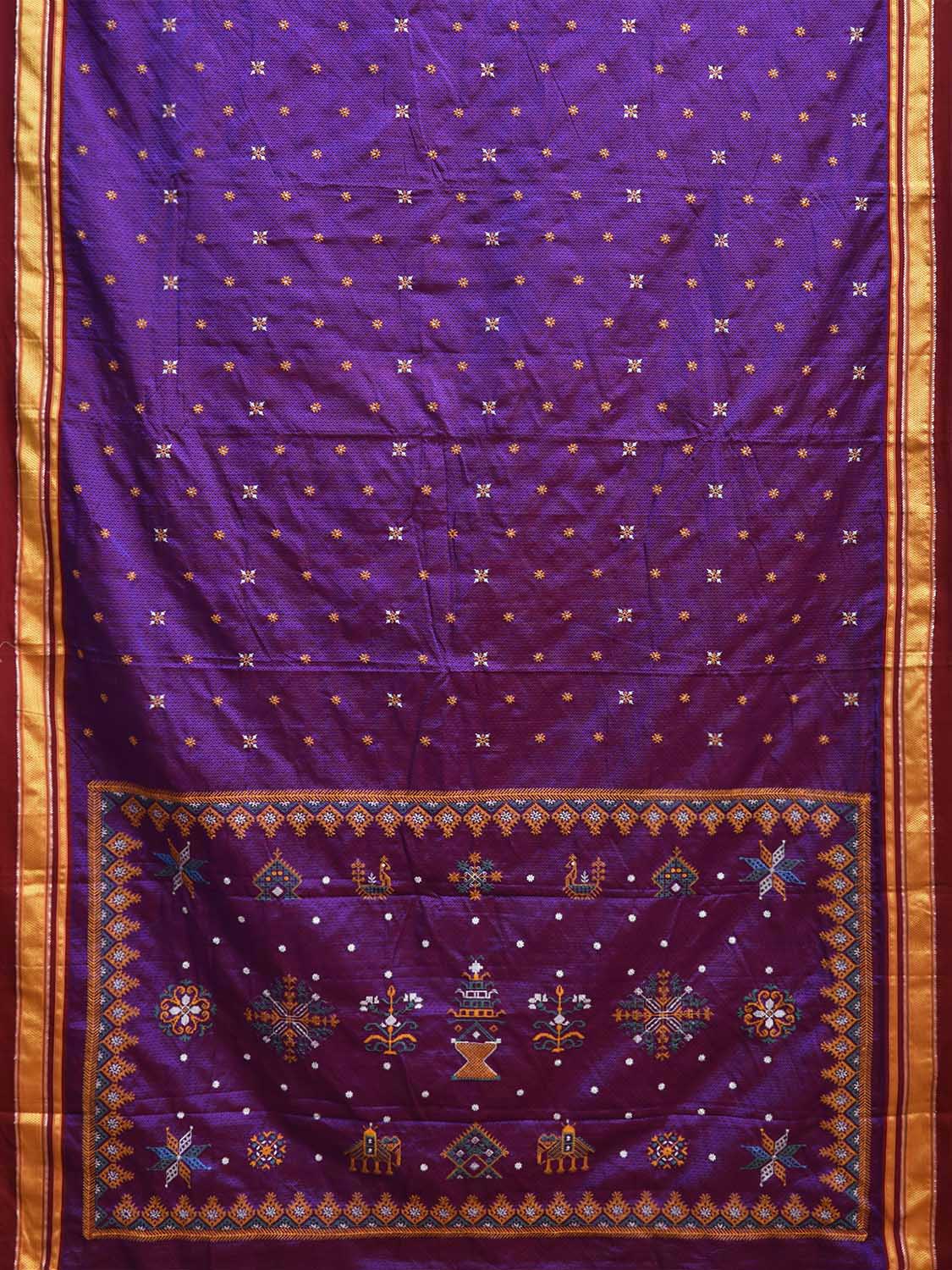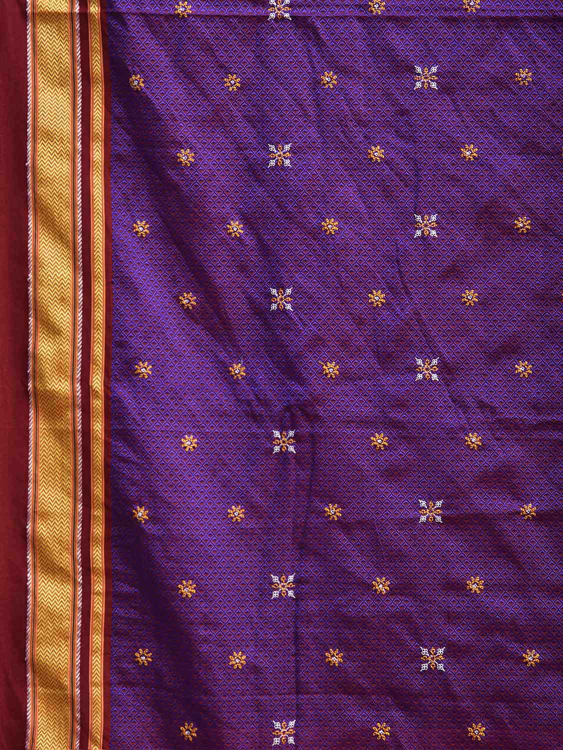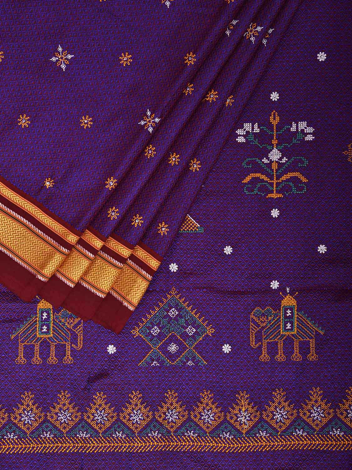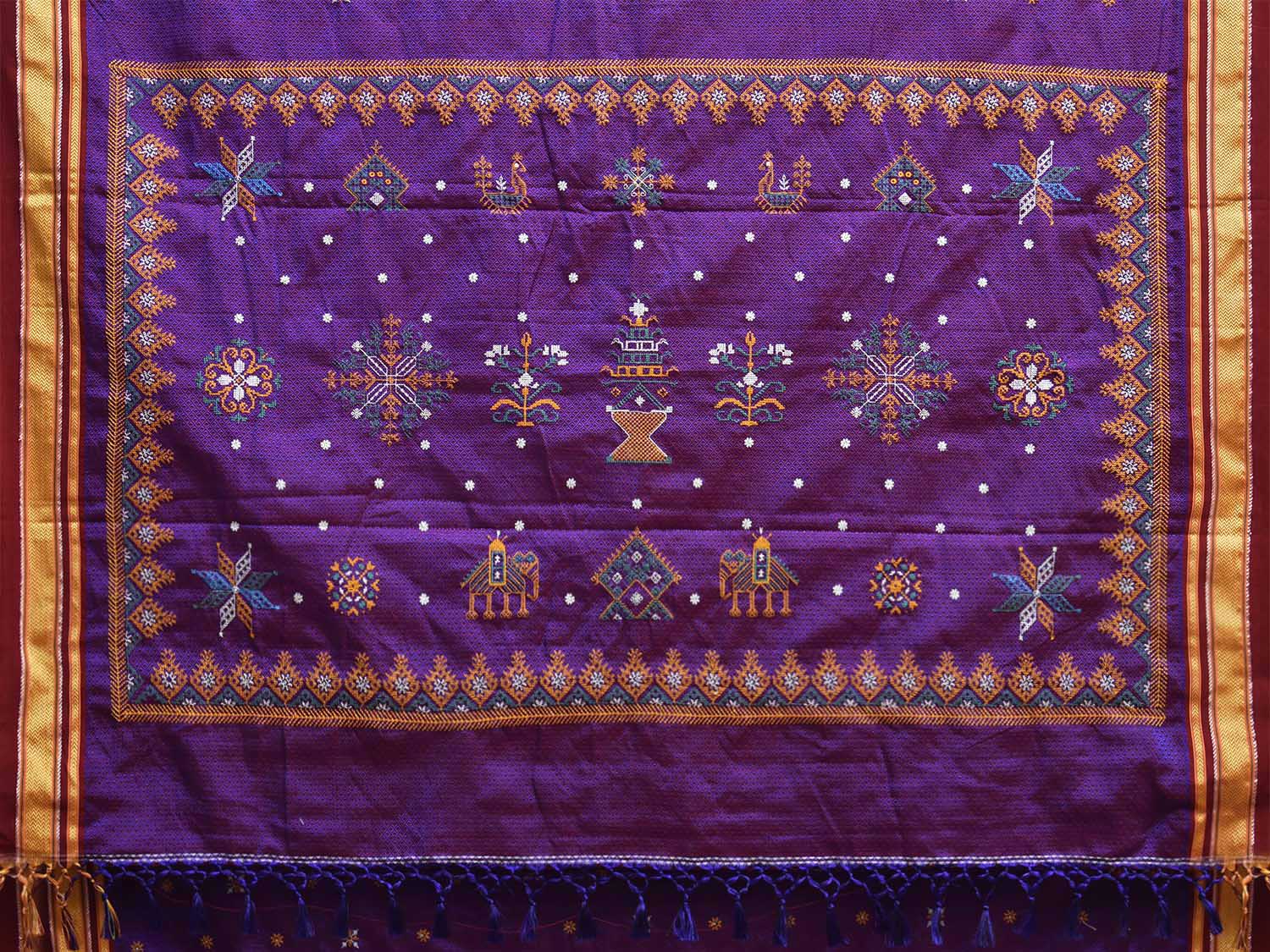 Purple and Maroon ilkal Jacquard Viscose Saree with Kasuti Work Design No Blouse. For fabric care we advise gentle handwash separately. This saree has no blouse.