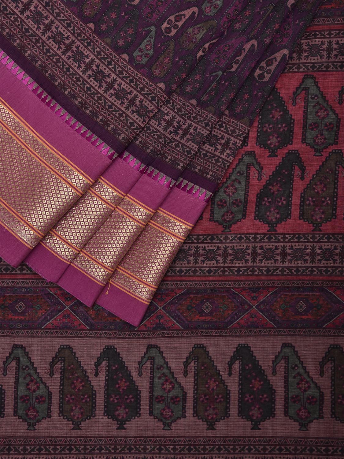 Purple and Pink Bamboo Cotton Saree with Digital Print Design. This is a blend of bamboo and cotton fibers, they have characteristics of both bamboo and cotton combined into one fabric. We Advise Gentle Handwash for Fabric Care.