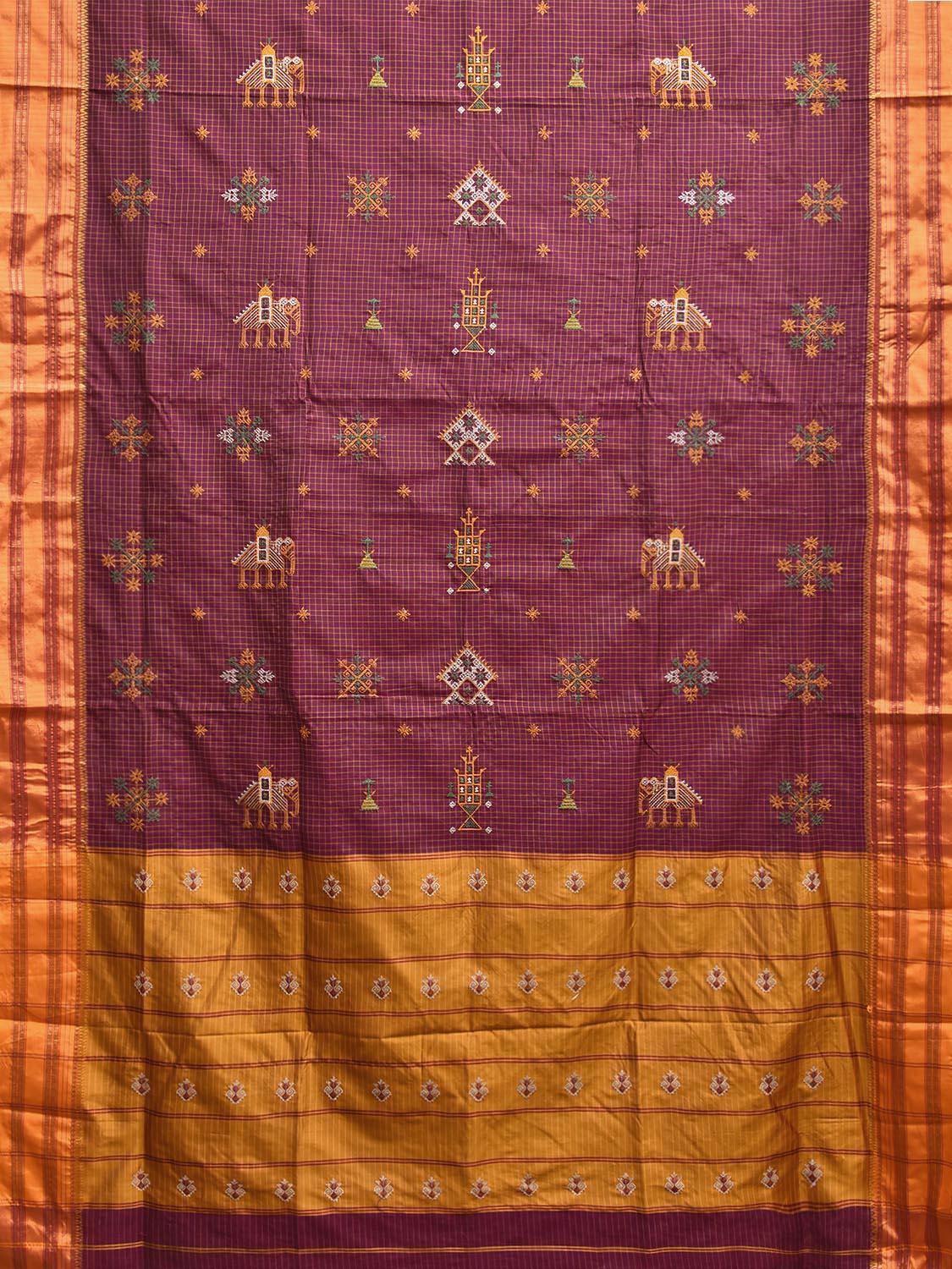 Purple and Yellow Kasuti Cotton Viscose Saree with Elephant Buta and Checks Design. For fabric care we advise gentle handwash separately.