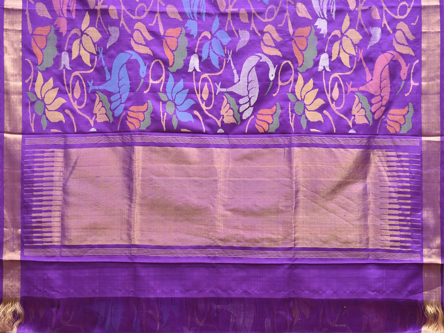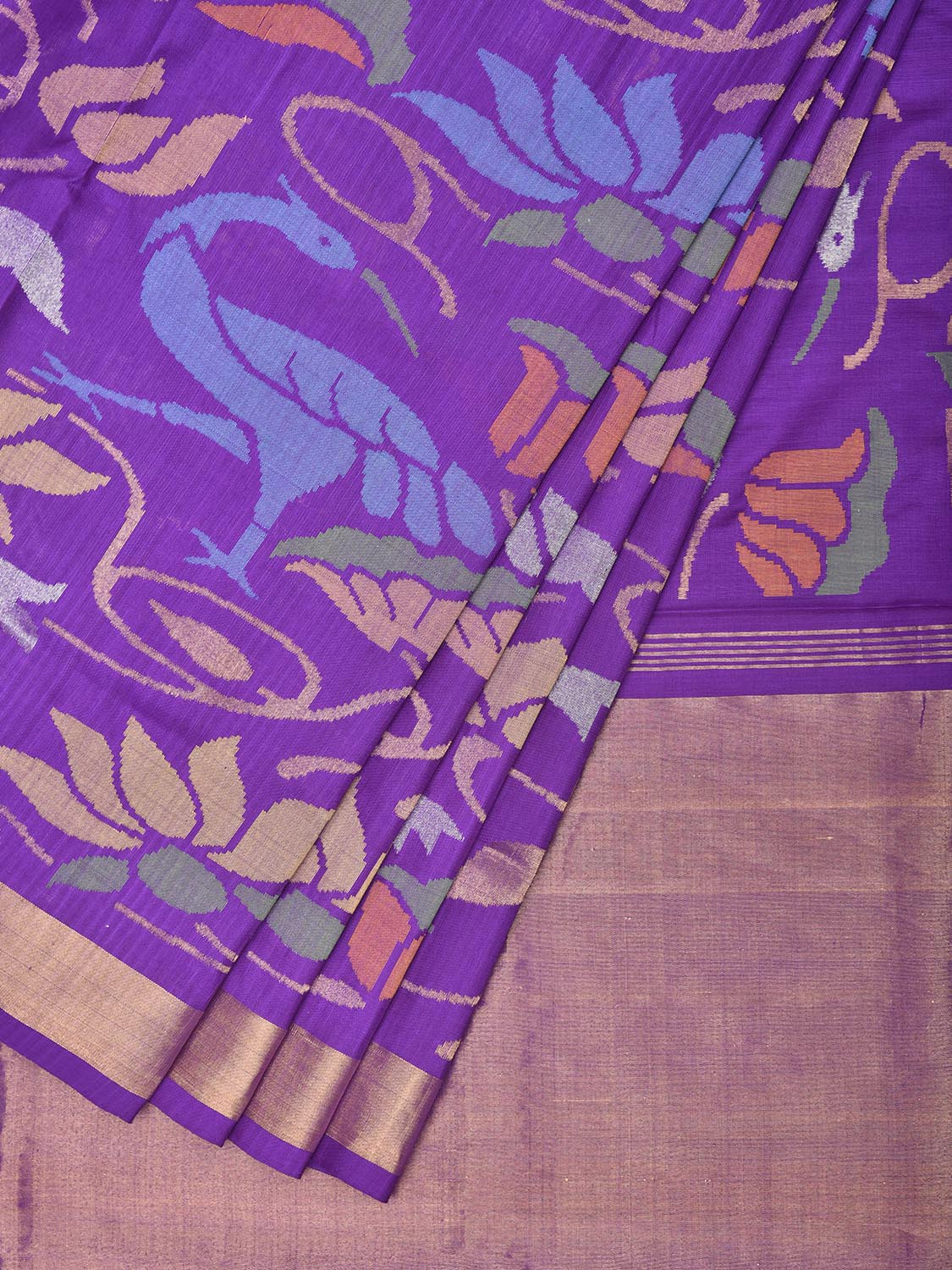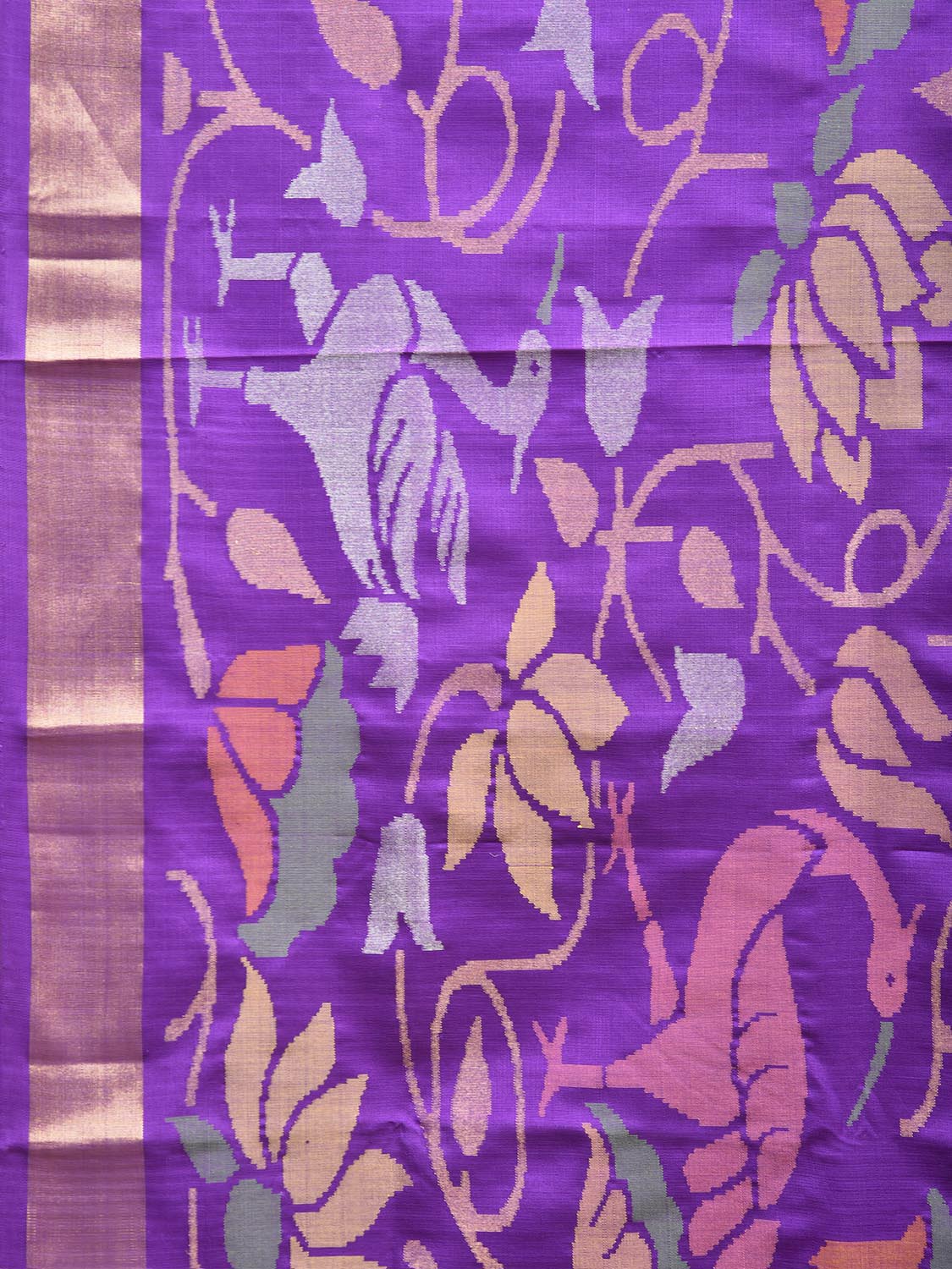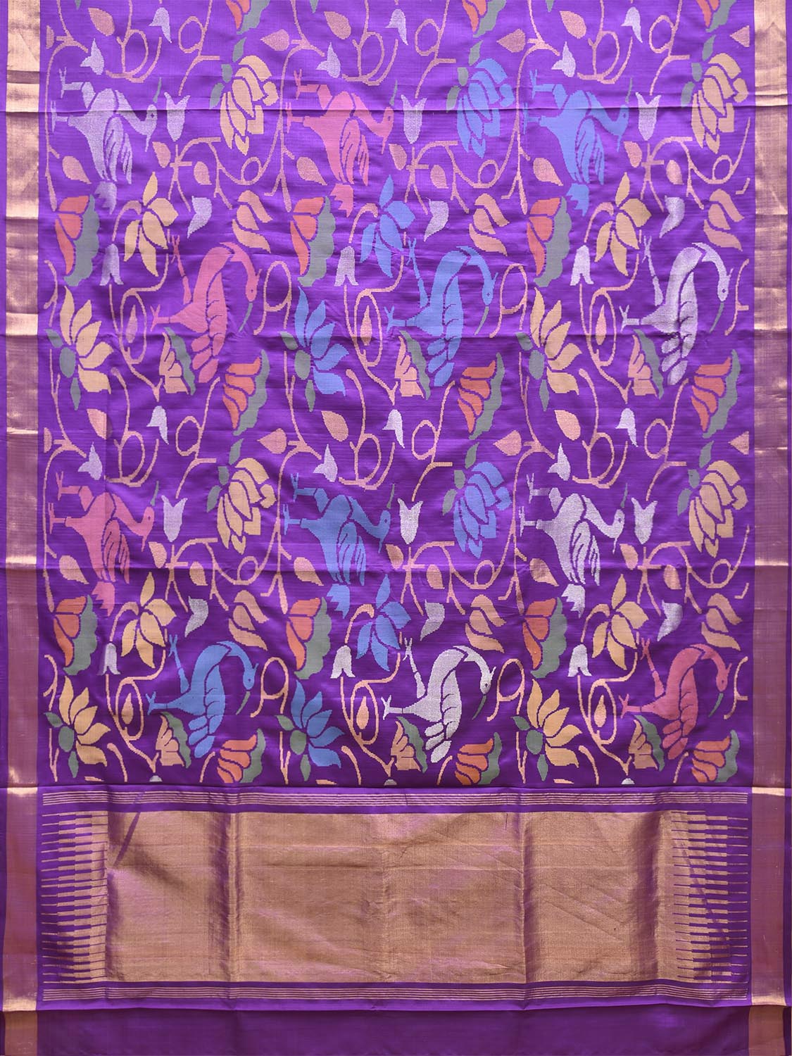 Purple Uppada Pure Silk Handloom Saree with All Over Floral and Birds Design. For fabric care we advise dry clean.