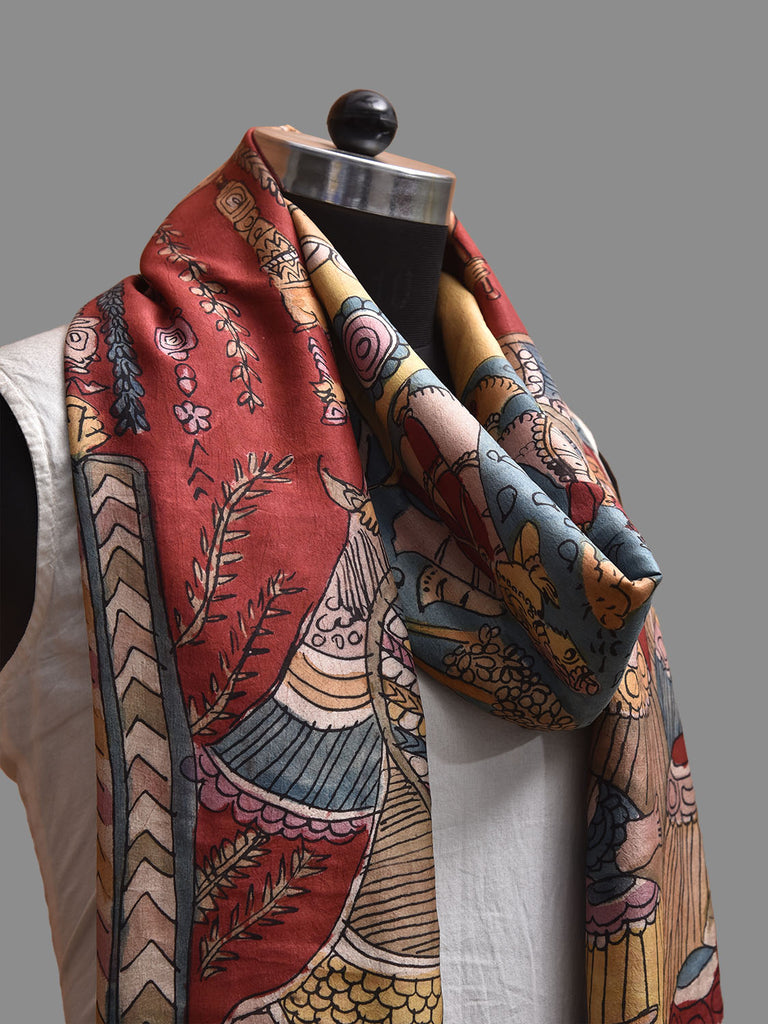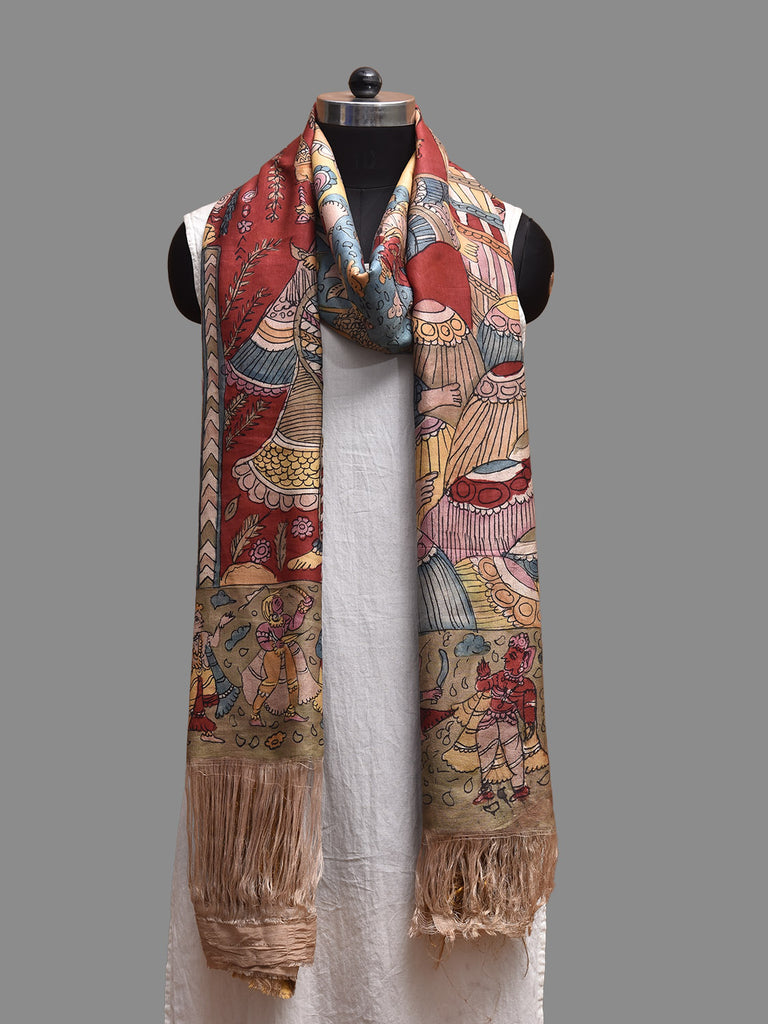 Red and Blue Kalamkari Hand Painted Kanchipuram Silk Dupatta with Durga Mata Design. This hand painted kalamkari is done using natural dyes. As they are natural colors they bleed with initial washes, so we suggest Dry clean.