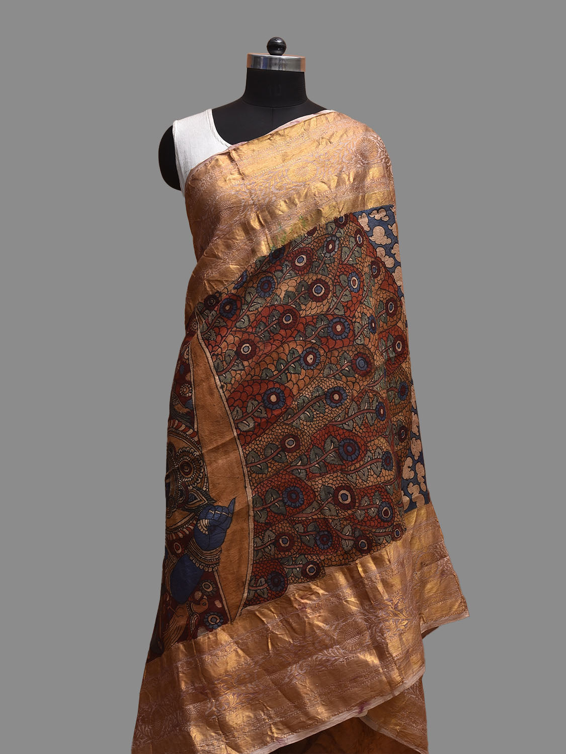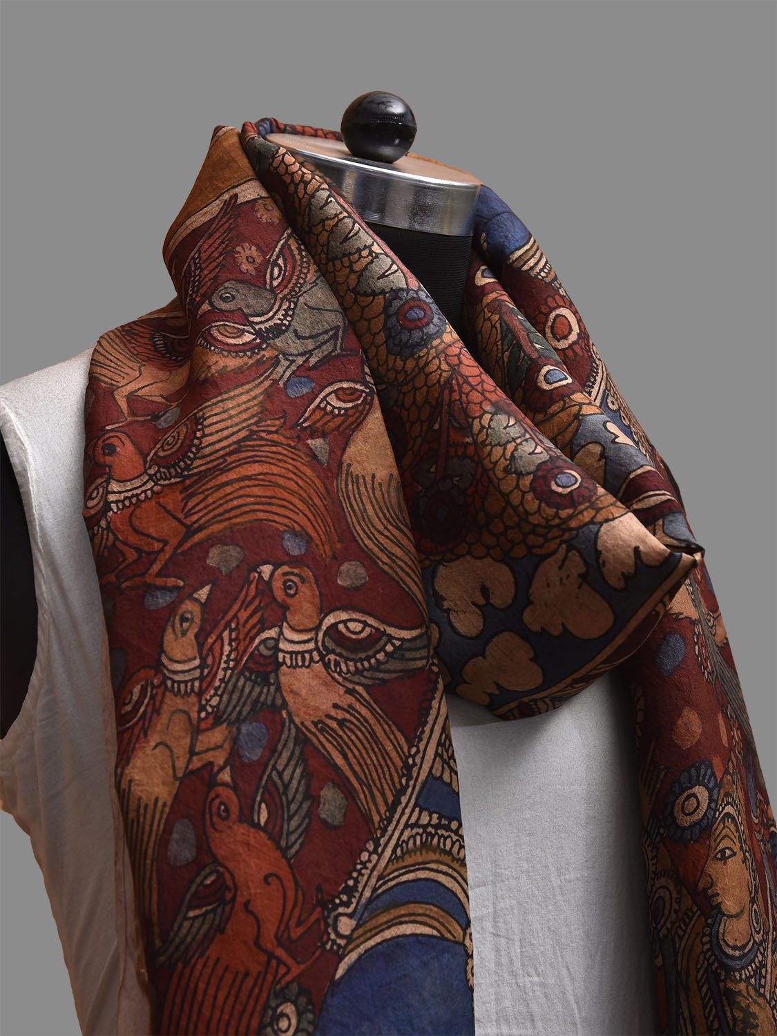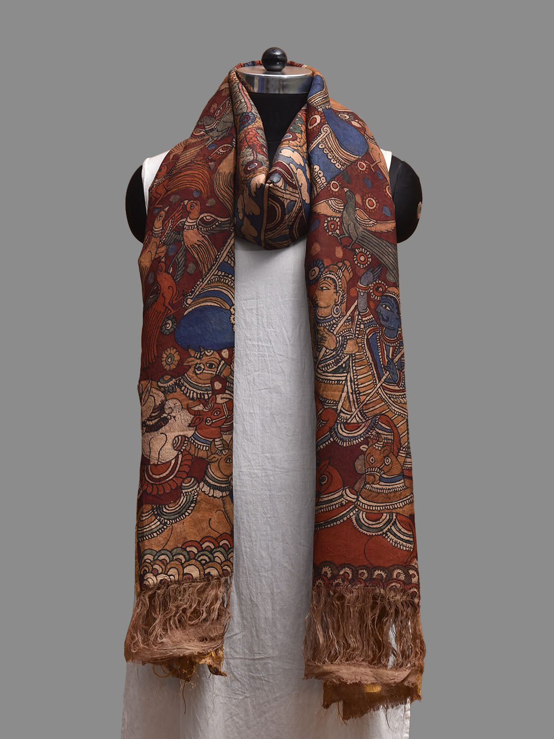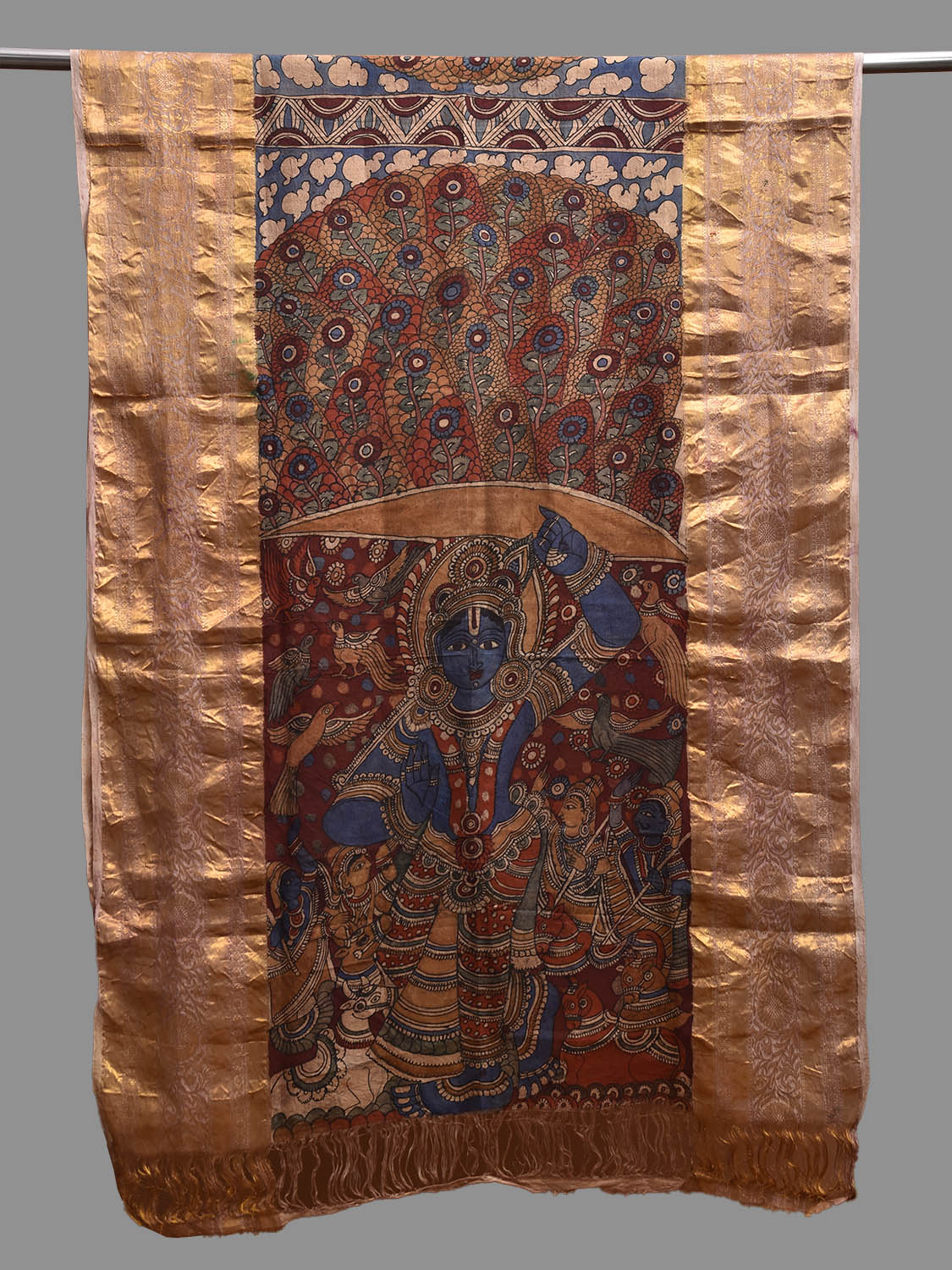 Red and Blue Kalamkari Hand Painted Kanchipuram Silk Dupatta with Krishna Design. This hand painted kalamkari is done using natural dyes. As they are natural colors they bleed with initial washes, so we suggest Dry clean.
