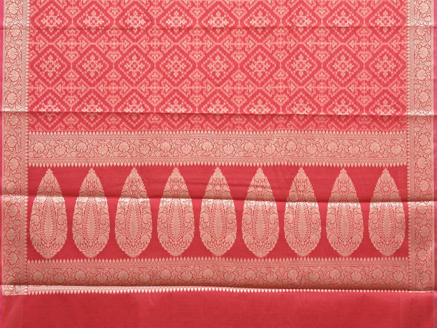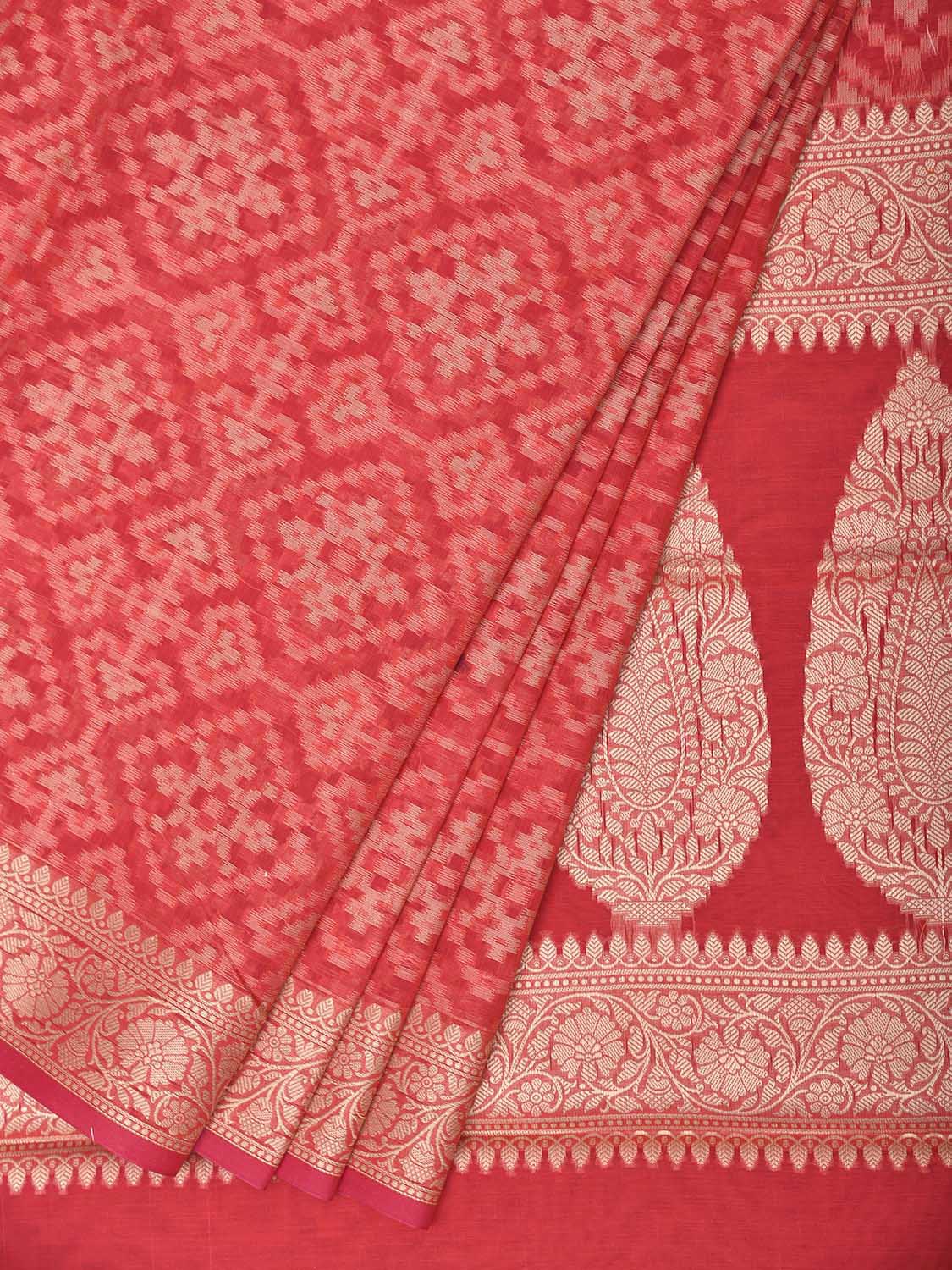 Red and Cream Dhakai Jamdani Cotton Viscose Saree with Grill and Pallu Design. These are some of the traditional Dhakai Jamdani designs, these sarees have geometric designs and sometimes floral or combination of both. We advice gentle handwash separately for fabric care.