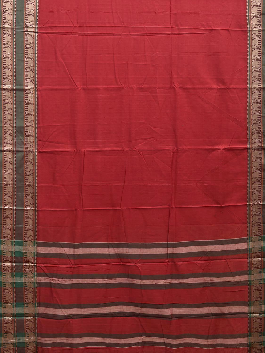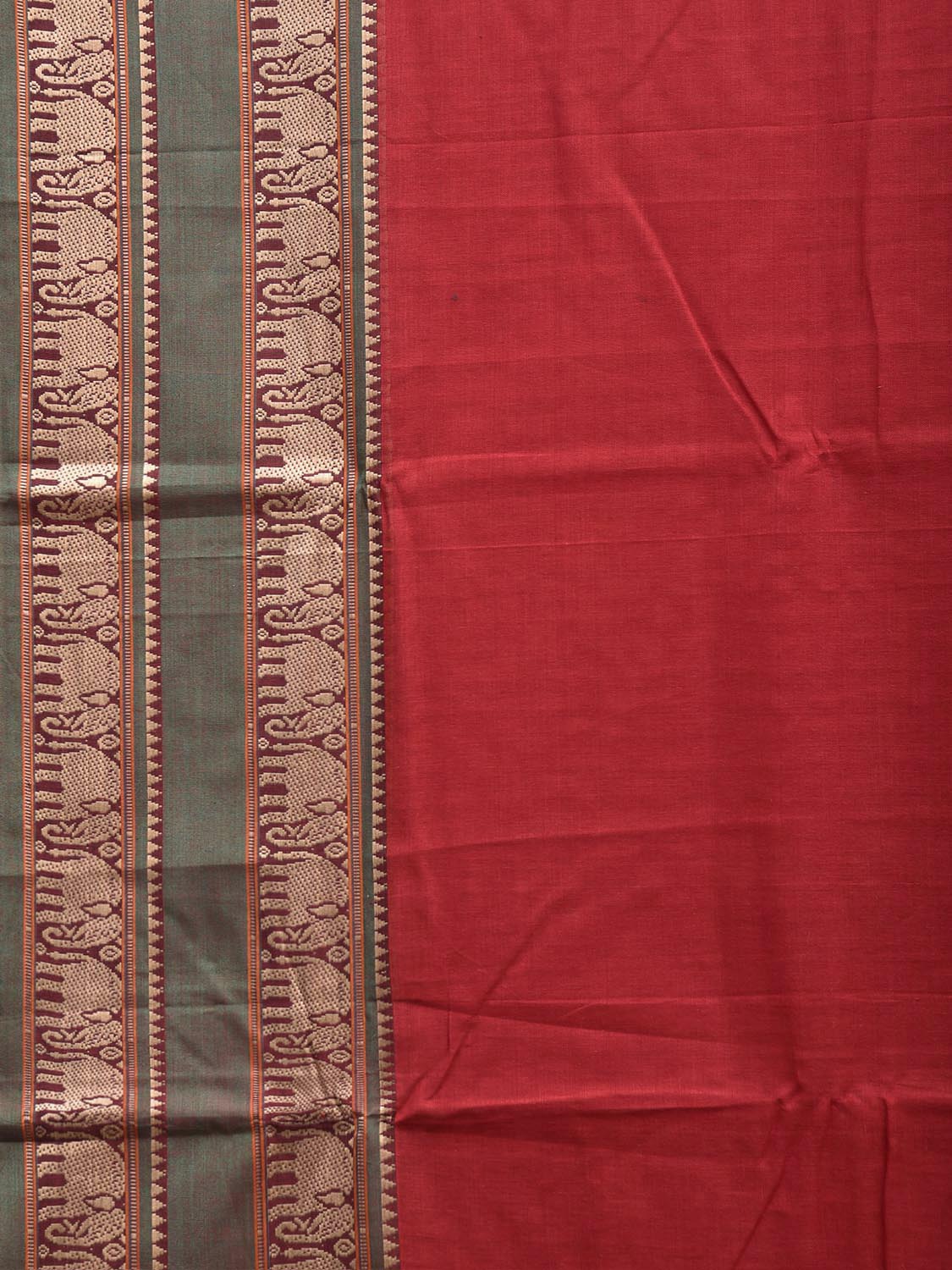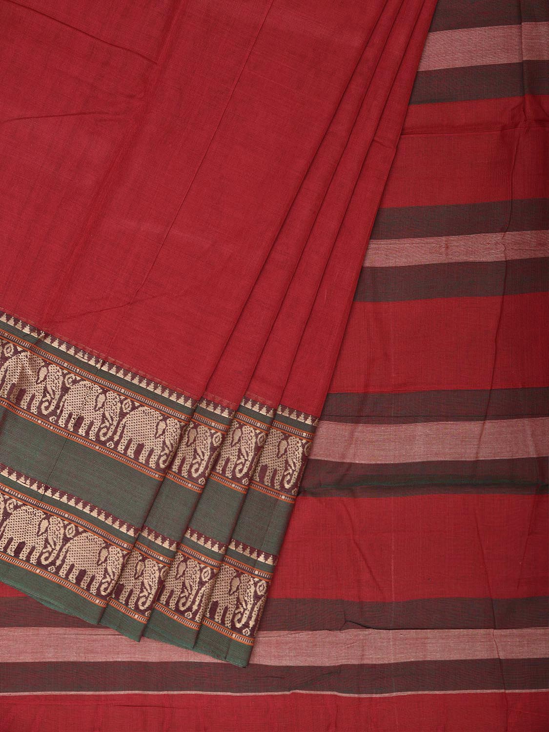 Red and Green Kanchipuram Cotton Plain Saree with Elephant Border Design No Blouse. Traditional South Indian Attire Saree for any Special Occasions. For fabric care we advice dry clean. This saree has no blouse.