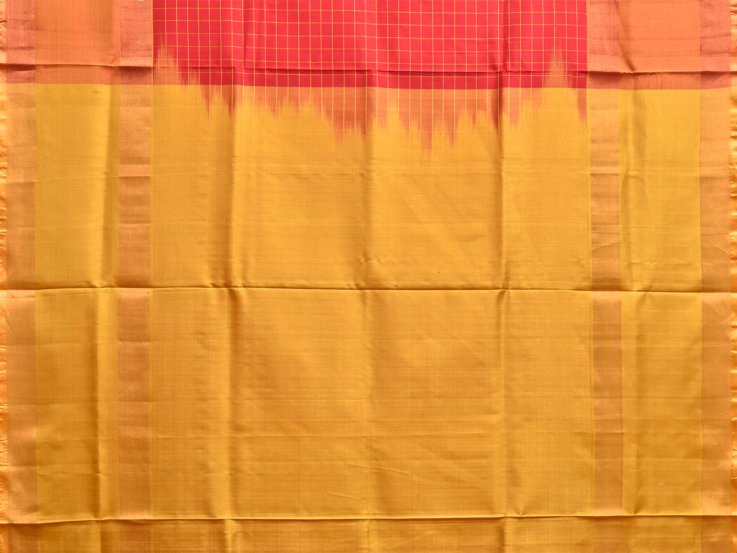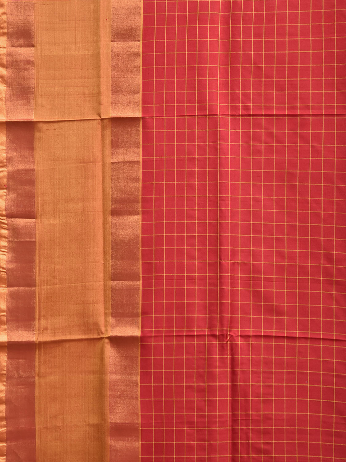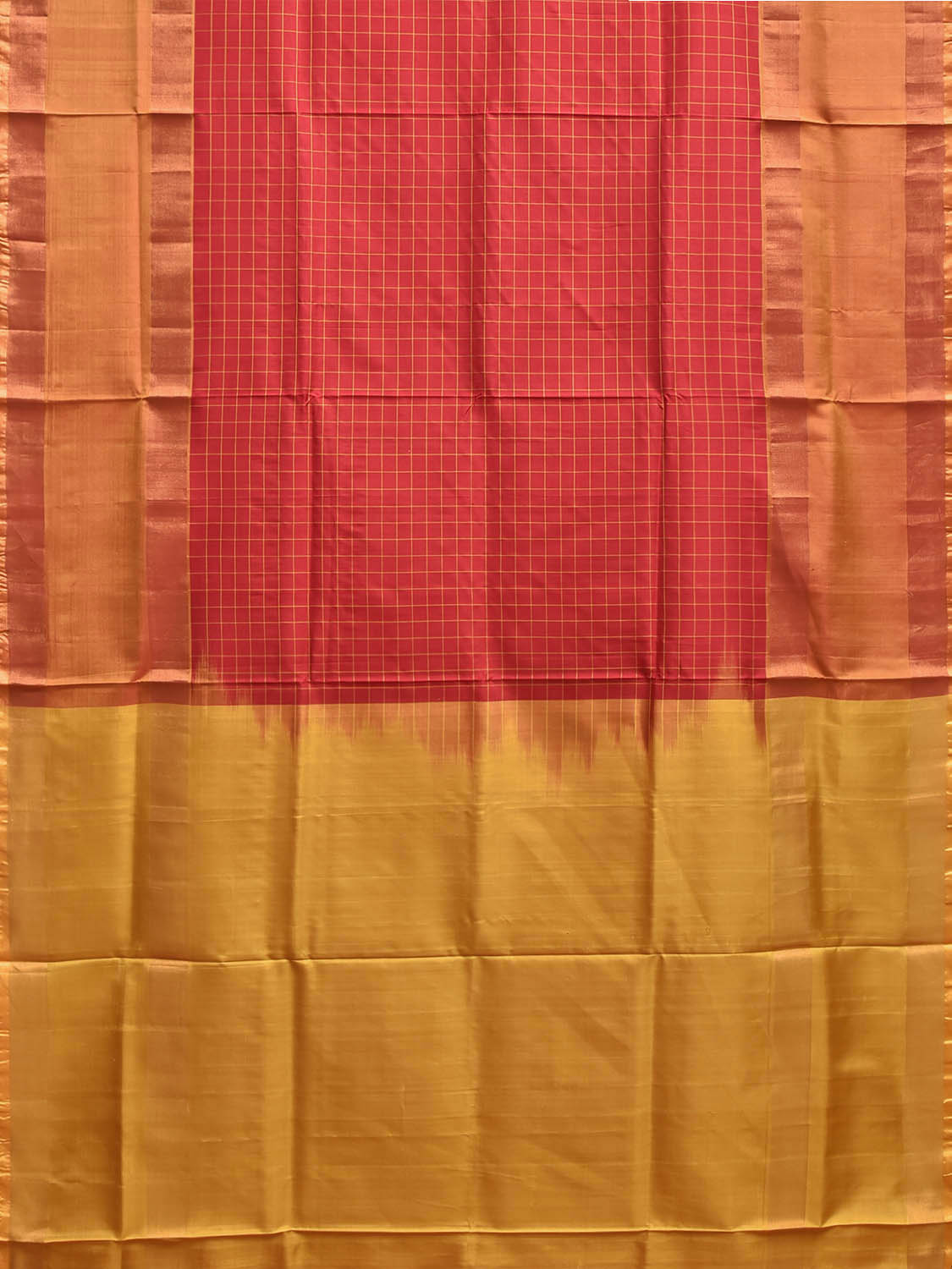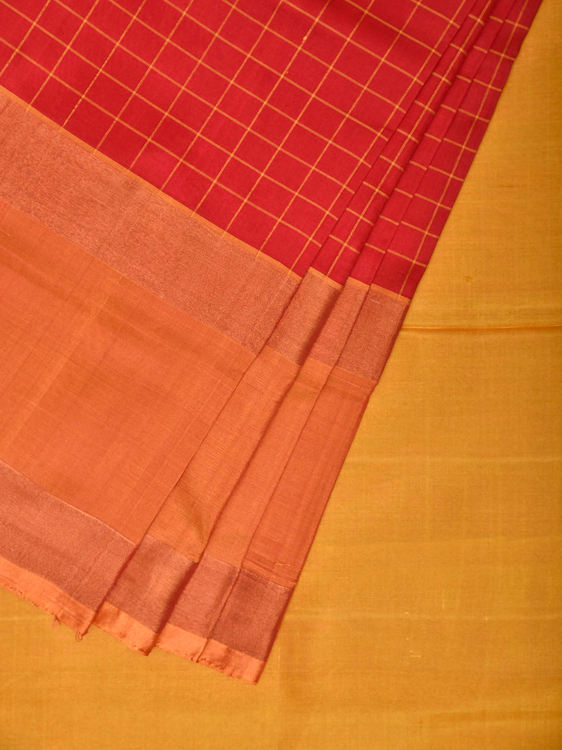 Red and Mustard Uppada Silk Handloom Saree with Checks and Contrast Pallu Design.
