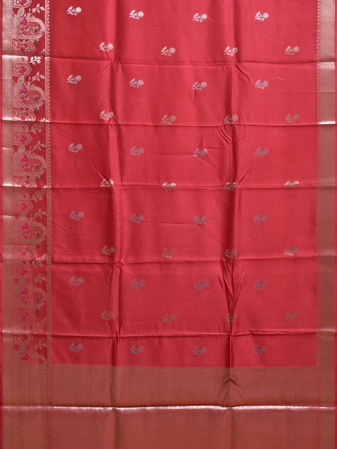Red Banaras Raw Silk Saree with Pallu and One Side Border Design. Banaras Sarees are considered one of finest sarees with gold or silver zari work, and colorful design makes it the saree for various occassions. For fabric care we advise dry clean.