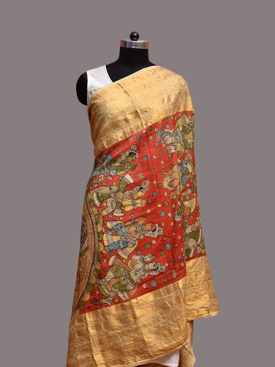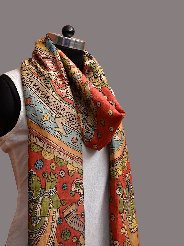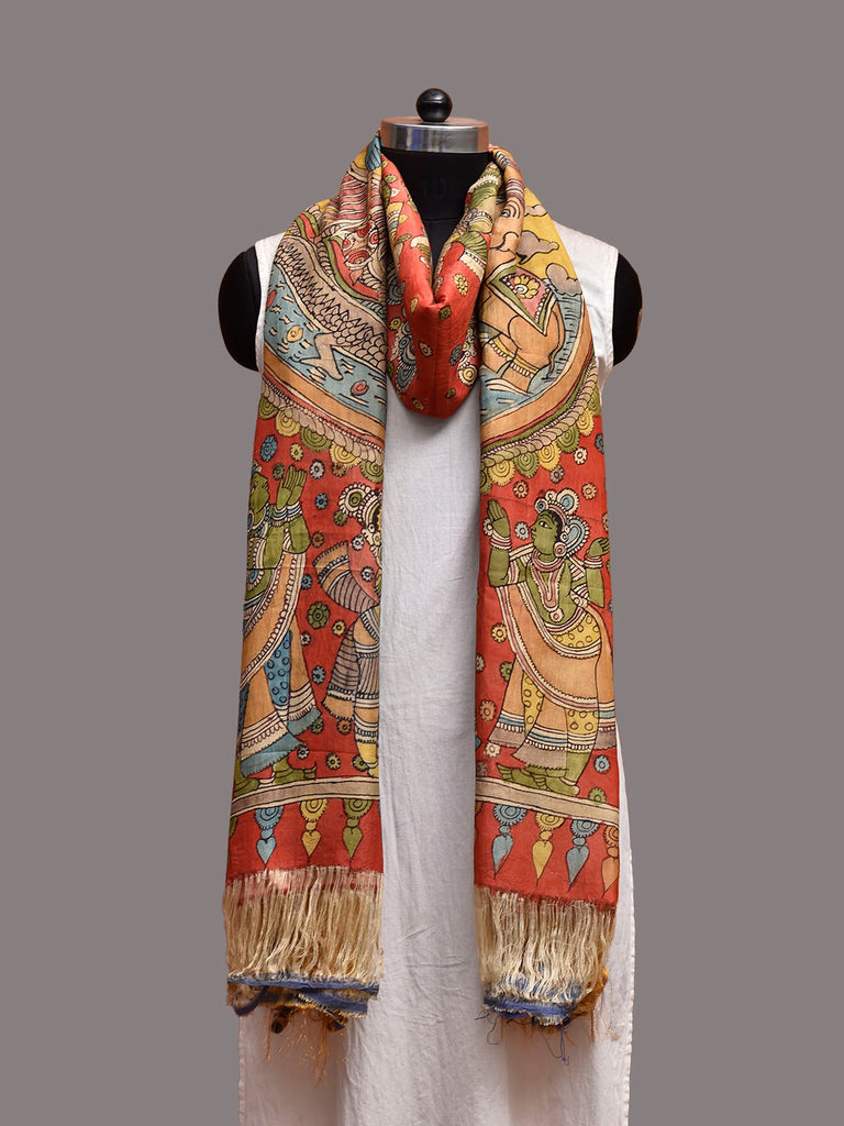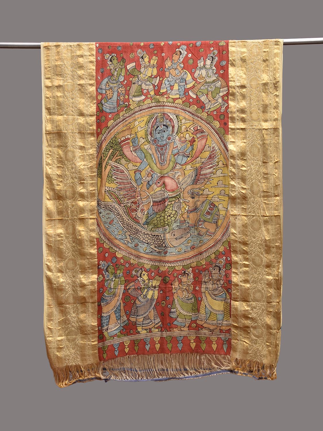 Red Kalamkari Hand Painted Kanchipuram Silk Dupatta with Krishna Design. This hand painted kalamkari is done using natural dyes. As they are natural colors they bleed with initial washes, so we suggest Dry clean.